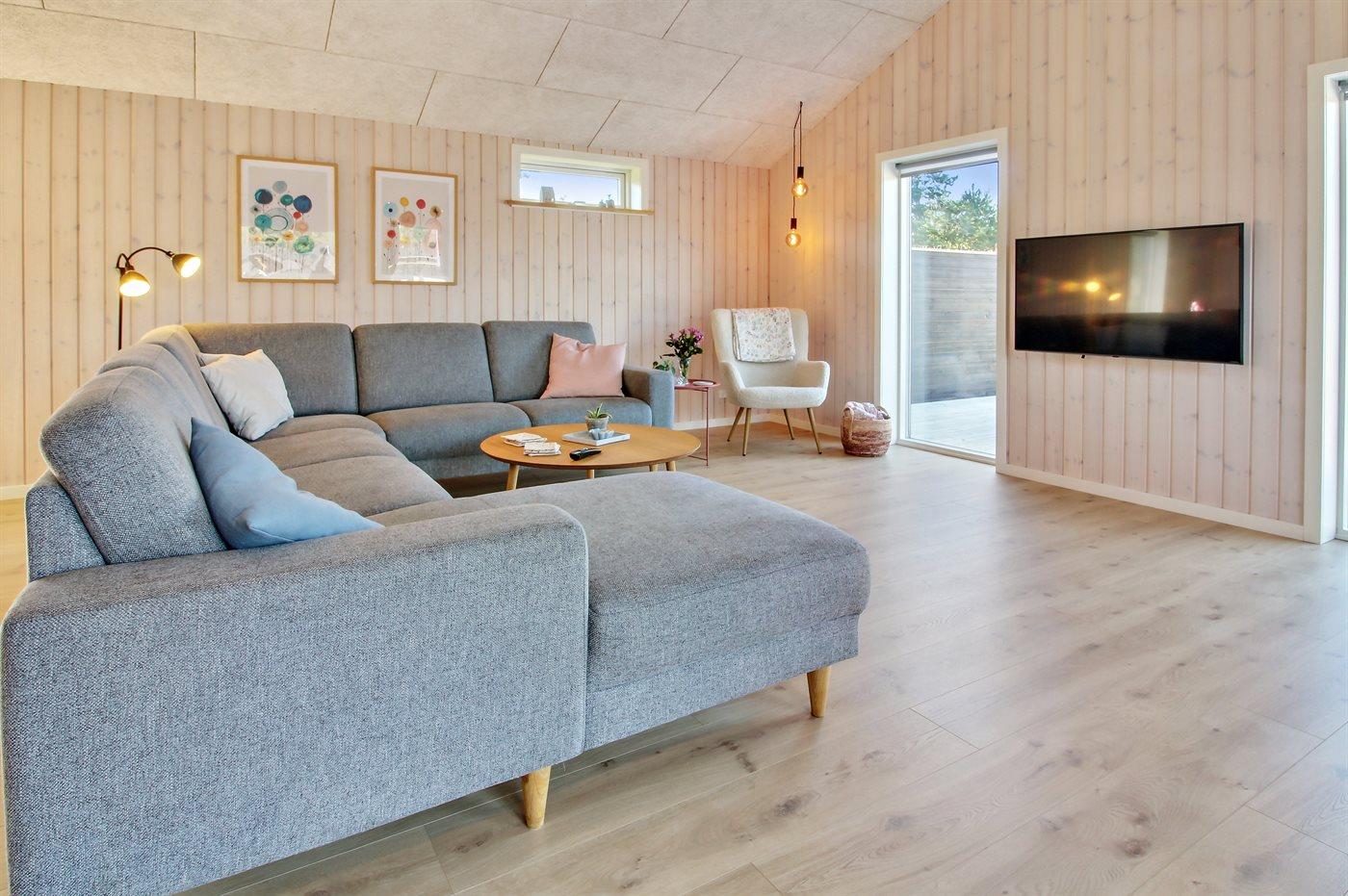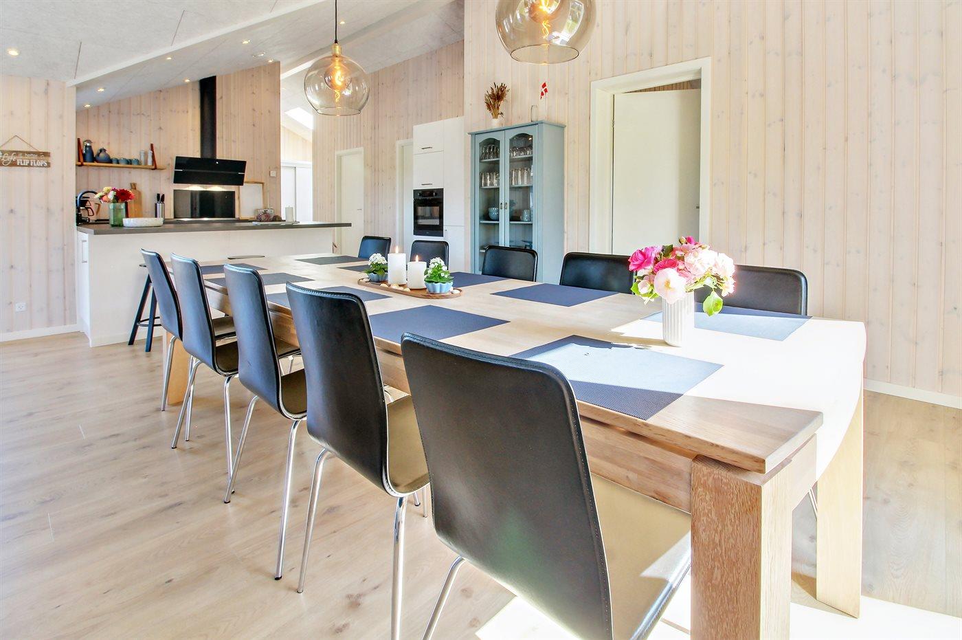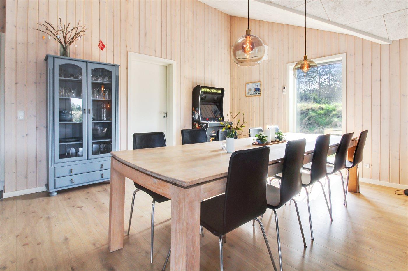 Et flot sommerhus til 10 personer med 5 gode soveværelser og stort disponibelt rum, hvor man kan finde poolbord, bordtennis og arkadespil mm. Fra den dejlige opholdsstue er der direkte adgang til terrassen, hvor der er god plads til hygge samt et vildmarksbad til ren afslapning.