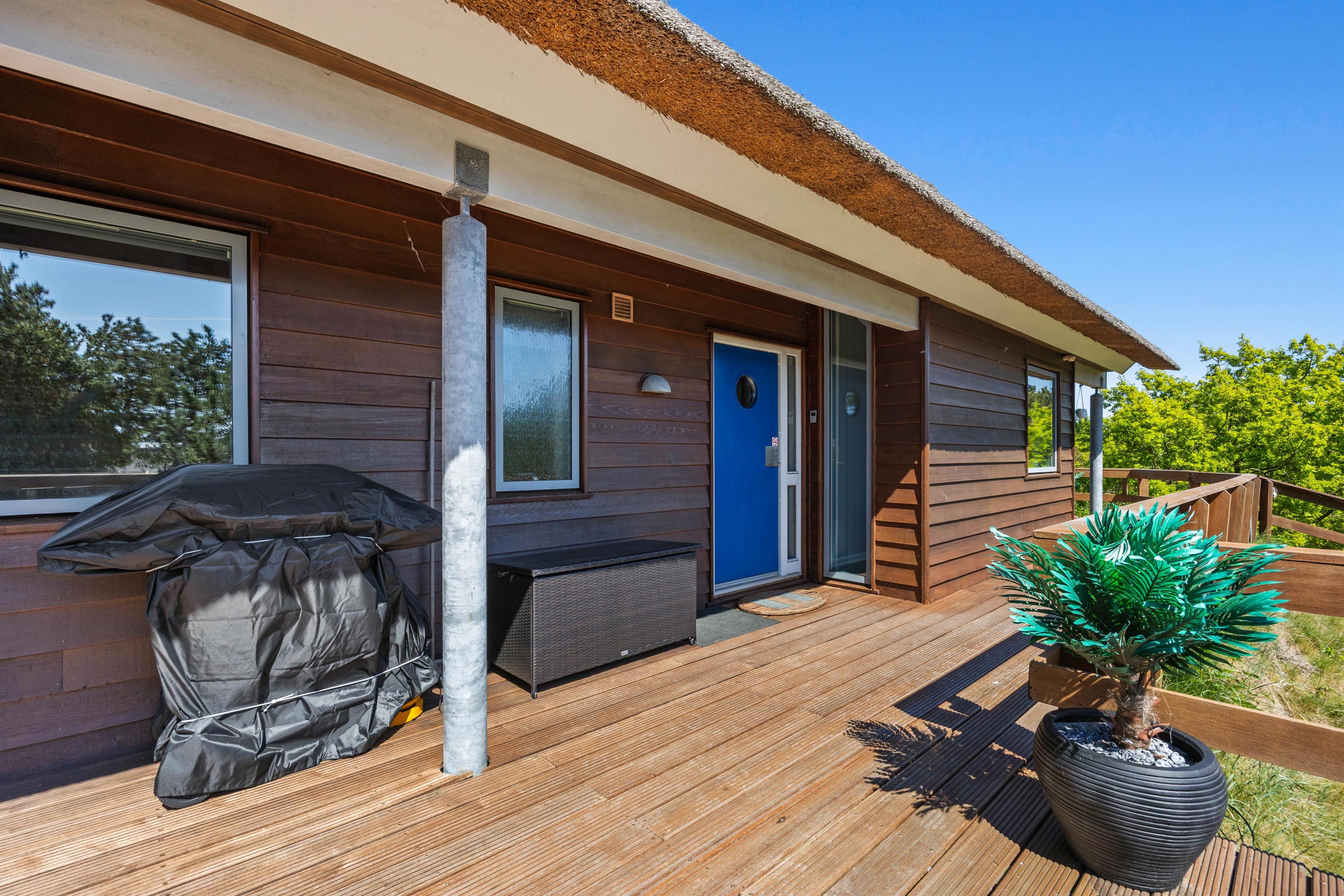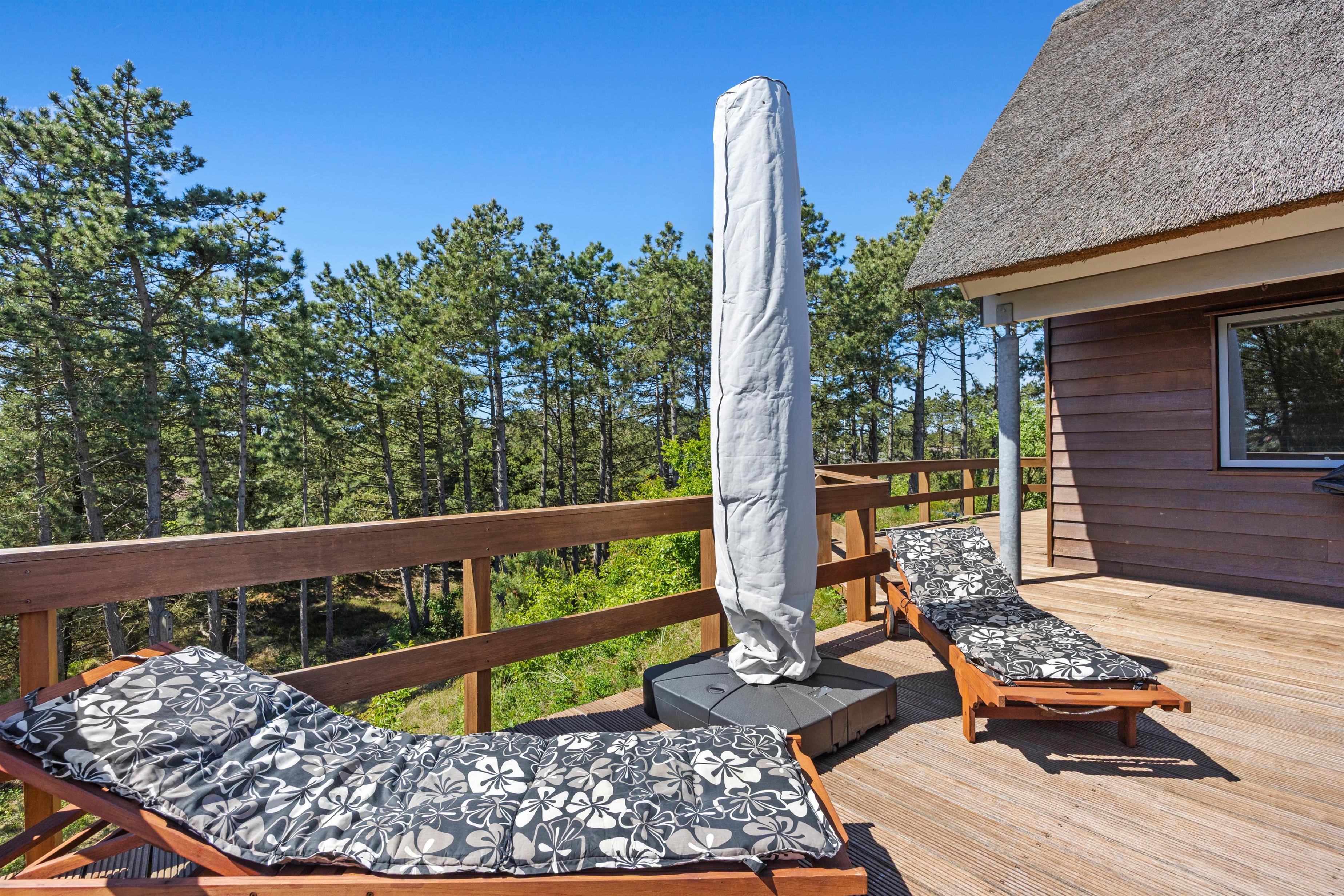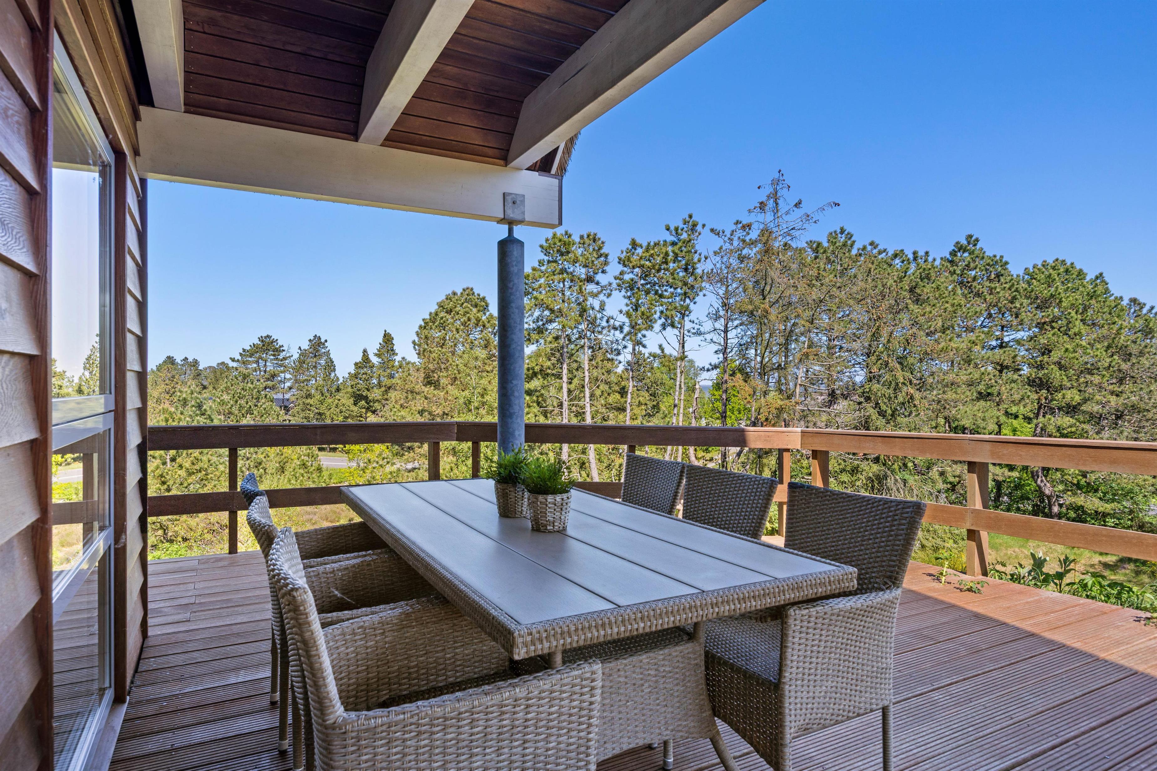 Balkonen er dejligt sted, hvor I kan nyde morgenkaffen og fuglenes sang. Med feriehusets rolige beliggenheden mellem træer, kan I solbade, holde grillaftner og bare være jer! Omkring sommerhuset er nemlig en dejlig terrasse, hvor havemøblerne venter på jer! På grunden kan man sommetider endda være så heldige at se rådyr helt tæt på!