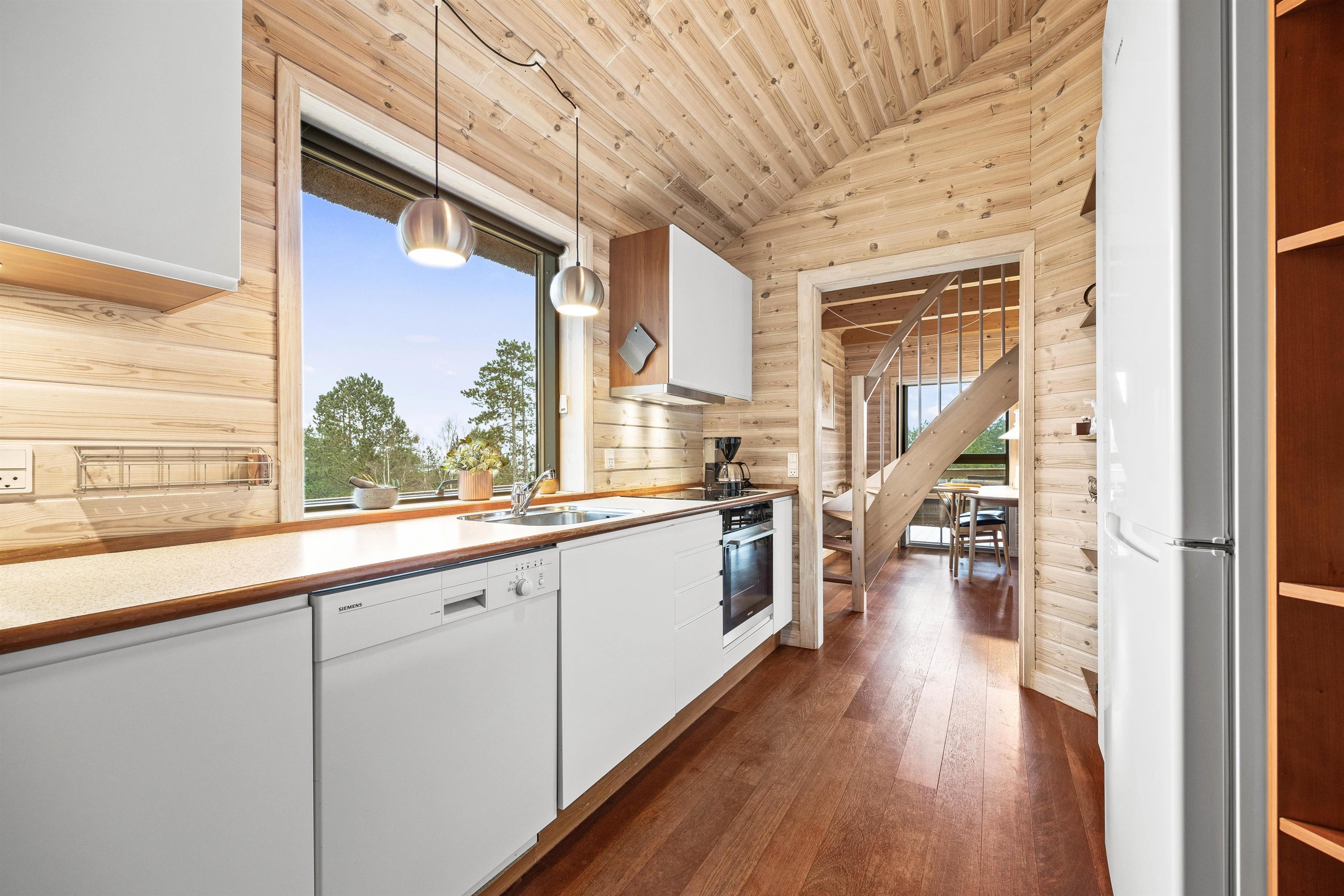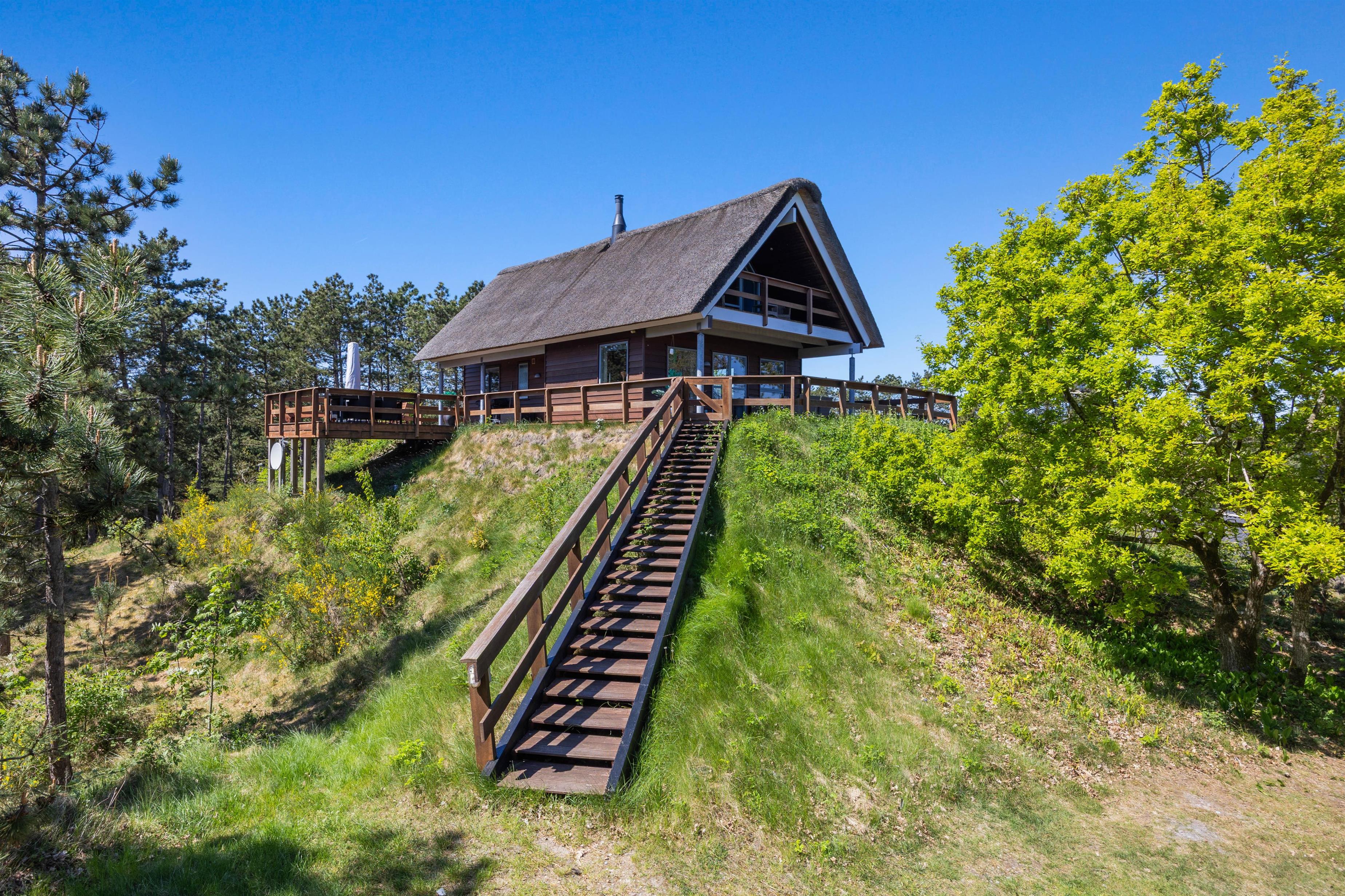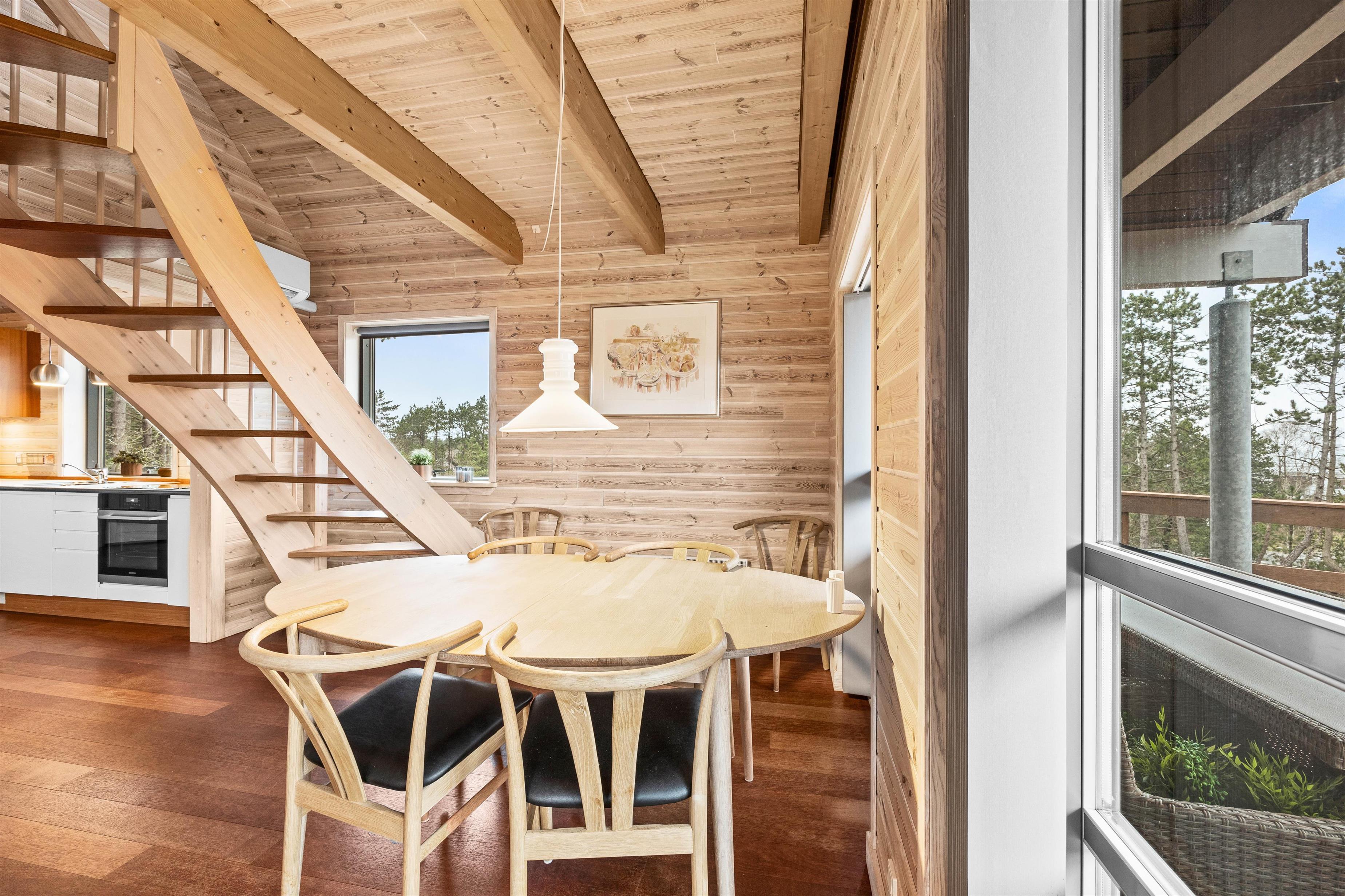 Når I har parkeret bilen nedenfor, vil en trappe fører jer op til feriehuset, som ligger øverst på bakketoppen. Herfra har I en fantastisk udsigt udover den smukke natur. Naturlige materialer, særligt træ, kommer også til sin ret inde i det lyse feriehus. Her er den rette rolige atmosfære.