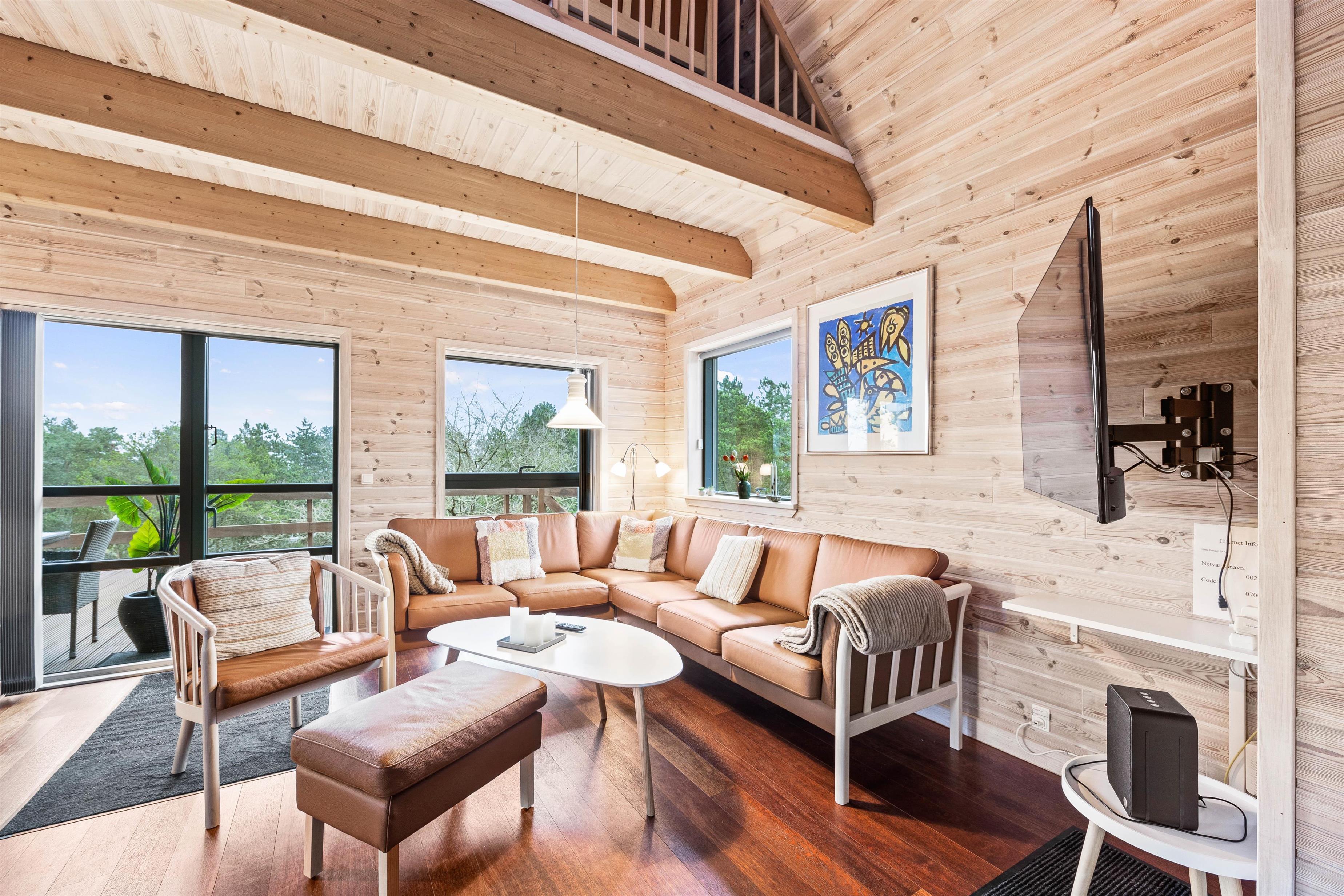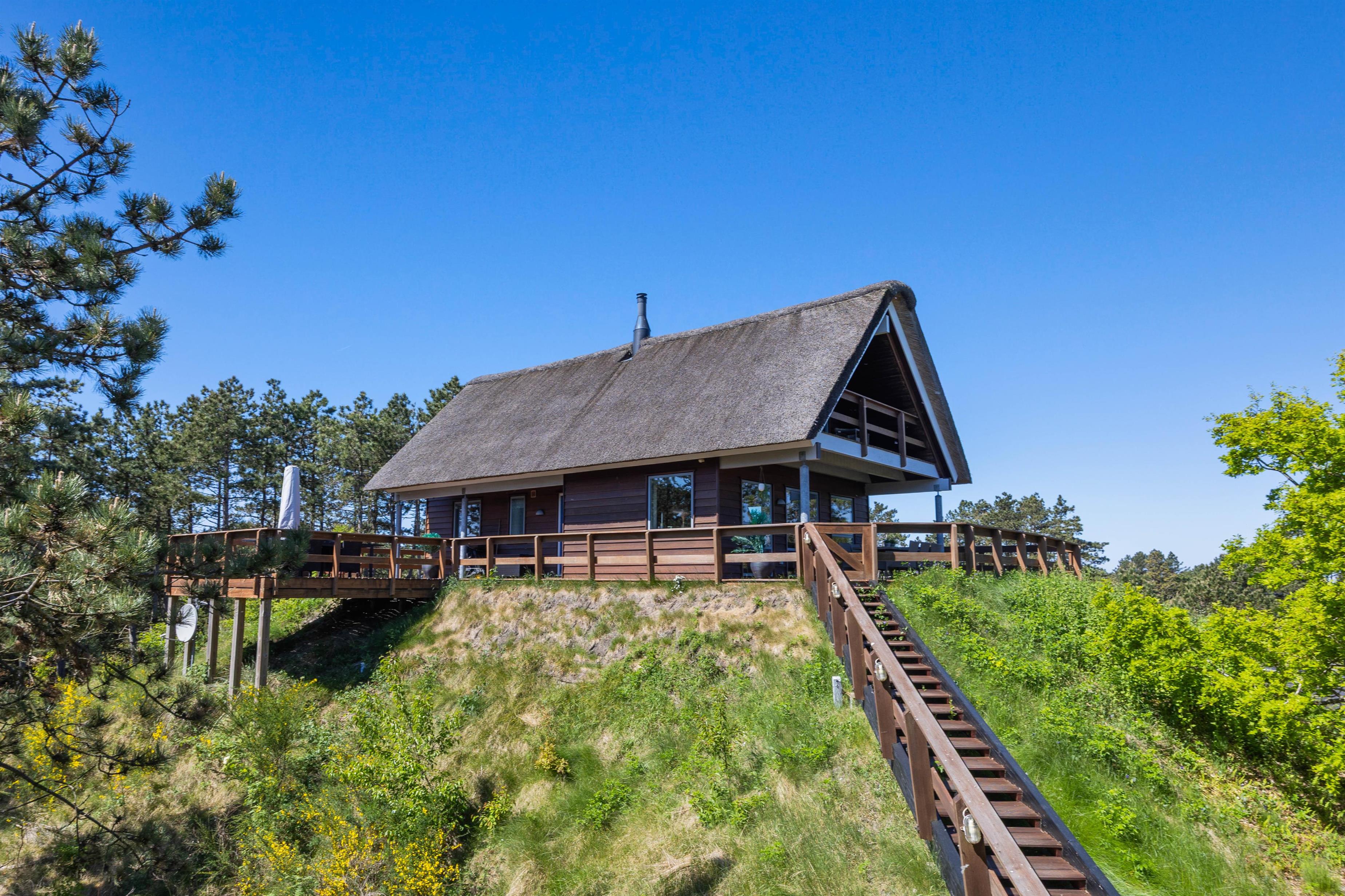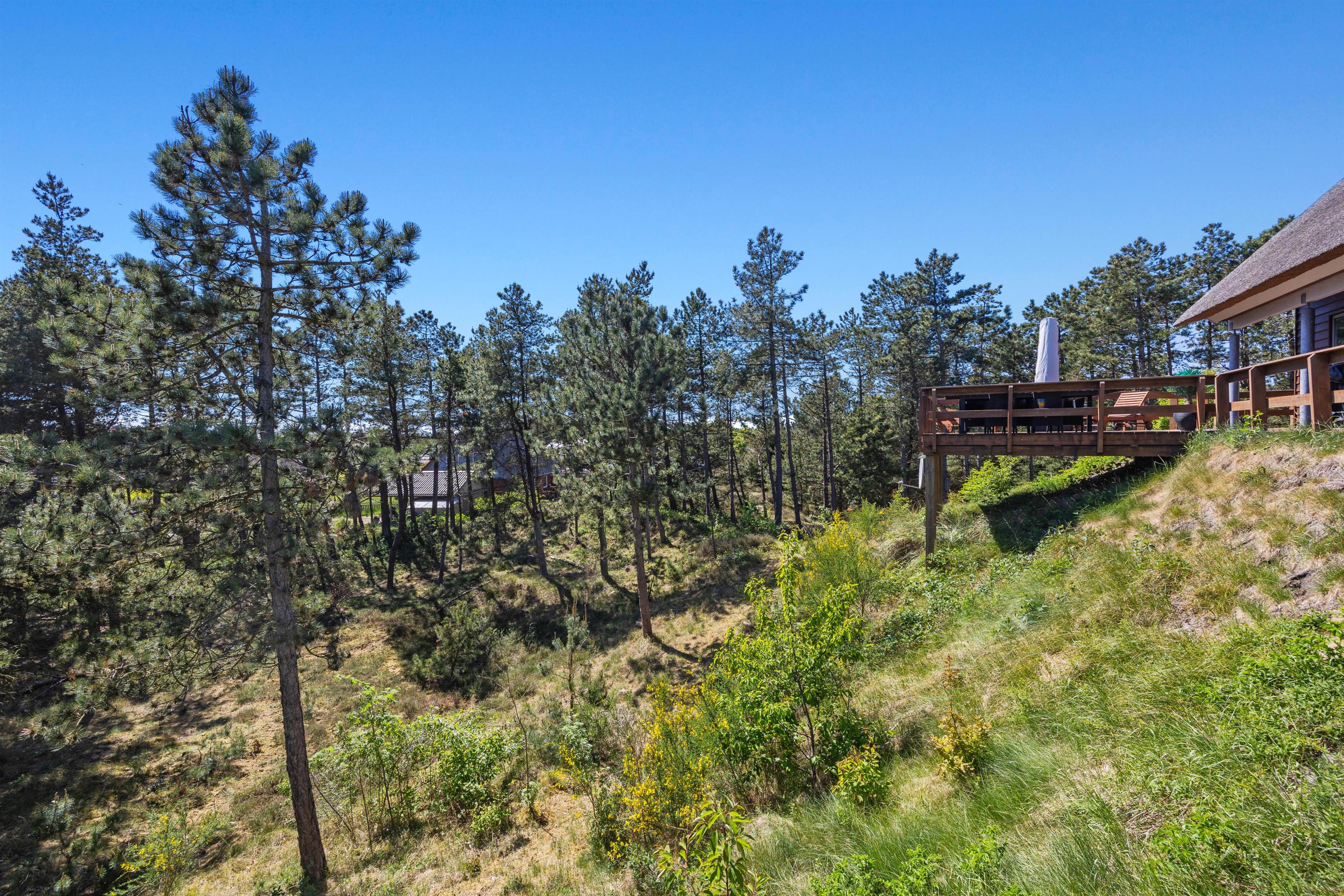 Når I har parkeret bilen nedenfor, vil en trappe fører jer op til feriehuset, som ligger øverst på bakketoppen. Herfra har I en fantastisk udsigt udover den smukke natur. Naturlige materialer, særligt træ, kommer også til sin ret inde i det lyse feriehus. Her er den rette rolige atmosfære.