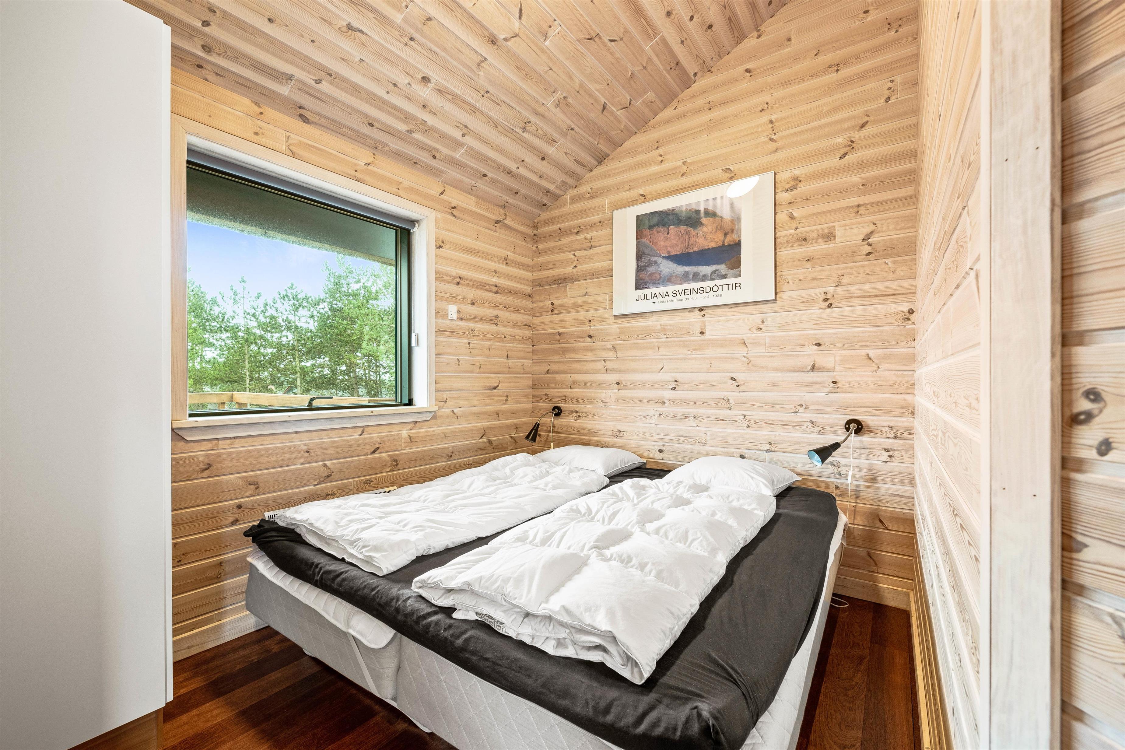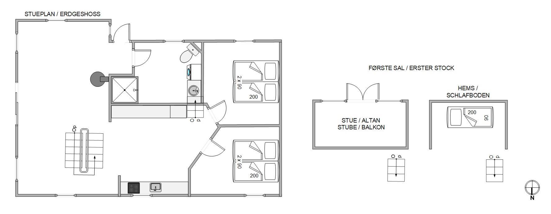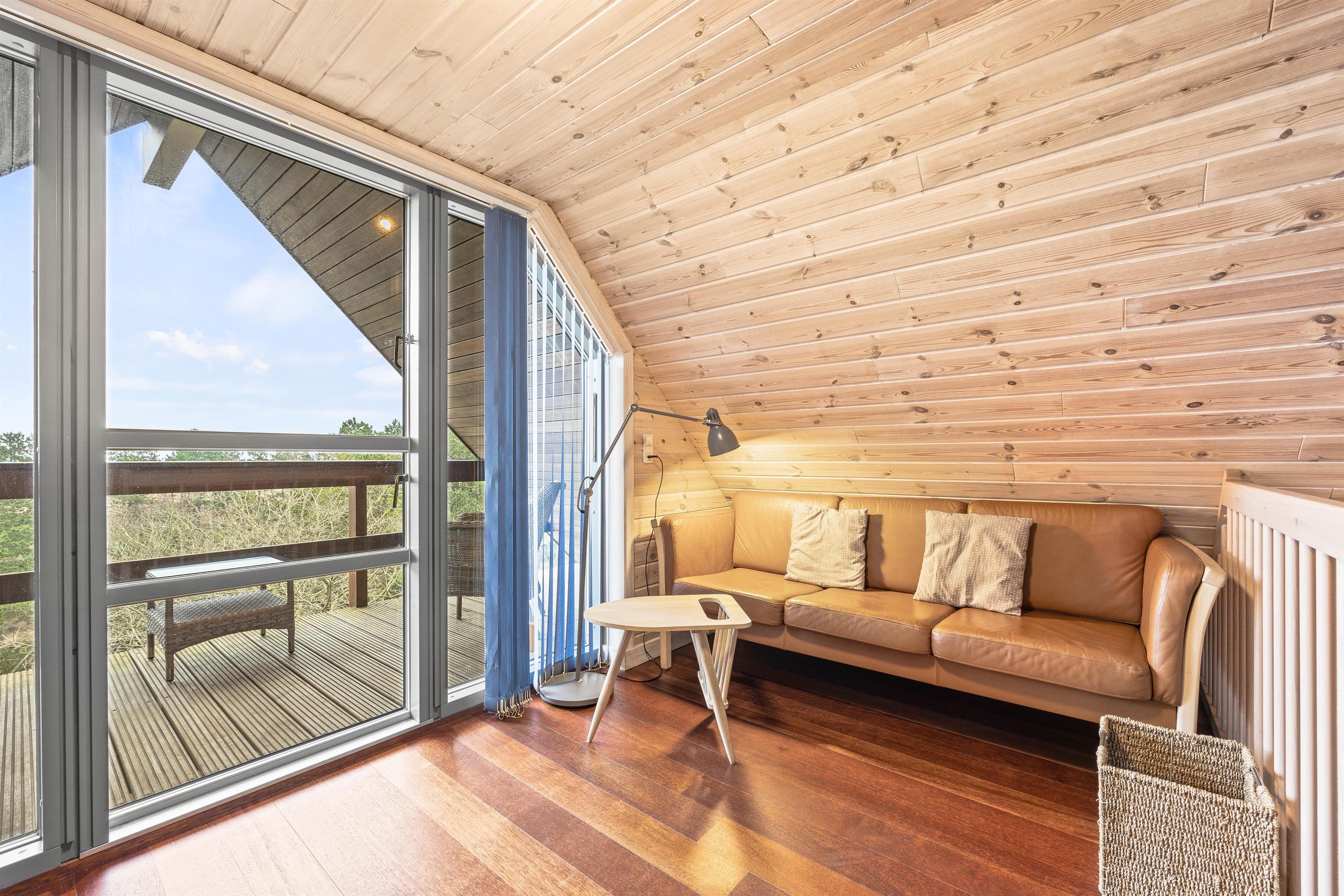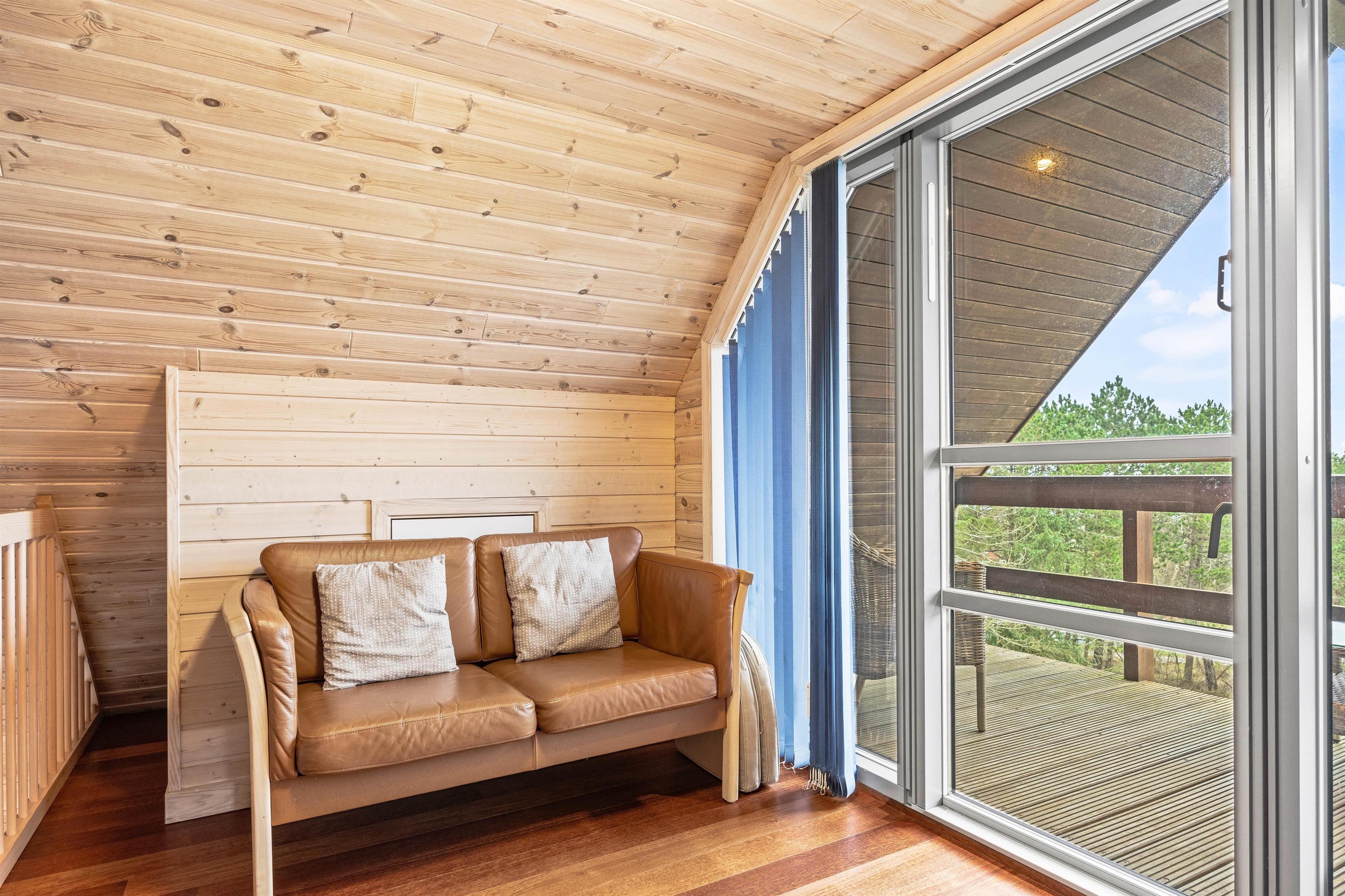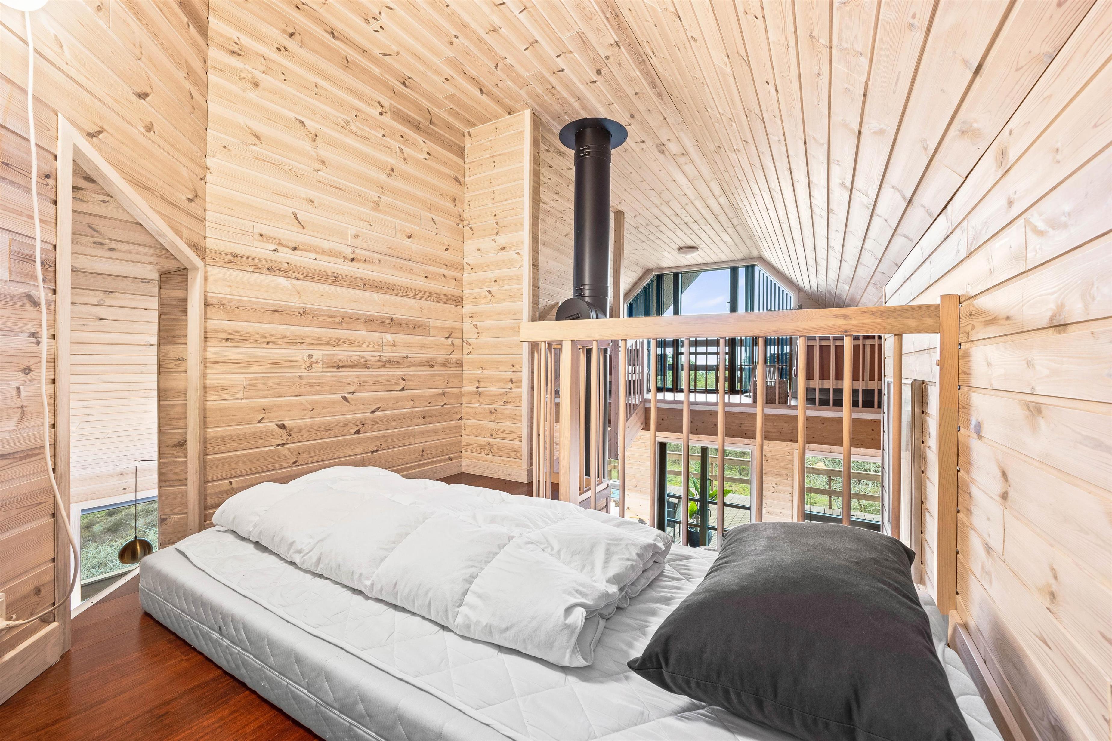 I stuetagen finder I et fint badeværelse med vaskemaskine, to gode soveværelser samt et dejligt alrum, der er i åben forbindelse med det funktionelle køkken. I køkkenet bliver madlavningen til en leg, især når opvaskemaskinen klarer den kedelig opvask og giver jer mere tid til at være sammen. I stuen kan I sætte jer godt til rette i sofaarrangementet og spille spil, strikke eller læse en krimi. På de køligere dage kan I både gøre brug af den energibesparende varmepumpe og brændeovnen, der slår et ekstra slag for hyggen. Trappen i stuen giver jer adgang til hemsen. Her finder i den femte soveplads samt en ekstra lille stue med adgang til feriehusets balkon.