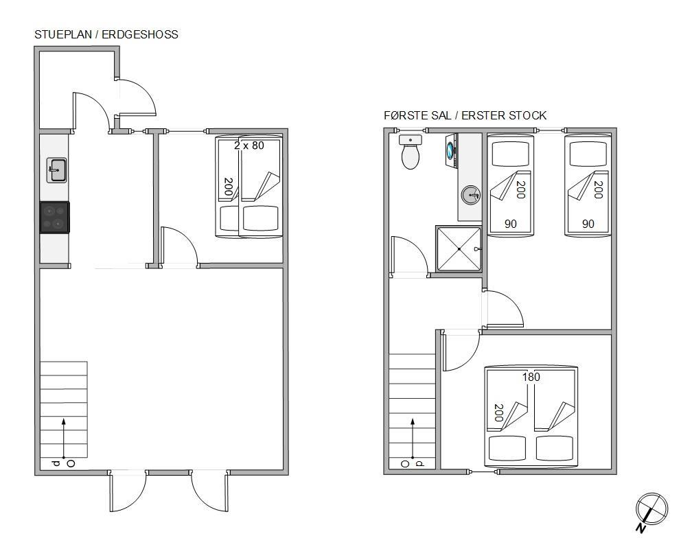 På første sal finder du to komfortable soveværelser. Det ene soveværelse er indrettet med en dobbeltseng, der sikrer en god nattesøvn. Det andet soveværelse har to enkeltsenge,begge værelser er smagfuldt indrettet og tilbyder privatliv og ro. På første sal er der også et moderne badeværelse med en rummelig brusekabine og en praktisk vaskemaskine. Her kan du friske dig op efter en lang dag eller vaske tøj, hvis det er nødvendigt.