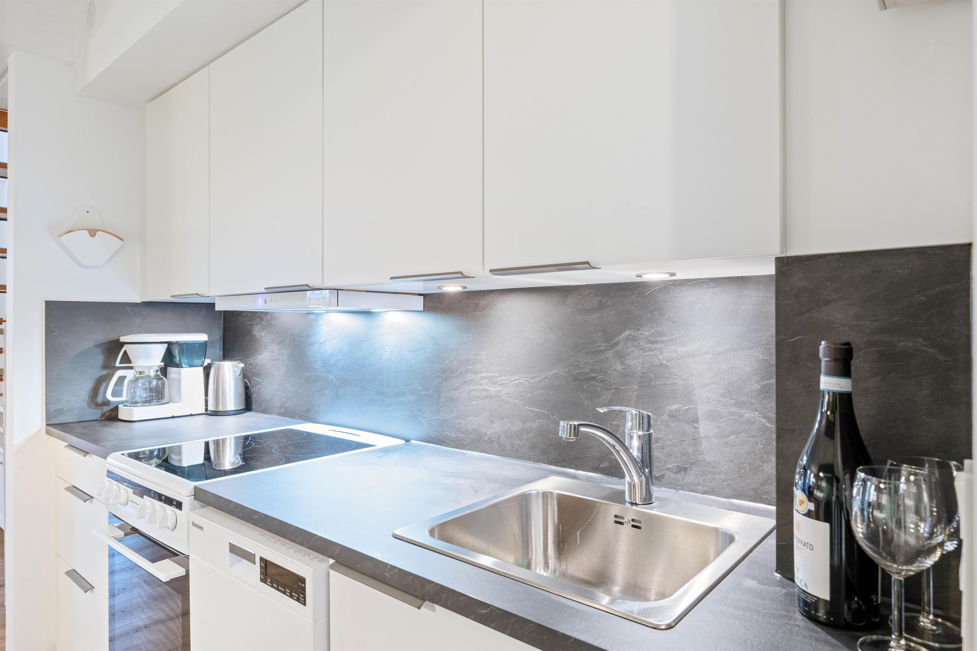 Boligarealet fordeler sig på 2 plan. Ved ankomst bliver du mødt af et moderne køkken, der er fuldt udstyret med en opvaskemaskine, mikroovn og et hyggeligt spisebord. Køkkenet er det perfekte sted til at tilberede lækre måltider til din familie og venner. Fra køkkenet er der adgang til en rummelig stue, hvor du kan slappe af og tilbringe kvalitetstid med dine nærmeste. Den hyggelige stue er indrettet med en behagelig sofa, der inviterer til afslapning og hygge.