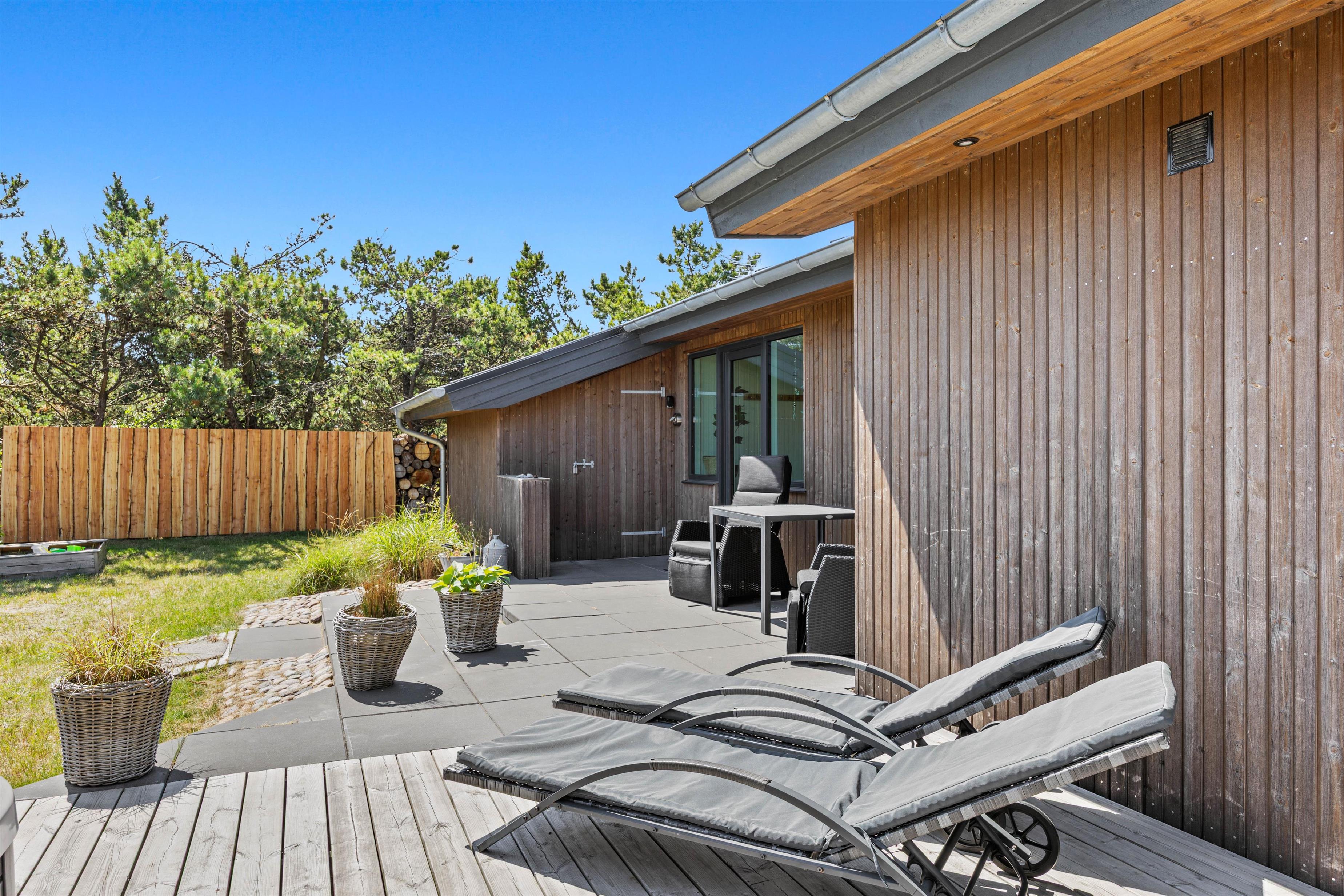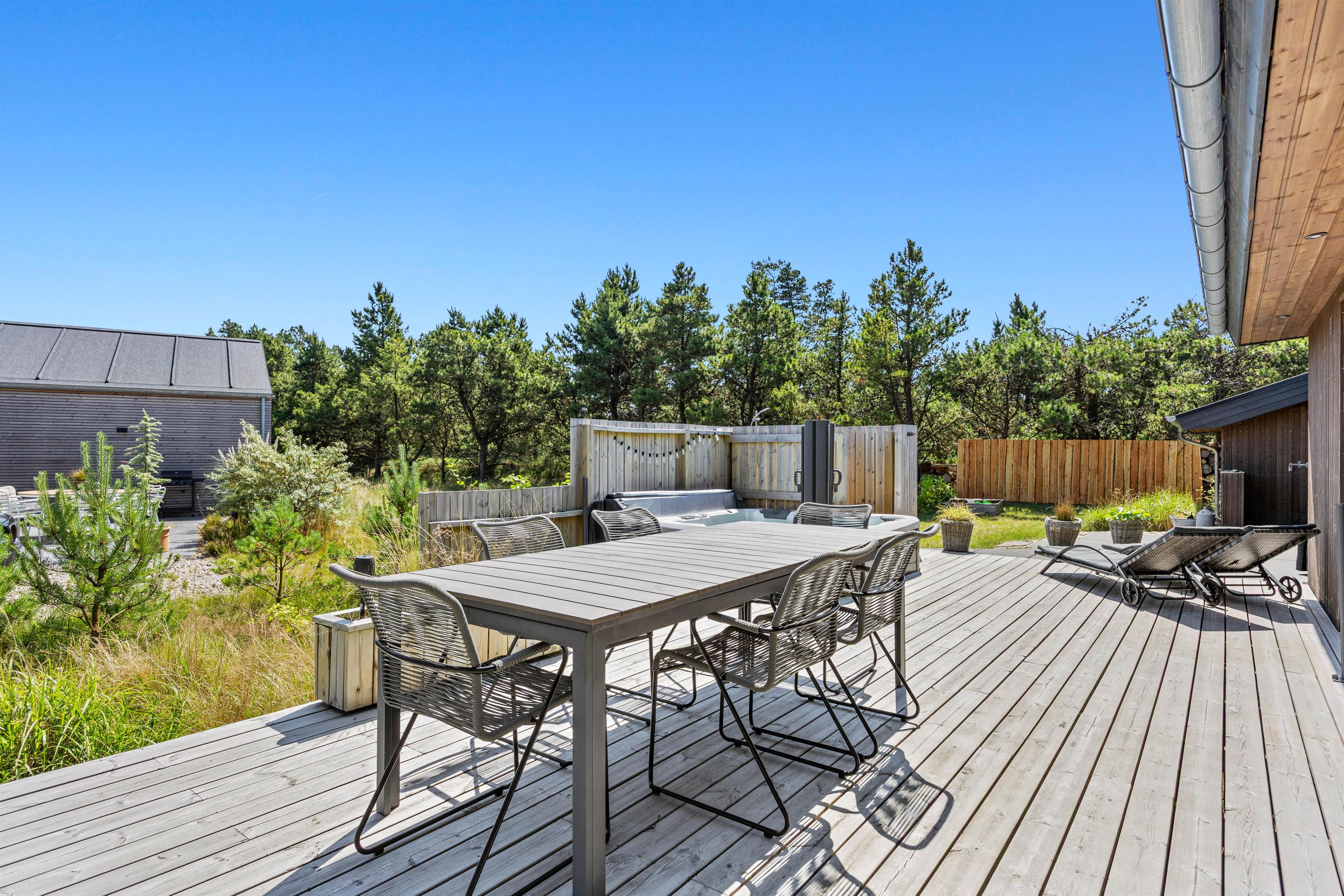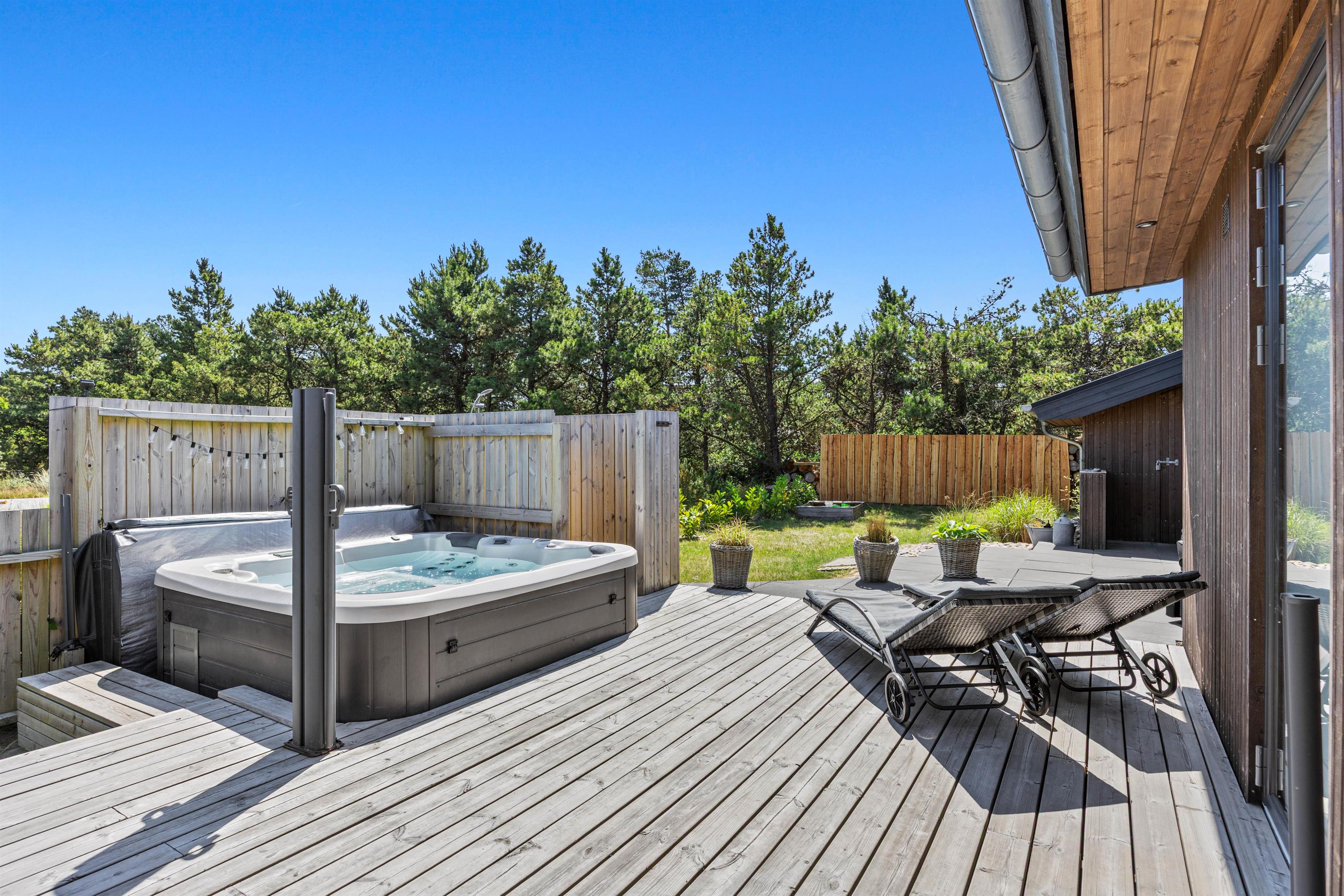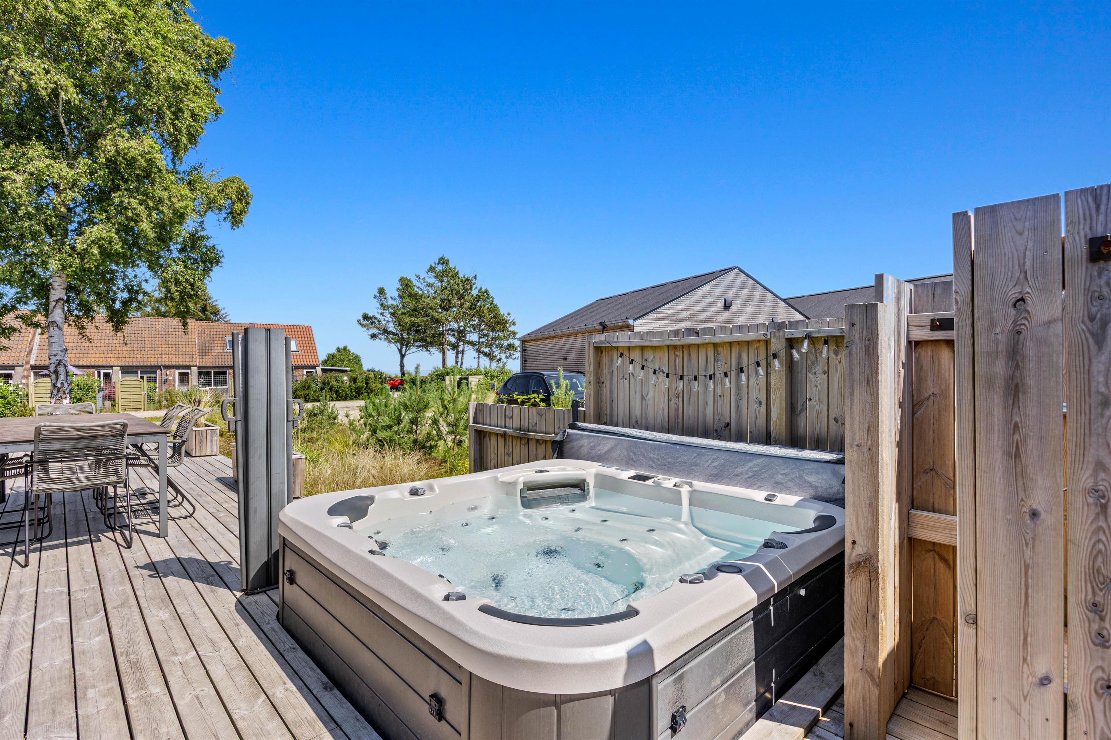 Det er også på terrassen, at I finder et af sommerhusets absolutte highlights; nemlig udespaen, der hele året rundt er helt fantastisk til afslapning under den åbne himmel. Inden I hopper en tur i det varme, boblende vand, kan I skylle jer under sommerhusets udebruser. Udebruseren kan benyttes fra april til november. Ydermere er der blevet bygget en dejlig aftenterrasse.