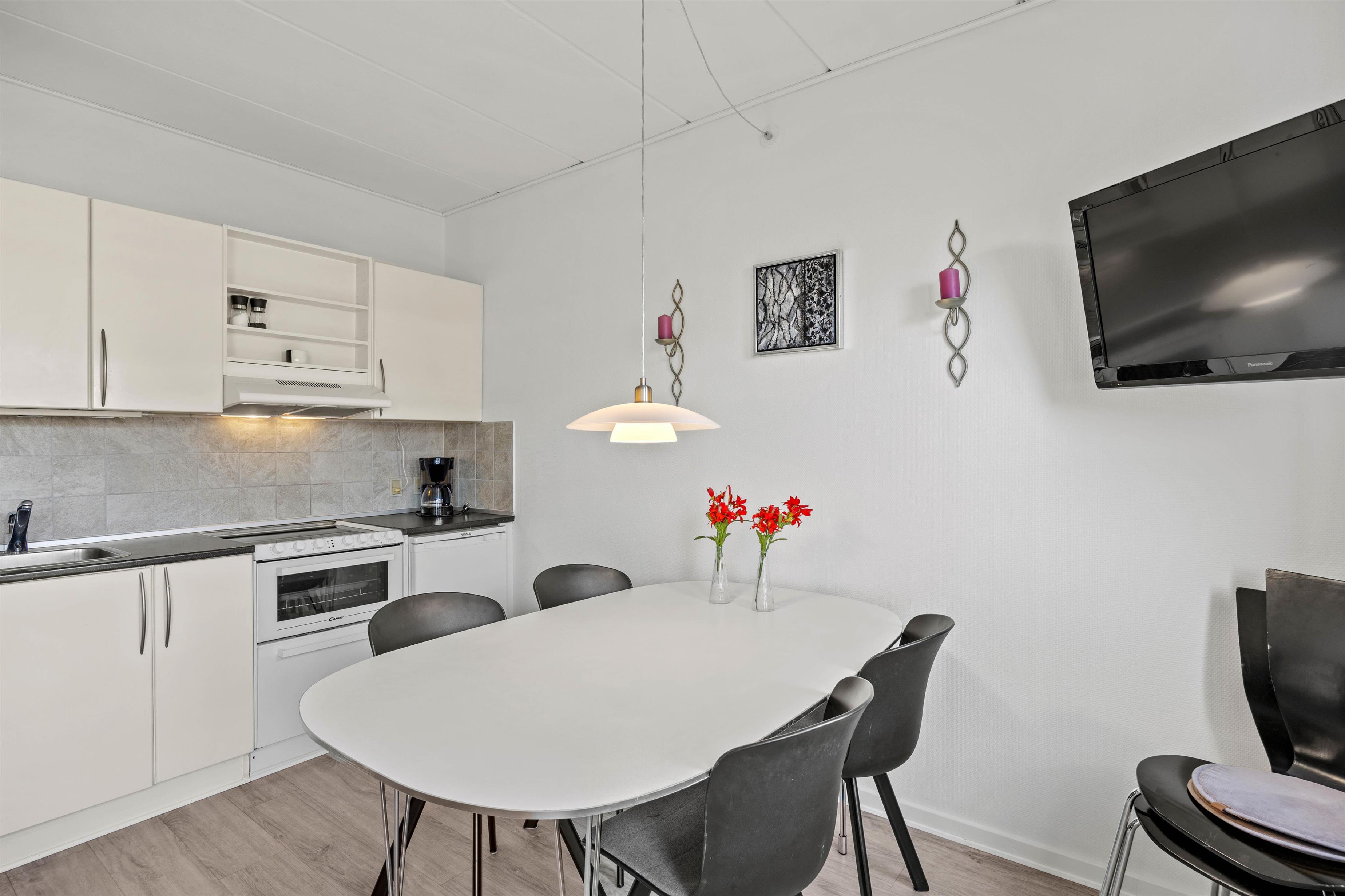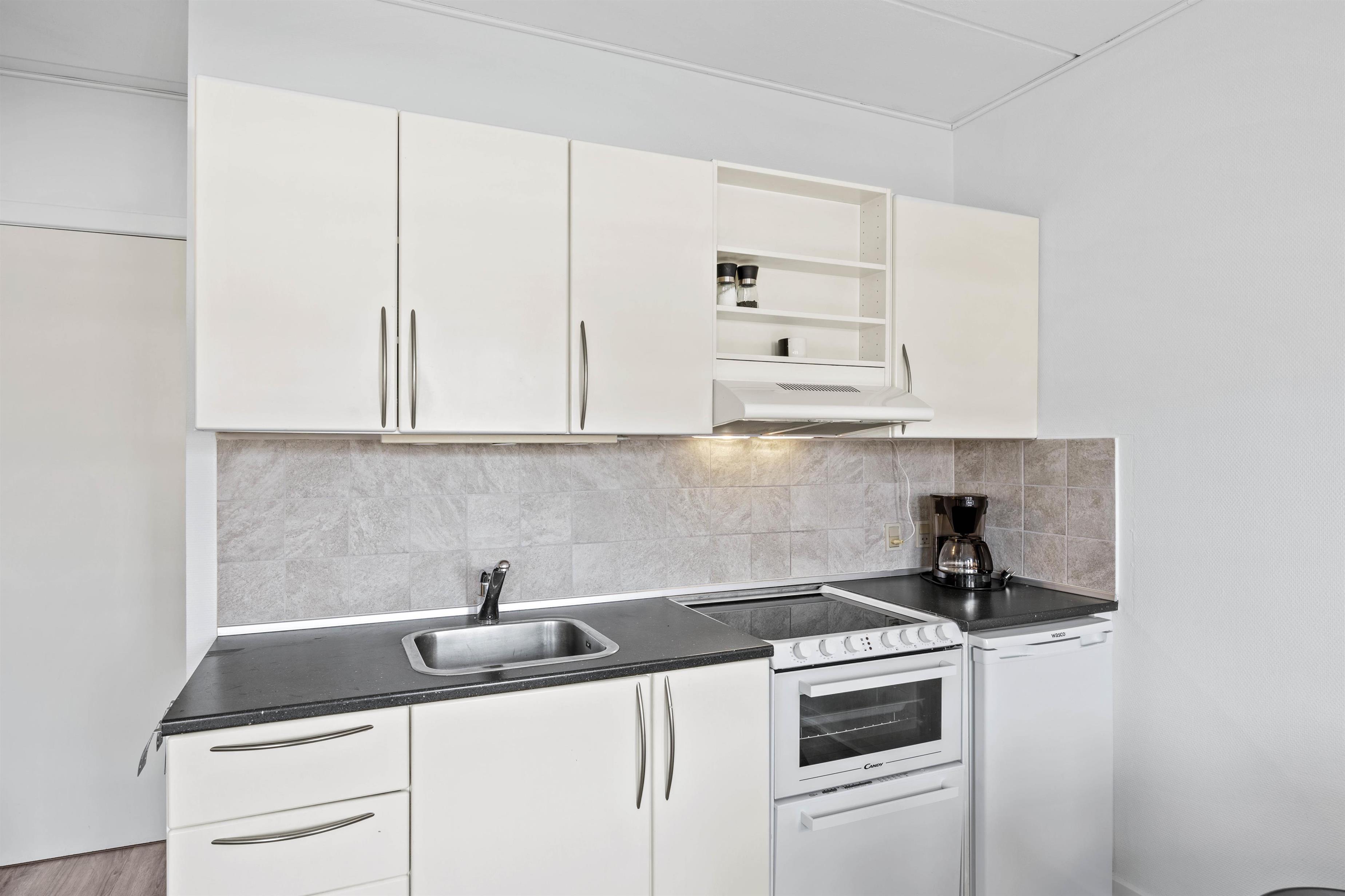 Hjerterummet er opholdsrummet, der rummer sofaområde, spiseplads og køkken. Her er plads til familielivet – uanset om I skal lave dejlig mad i køkkenet med opvaskemaskine, spille brætspil eller slappe af i sofaen med en god film. Herfra er der udgang til den lille terrasse, hvor I på de lune sommeraftner kan nyde en lækker grillmiddag.