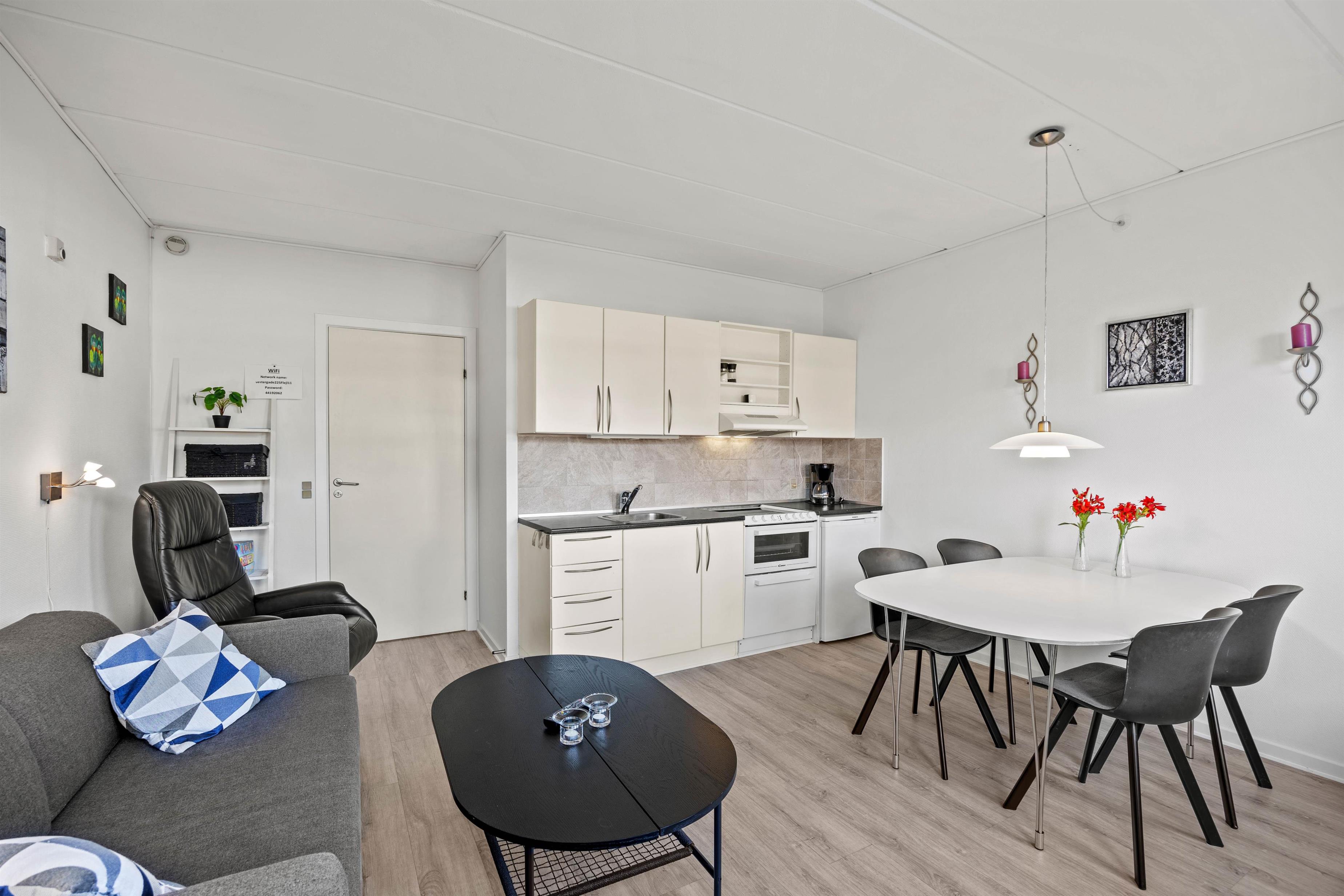 Utrolig hyggelig lejlighed med nyrenoveret badeværelse, holdt i grå og hvid. Ny doppelseng samt nye spisebordstole.
