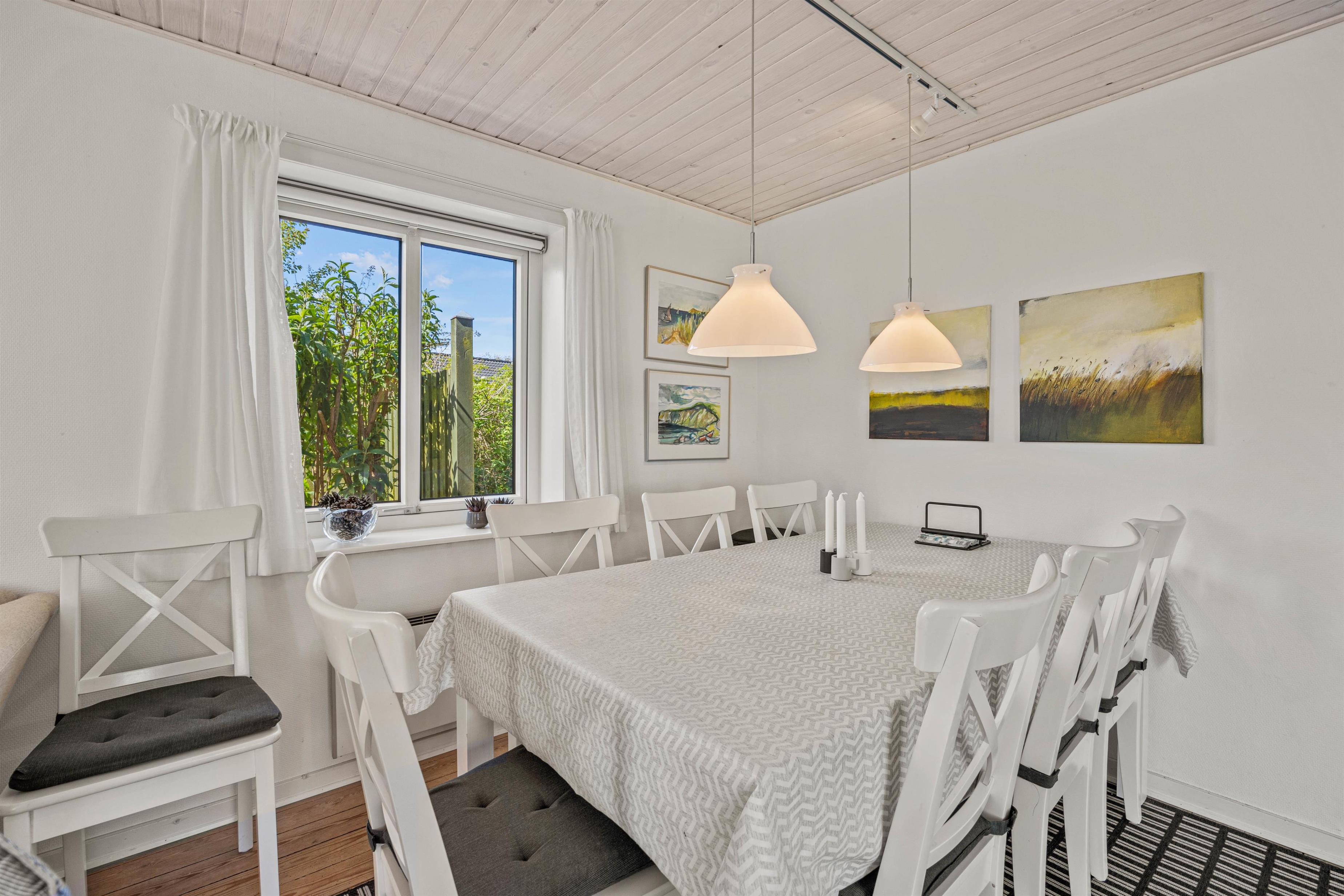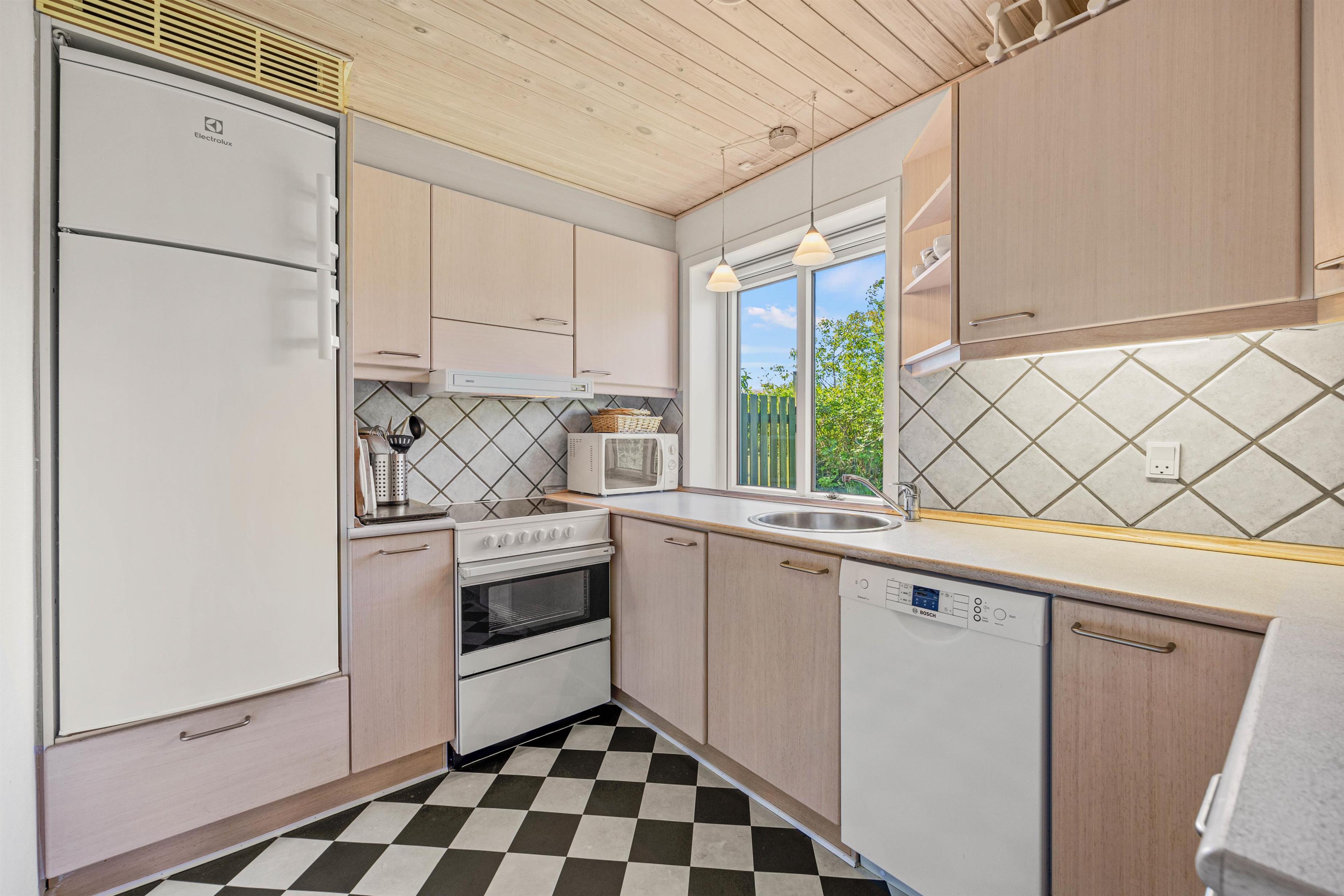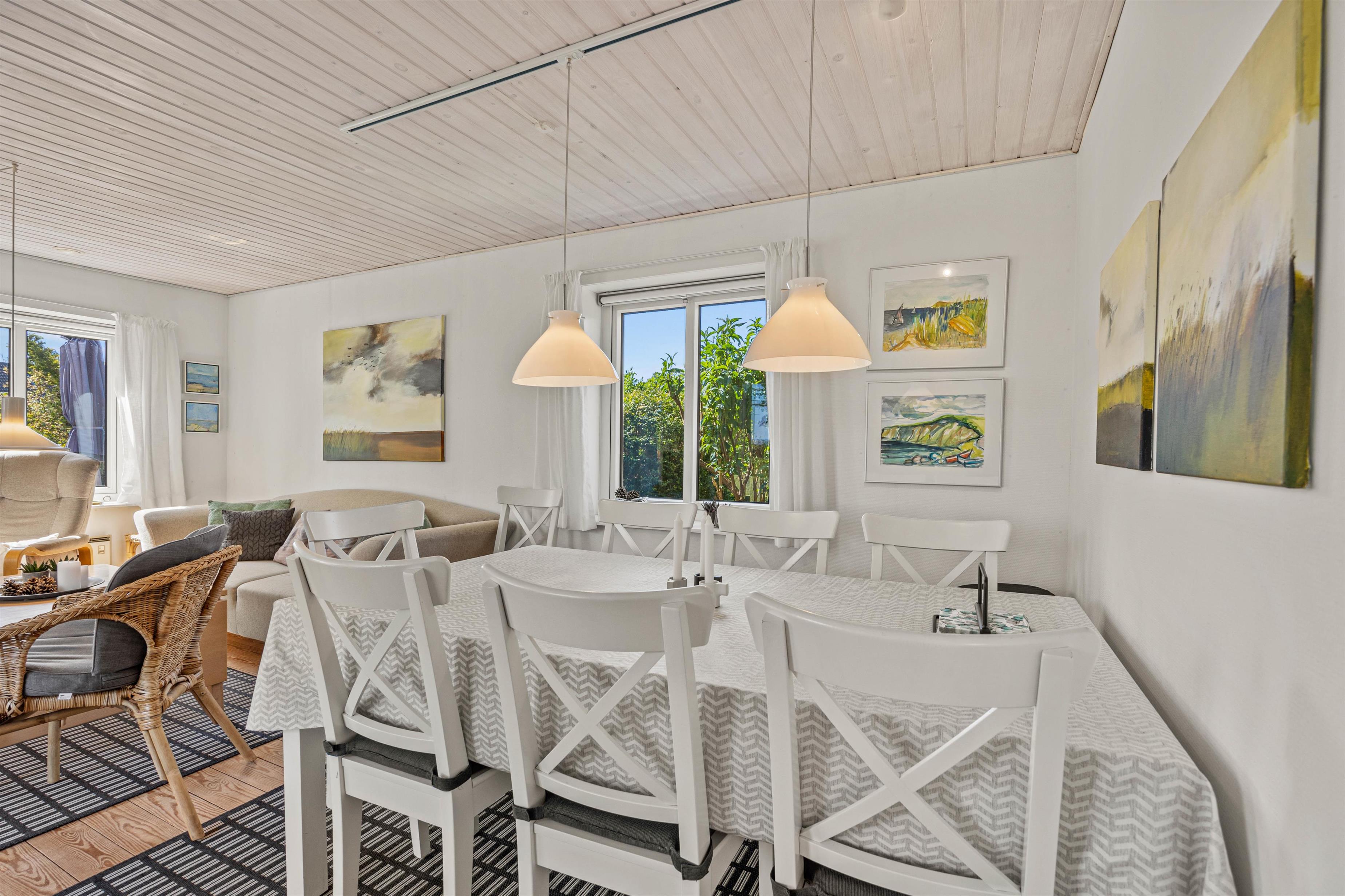 Straks, man træder ind ad døren til Lyngvejen 55, bydes man velkommen af en lys og hyggelig atmosfære. De lyse vægge og trælofter giver sammen med lysindfaldet fra de mange vinduespartier en dejlig feriestemning. Slap af med en kop kaffe i sofagruppen, træk jer tilbage med en god bog i en lænestol eller få en snak og et spil brætspil ved spisebordet. Køkkenet indeholder alt, hvad I behøver for at forkæle hinanden med lækre hjemmelavede måltider, herunder mikrobølgeovn og opvaskemaskine.