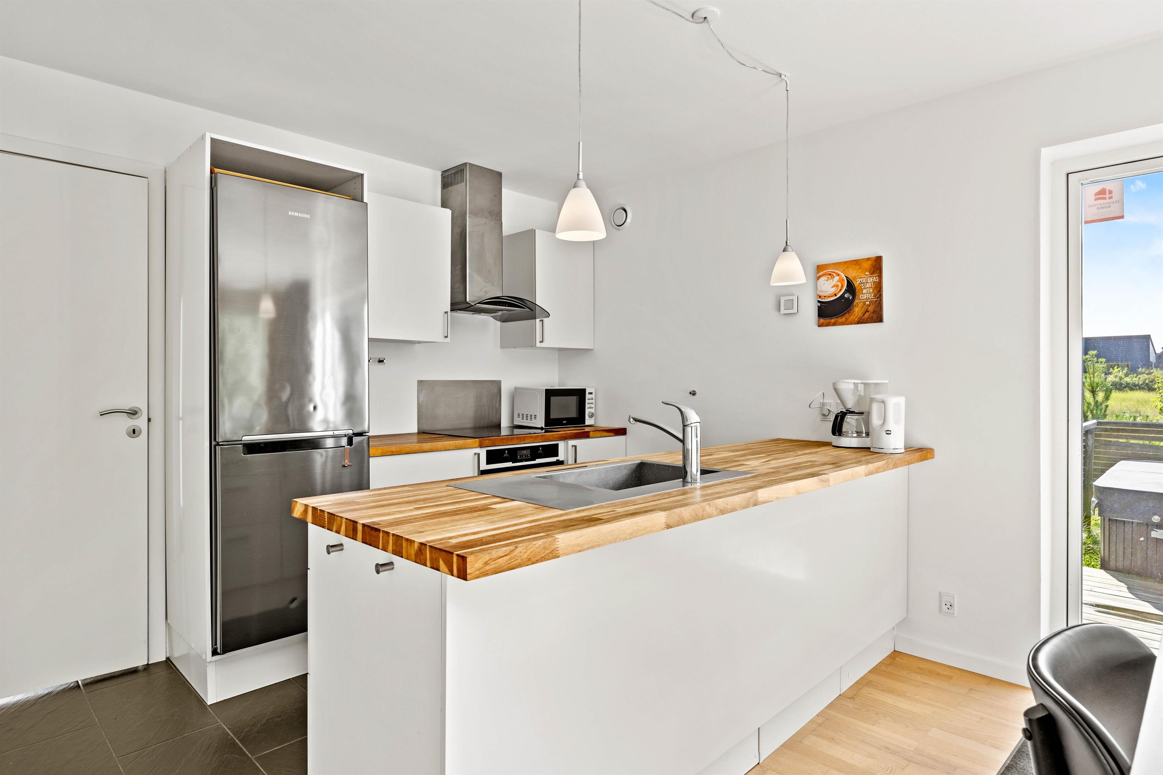 Stuen er hyggeligt indrettet, og her er der rig mulighed for at slappe af med en god bog, se film eller samle familien til en hyggelig brætspilsaften. Slap af på sofaen efter en aktivitetsfyldt dag eller et lækkert måltid, der er tilberedt i det funktionelle køkken. Her kan der laves dejlig mad, og samtalen flyder gennem det åbne alrum. For at fuldende den hyggelige sommerhusstemning kan I tænde op i brændeovnen, der både spreder varme og hygge!