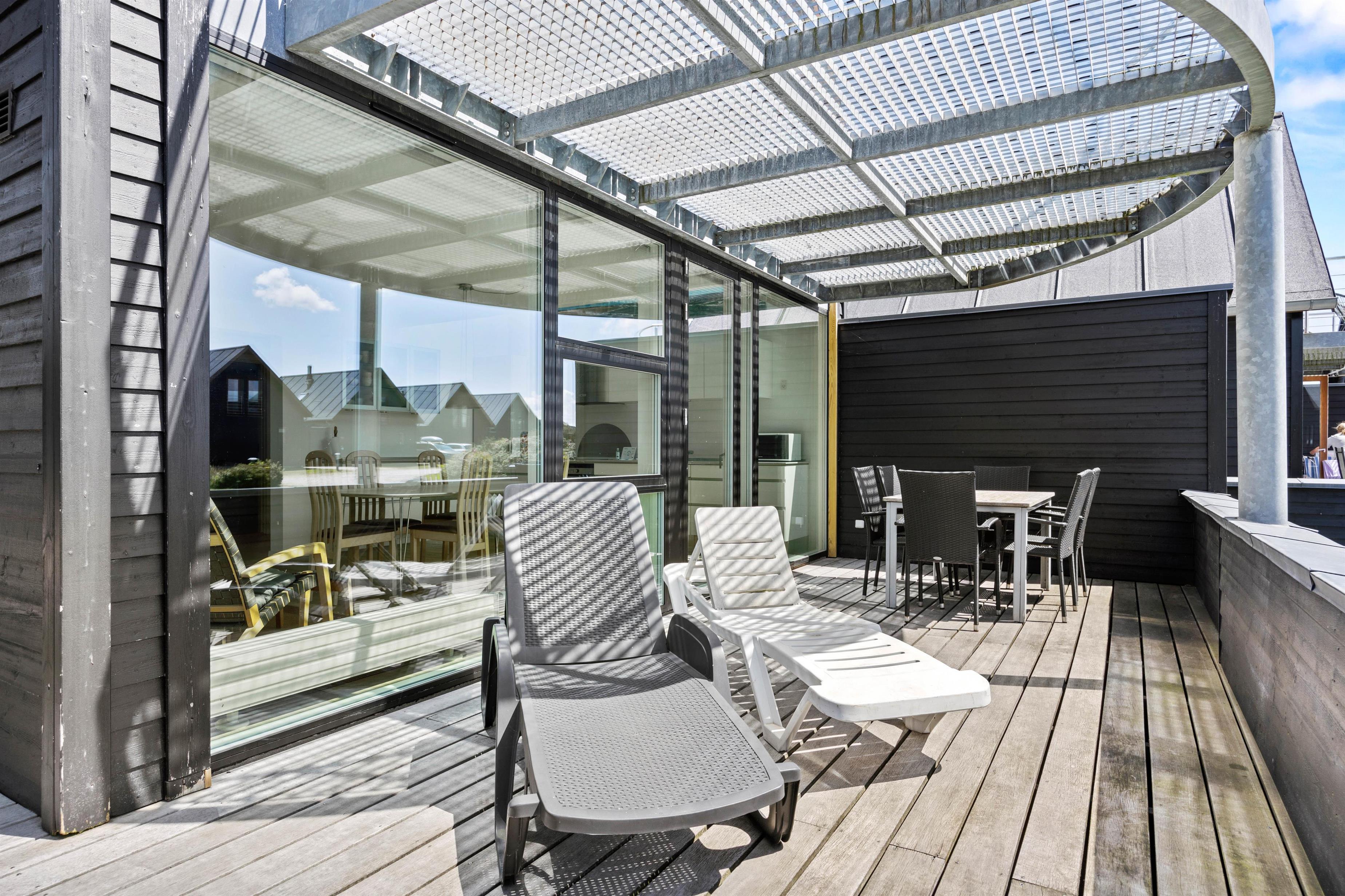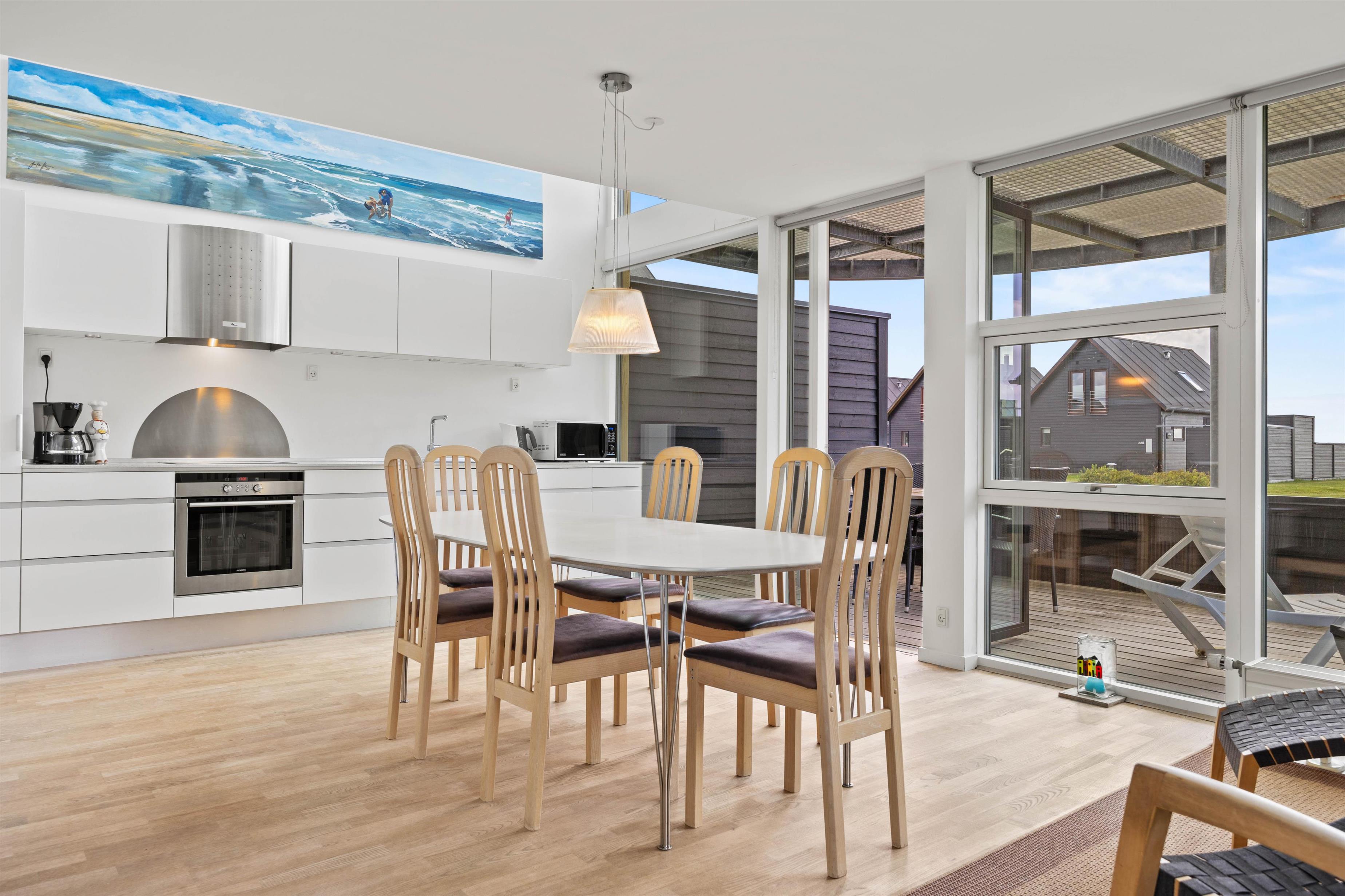 I stueetagen finder I et imponerende stort køkken-alrum med lækker indretning og blandt andet opvaskemaskine. Det åbne køkken ligger i forbindelse med spisestuen, og i hele rummet er der et fantastisk lysinfald på grund af de store panorama-vinduer. Der er lagt pæne klinker i hele stueetagen. Fra spisestuen er der direkte udgang til en stor terrasse med havemøbler og solvogne og med læhegn. Her kan I nyde opholdet i det frie hele dagen, der er altid en plads i solen at finde på den store terrasse med pæne møbler. Om aftenen kan I hygge jer med et glas rosé og mad fra grillen.