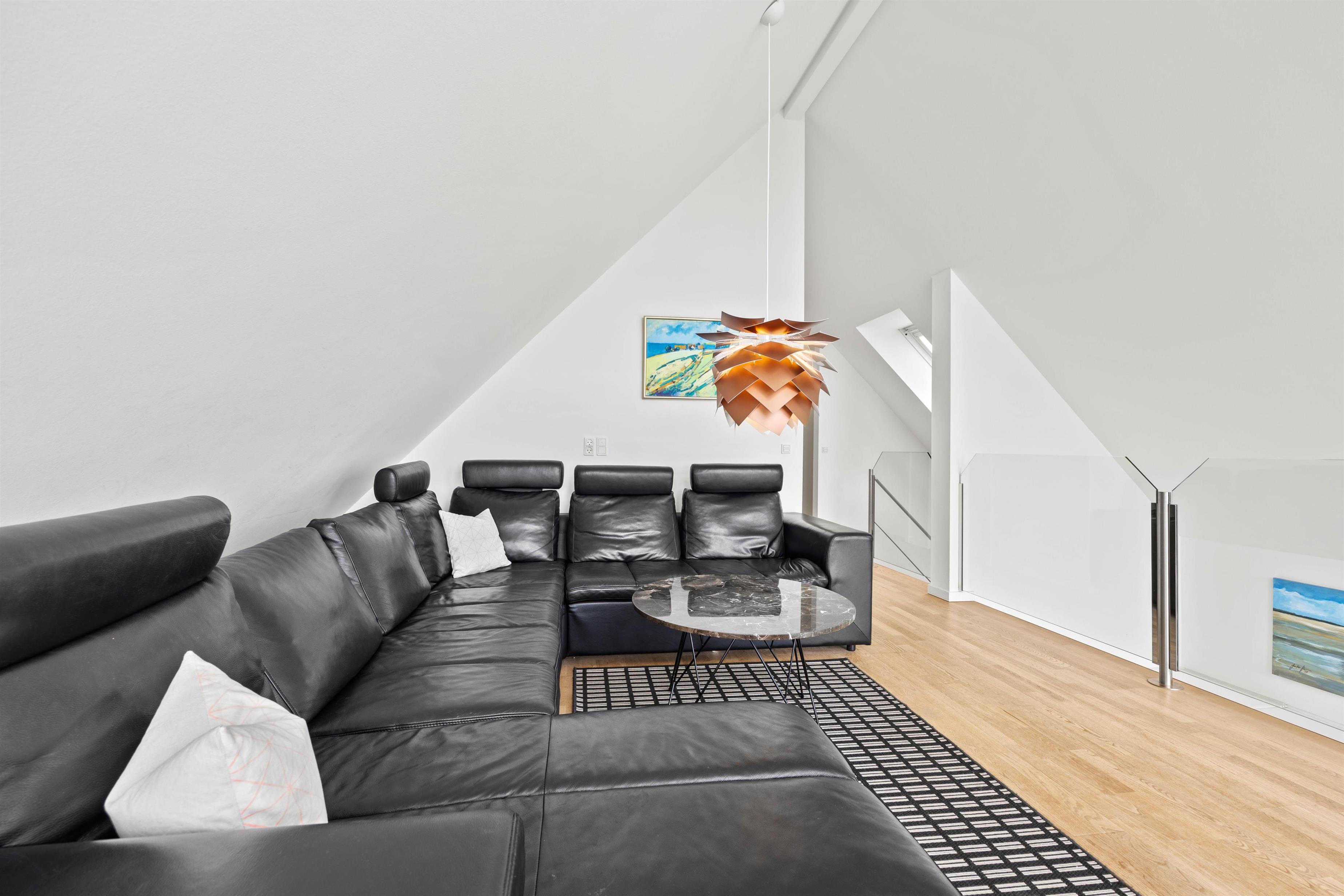 Men det er i den store opholdsstue på første sal, I virkelig kan lade jer forbløffe. Her kan I slappe af og nyde en fantastisk udsigt gennem det store vinduesparti, samtidig med at I har adgang til en fransk altan med komfortable havemøbler.