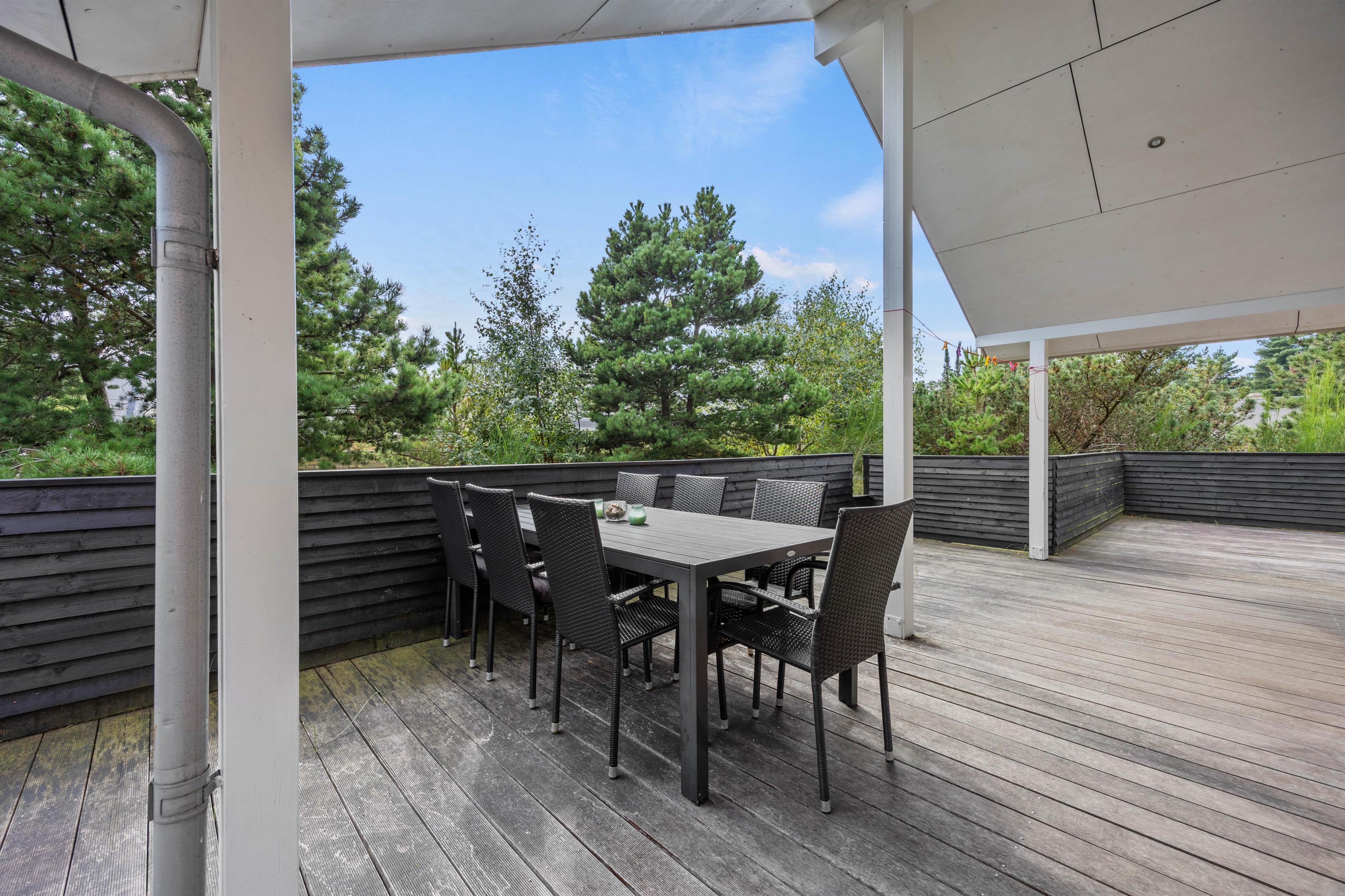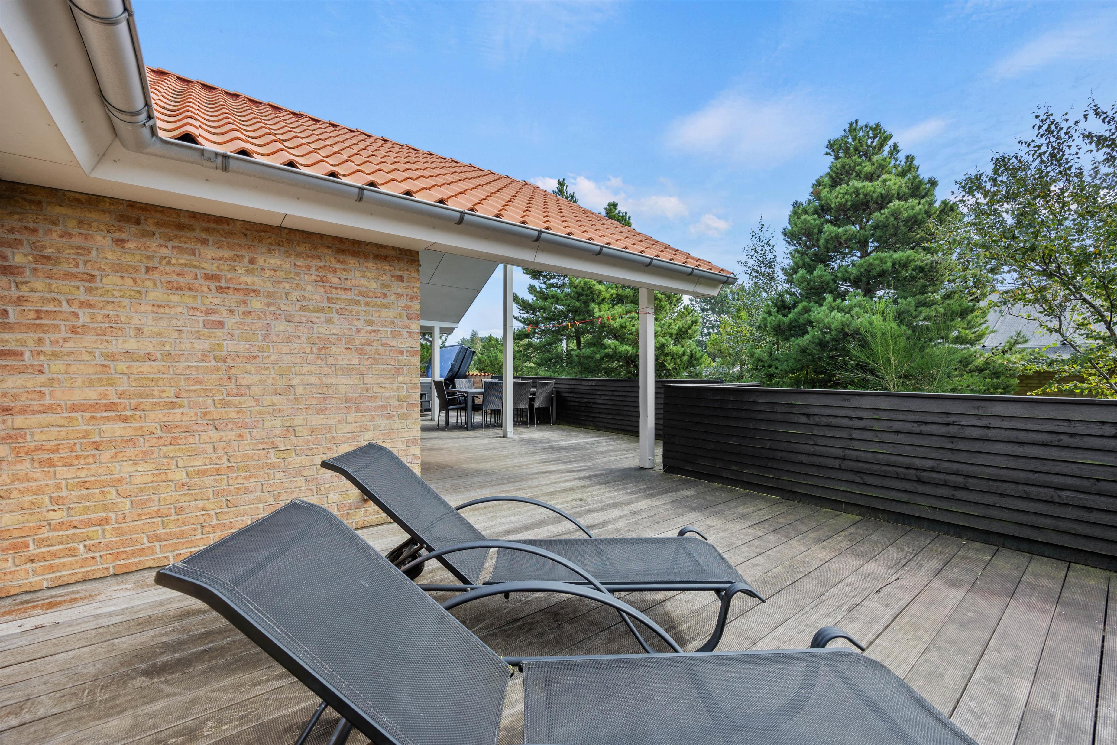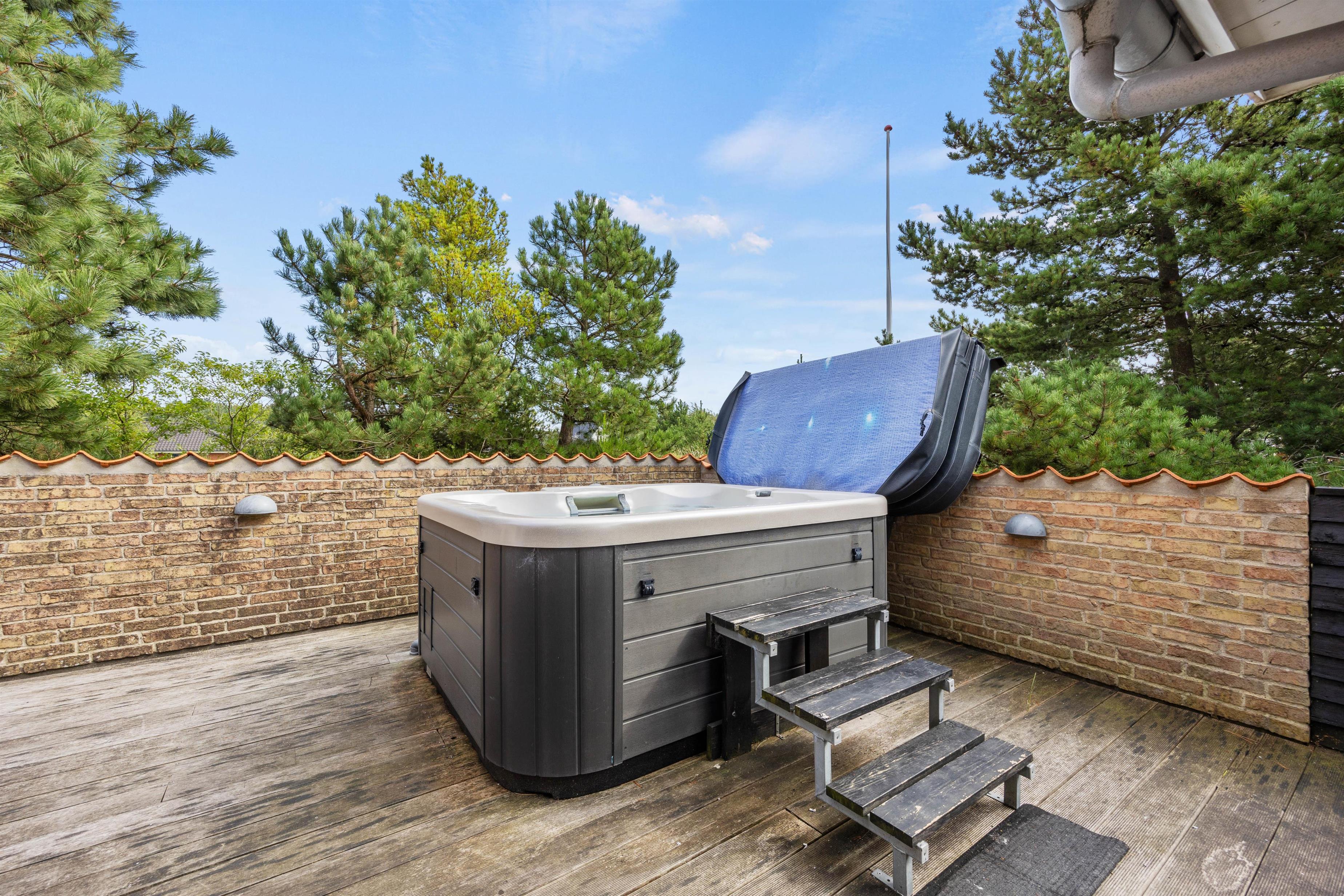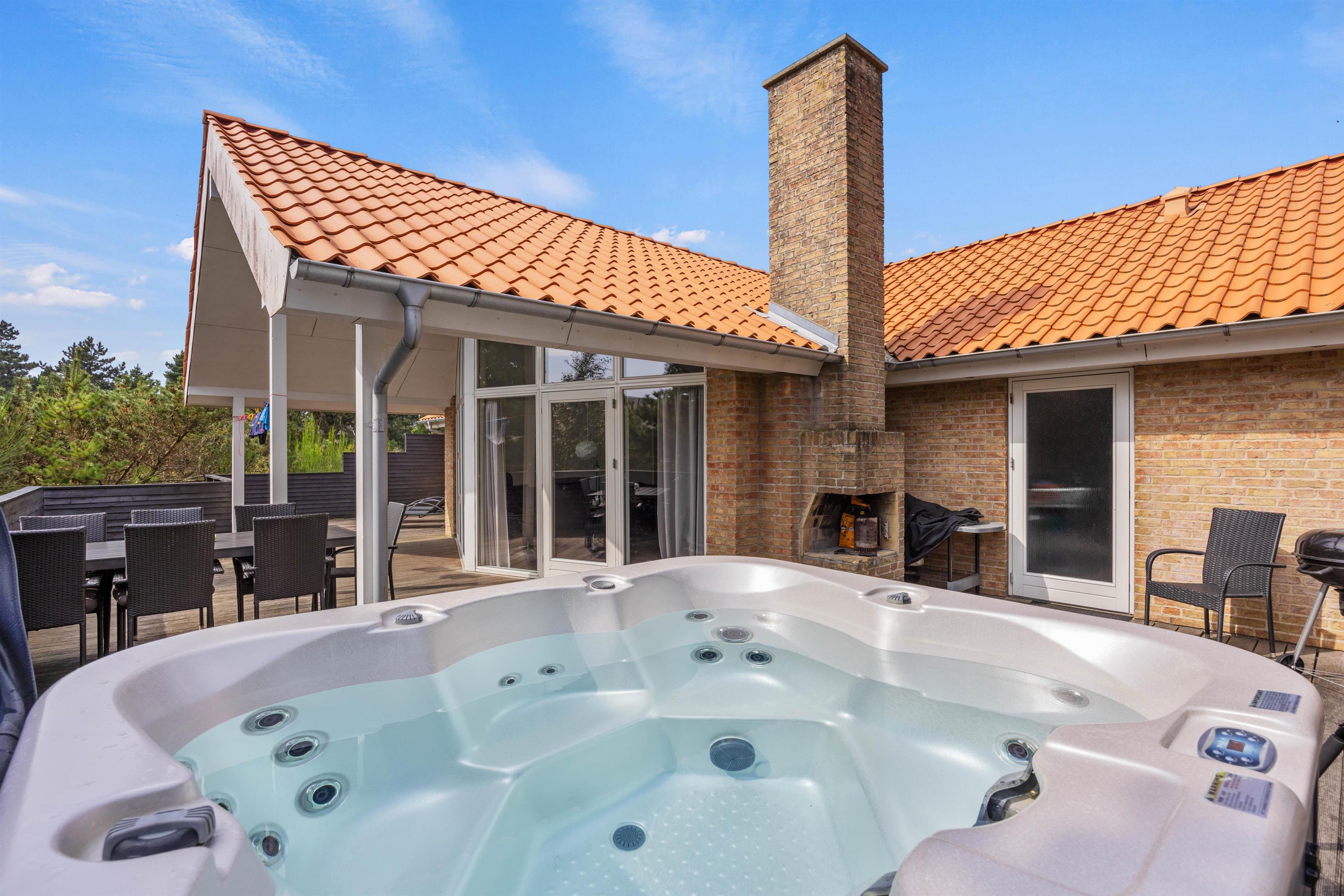 Stuens terrassedør fører jer ud på den dejlige terrasse, som er lukket. Om sommeren kan I derfor trygt lade døren stå åben og lade børnene lege. Her kan I nyde solskinstimerne. Her kan I endda hoppe i det store udendørs boblebad, som har plads til seks personer (kan benyttes fra april - oktober). På den dejlige afskærmede, delvis overdækket terrasse kan I holde nogle skønne grillaftner og efterfølgende bage snobrød eller riste skumfiduser hen over bålfadet? Som en lille bonus er her også et lille legehus til børnene.