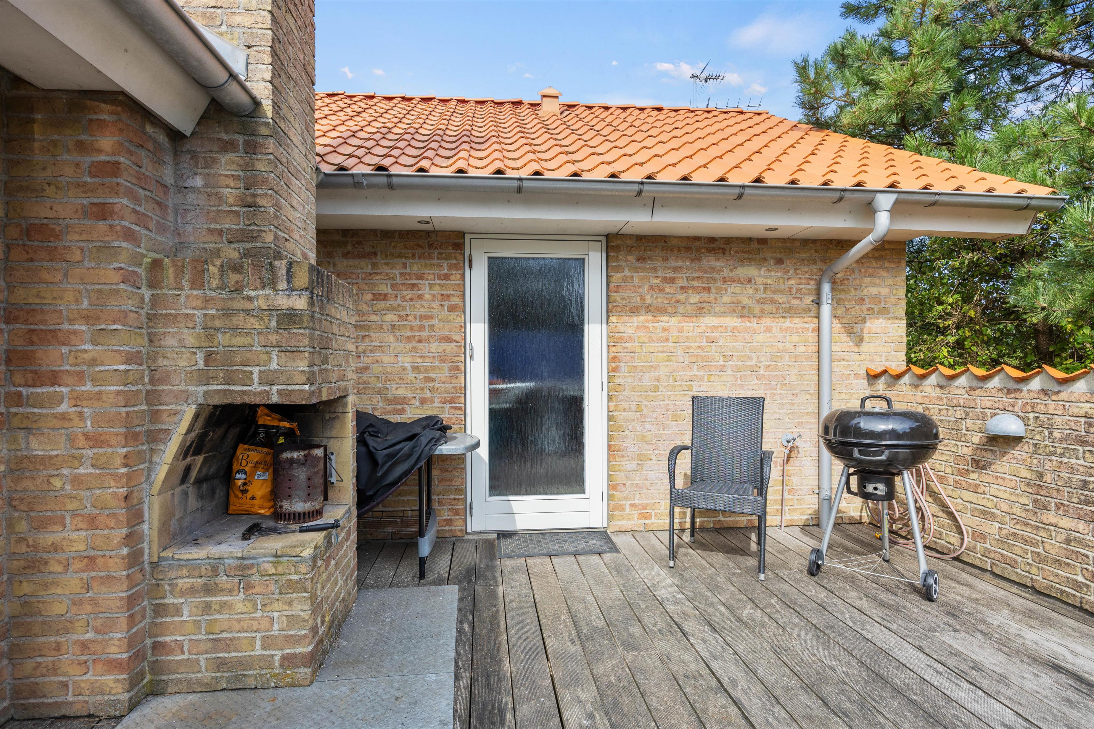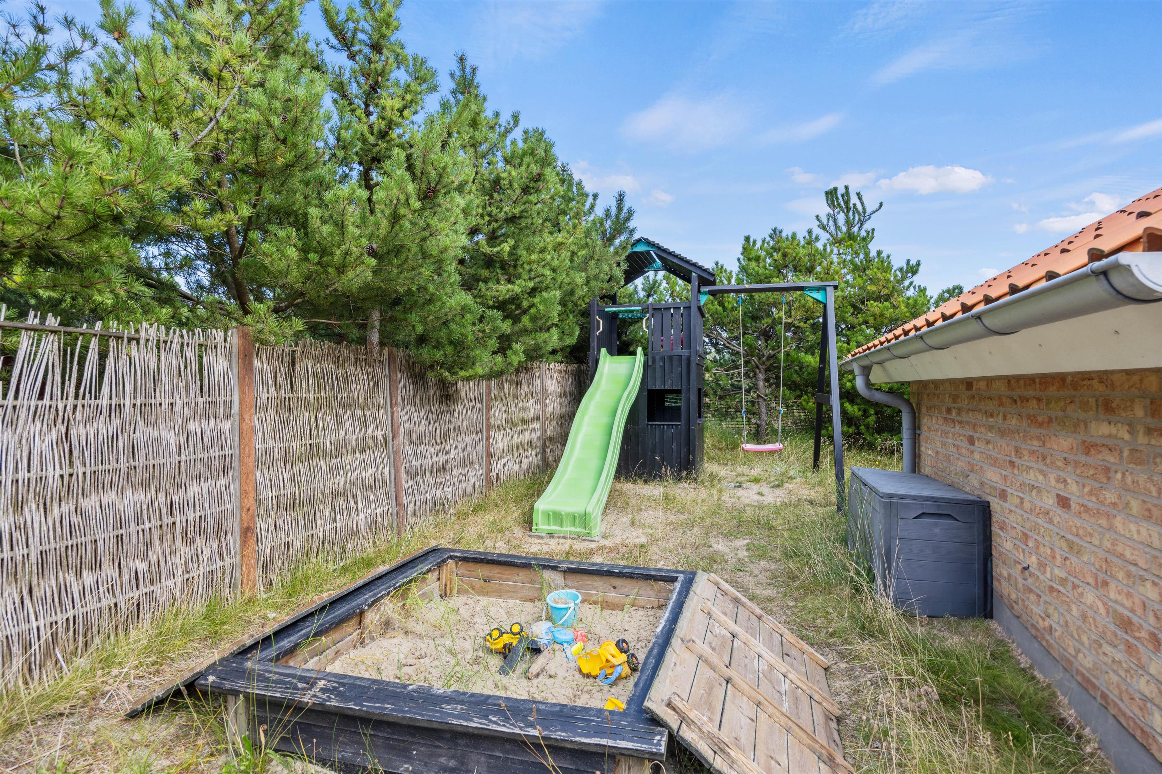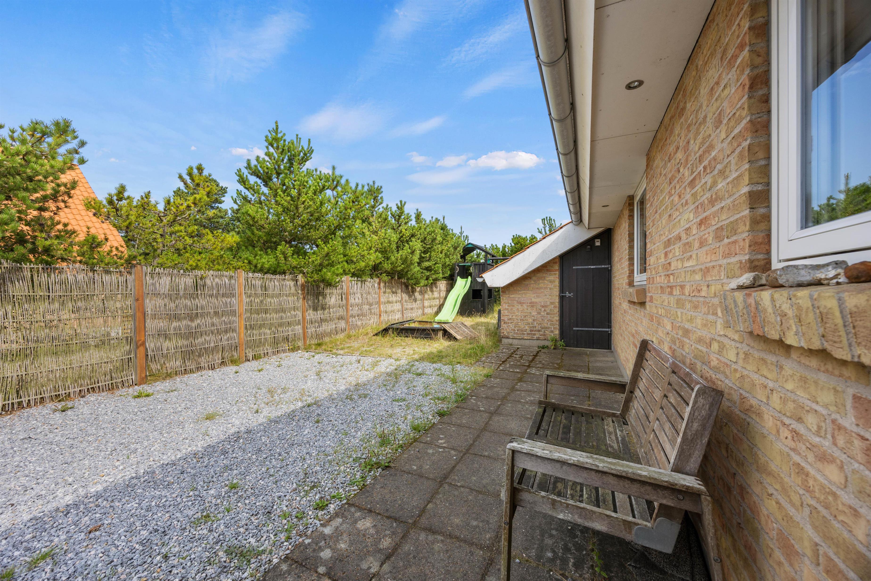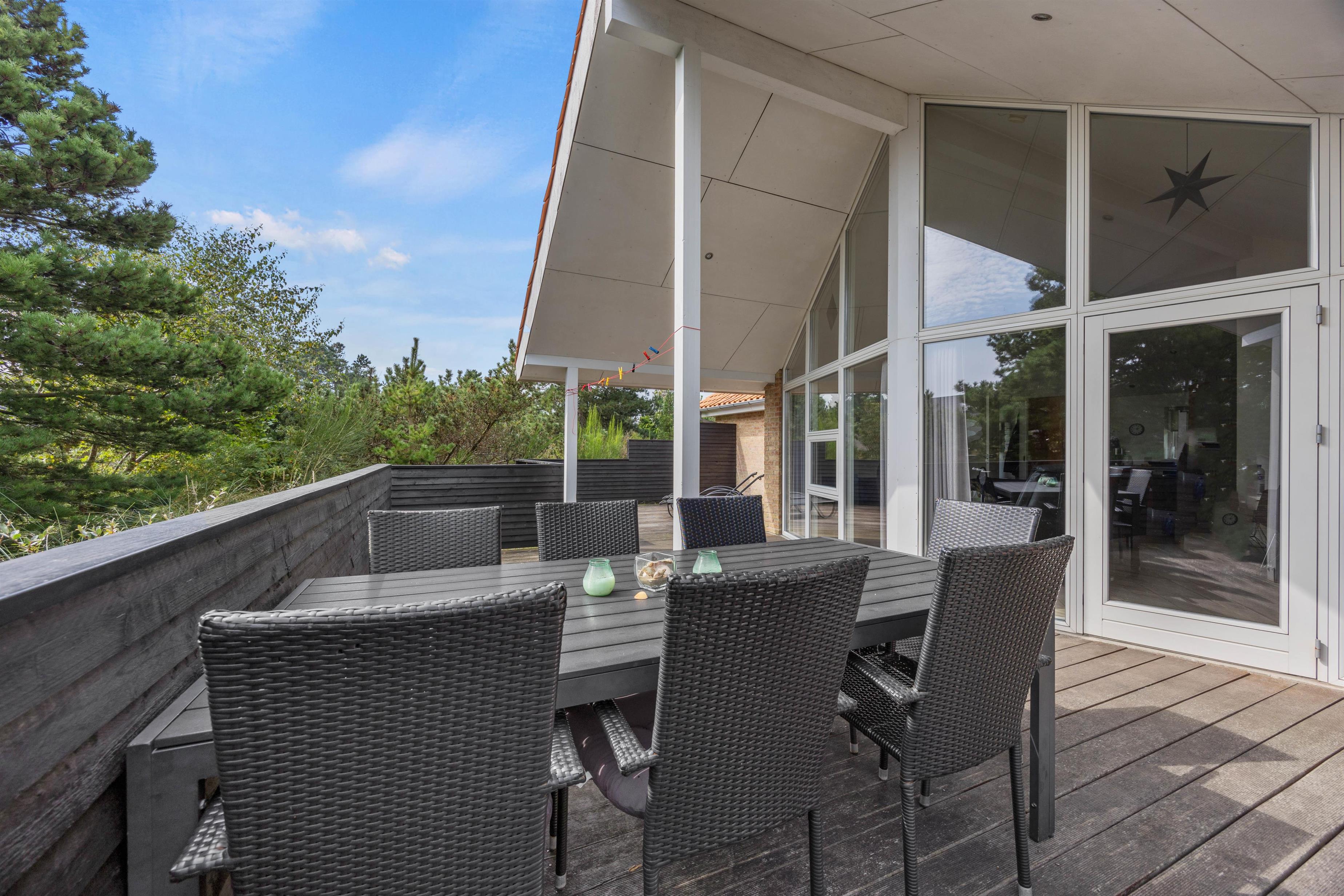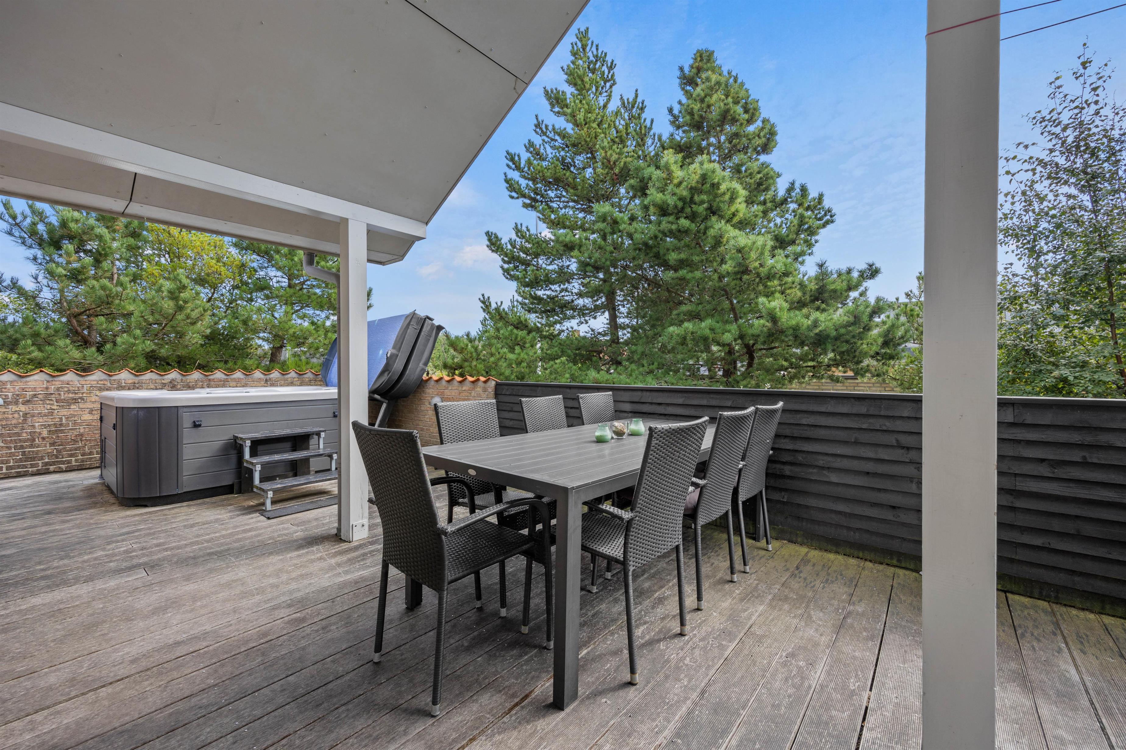 Stuens terrassedør fører jer ud på den dejlige terrasse, som er lukket. Om sommeren kan I derfor trygt lade døren stå åben og lade børnene lege. Her kan I nyde solskinstimerne. Her kan I endda hoppe i det store udendørs boblebad, som har plads til seks personer (kan benyttes fra april - oktober). På den dejlige afskærmede, delvis overdækket terrasse kan I holde nogle skønne grillaftner og efterfølgende bage snobrød eller riste skumfiduser hen over bålfadet? Som en lille bonus er her også et lille legehus til børnene.
