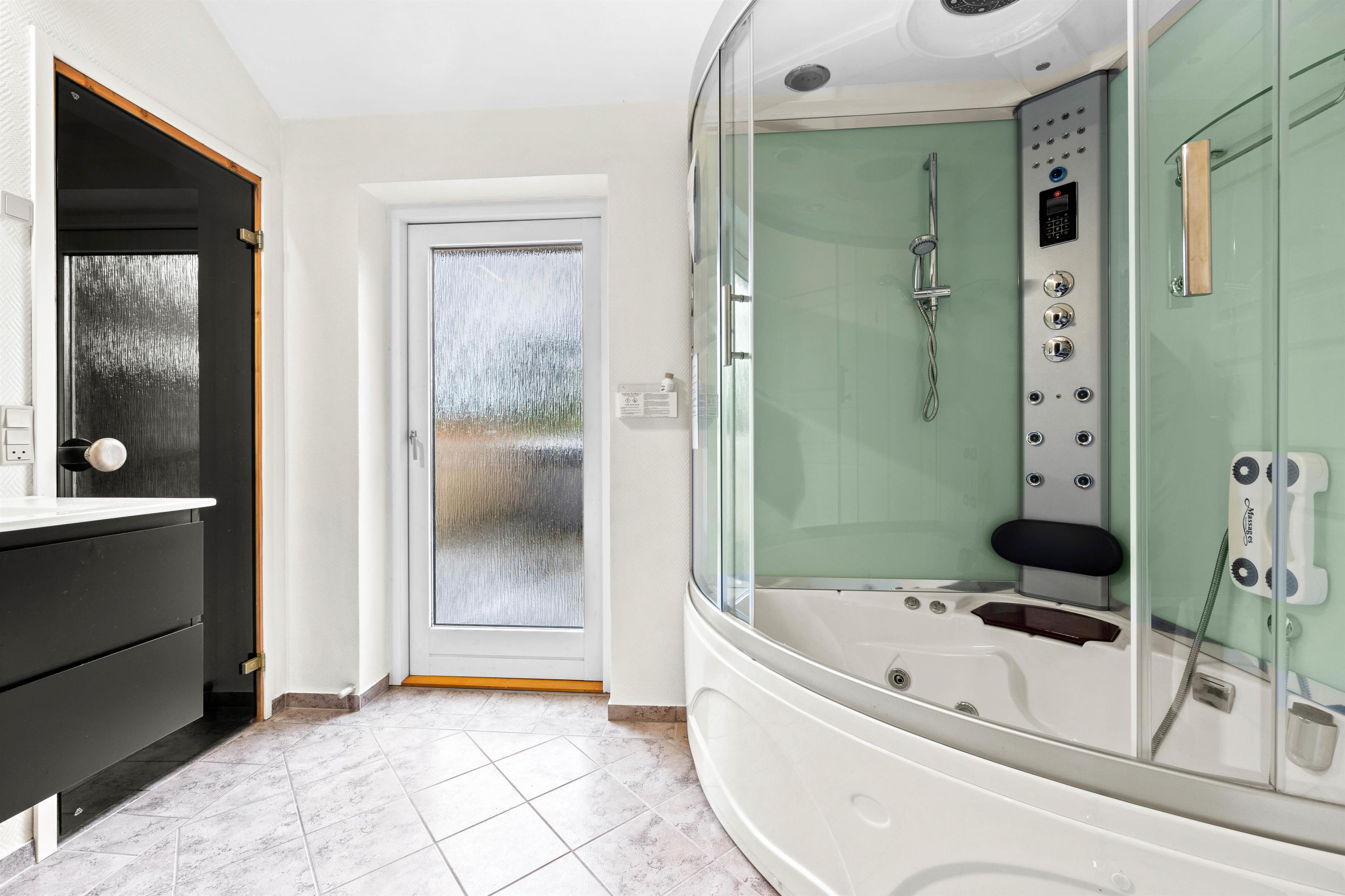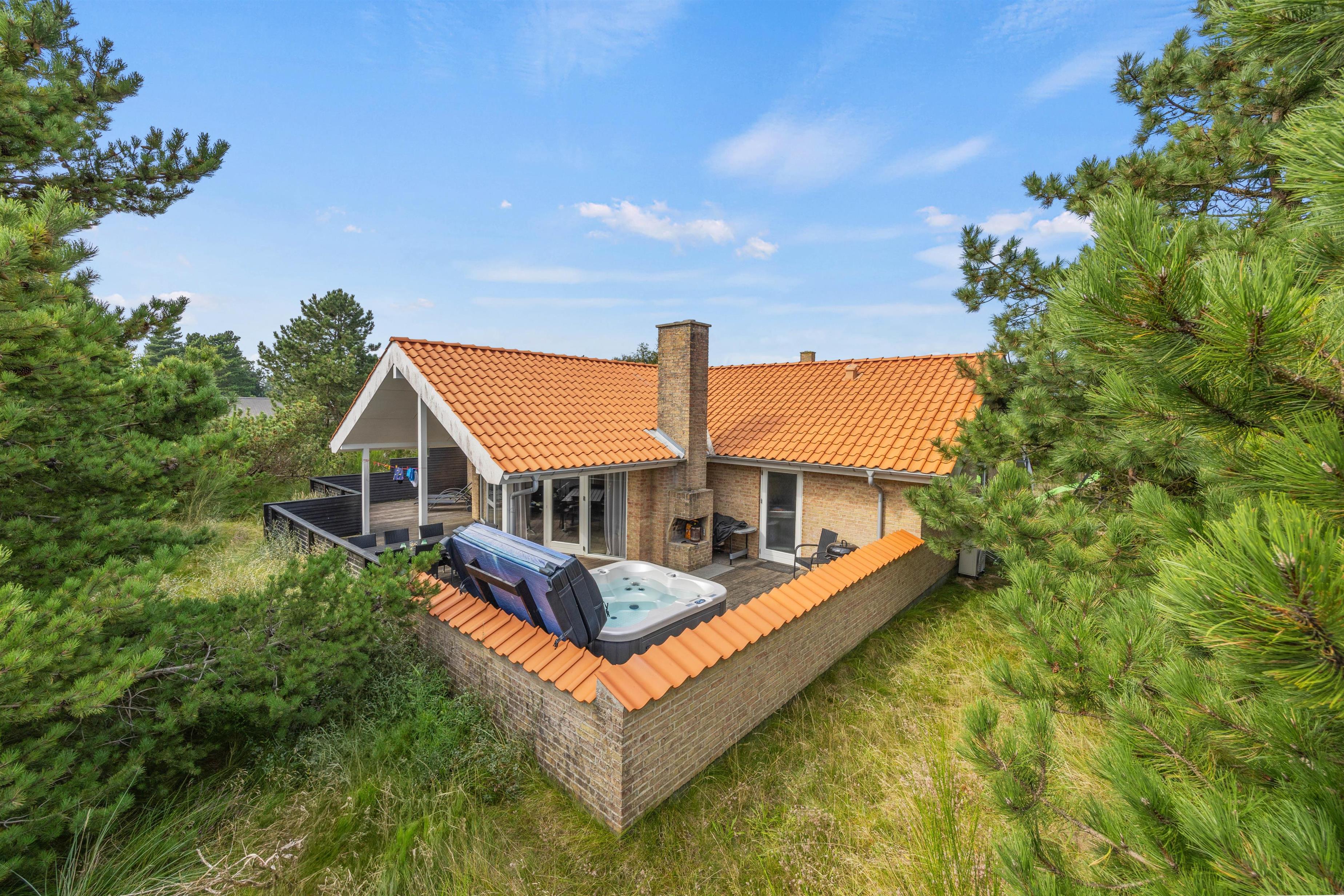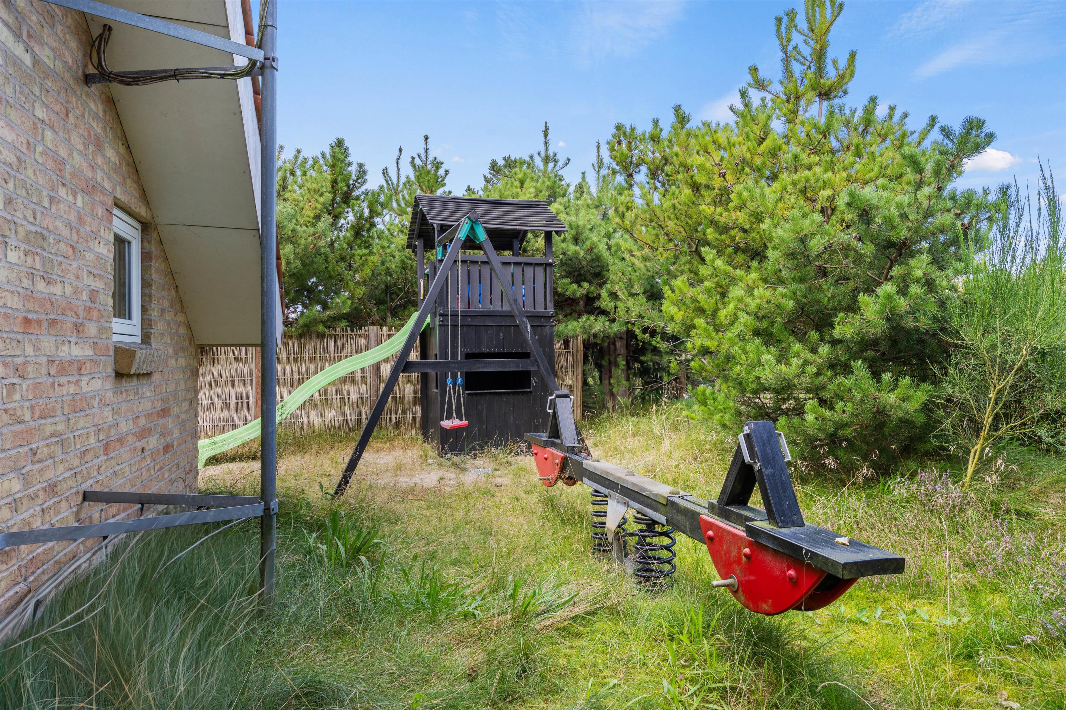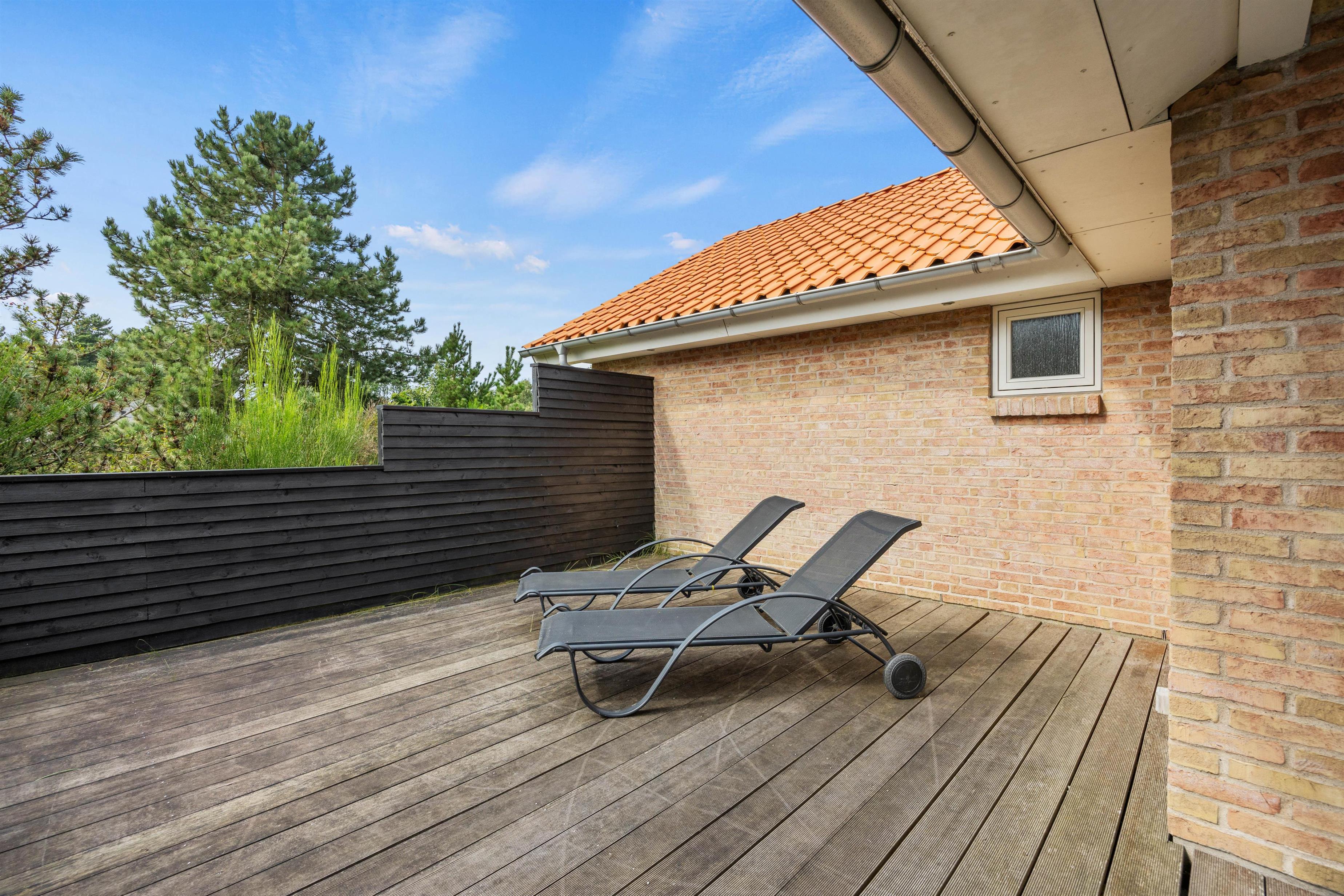 Stuens terrassedør fører jer ud på den dejlige terrasse, som er lukket. Om sommeren kan I derfor trygt lade døren stå åben og lade børnene lege. Her kan I nyde solskinstimerne. Her kan I endda hoppe i det store udendørs boblebad, som har plads til seks personer (kan benyttes fra april - oktober). På den dejlige afskærmede, delvis overdækket terrasse kan I holde nogle skønne grillaftner og efterfølgende bage snobrød eller riste skumfiduser hen over bålfadet? Som en lille bonus er her også et lille legehus til børnene.