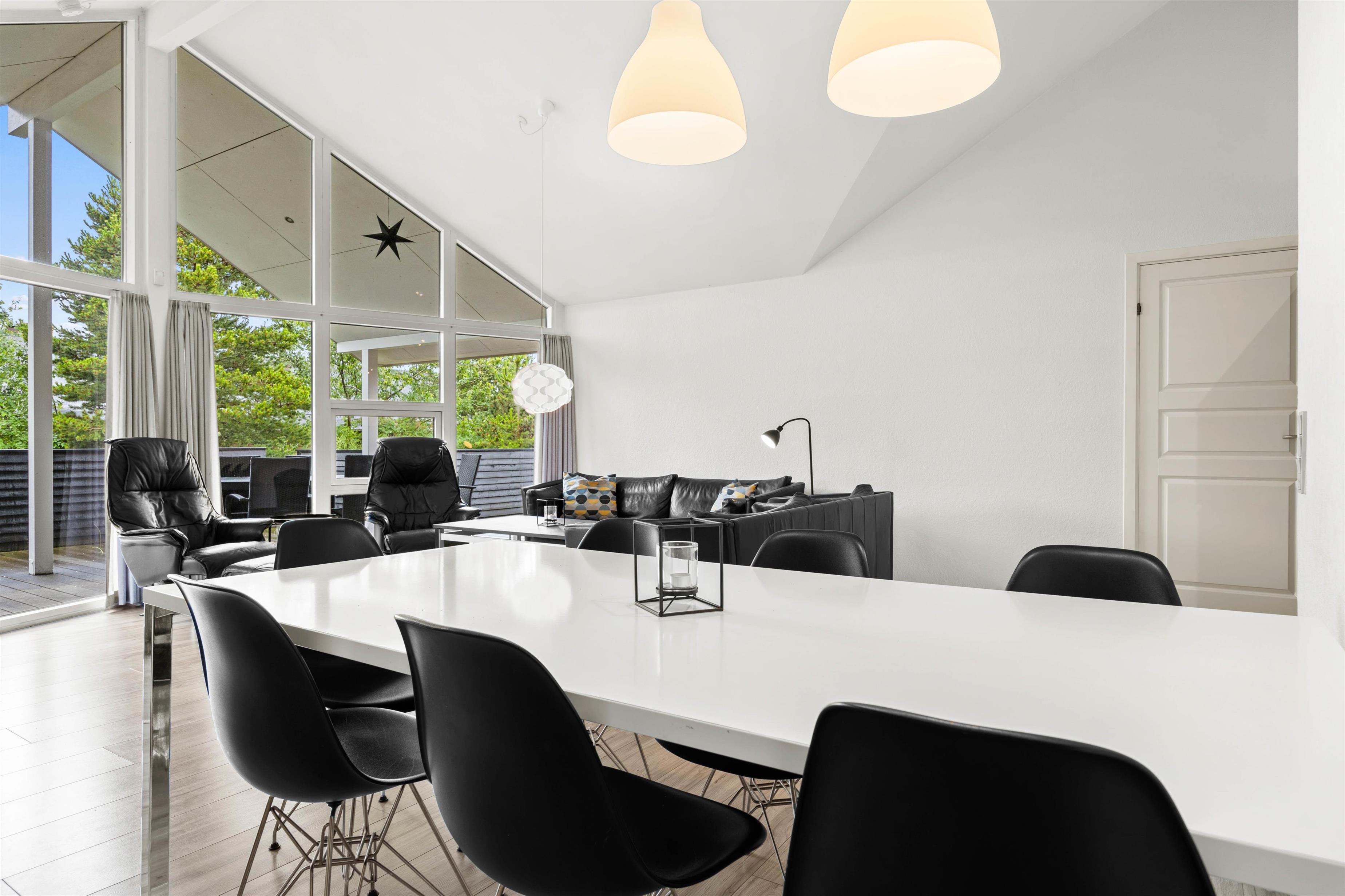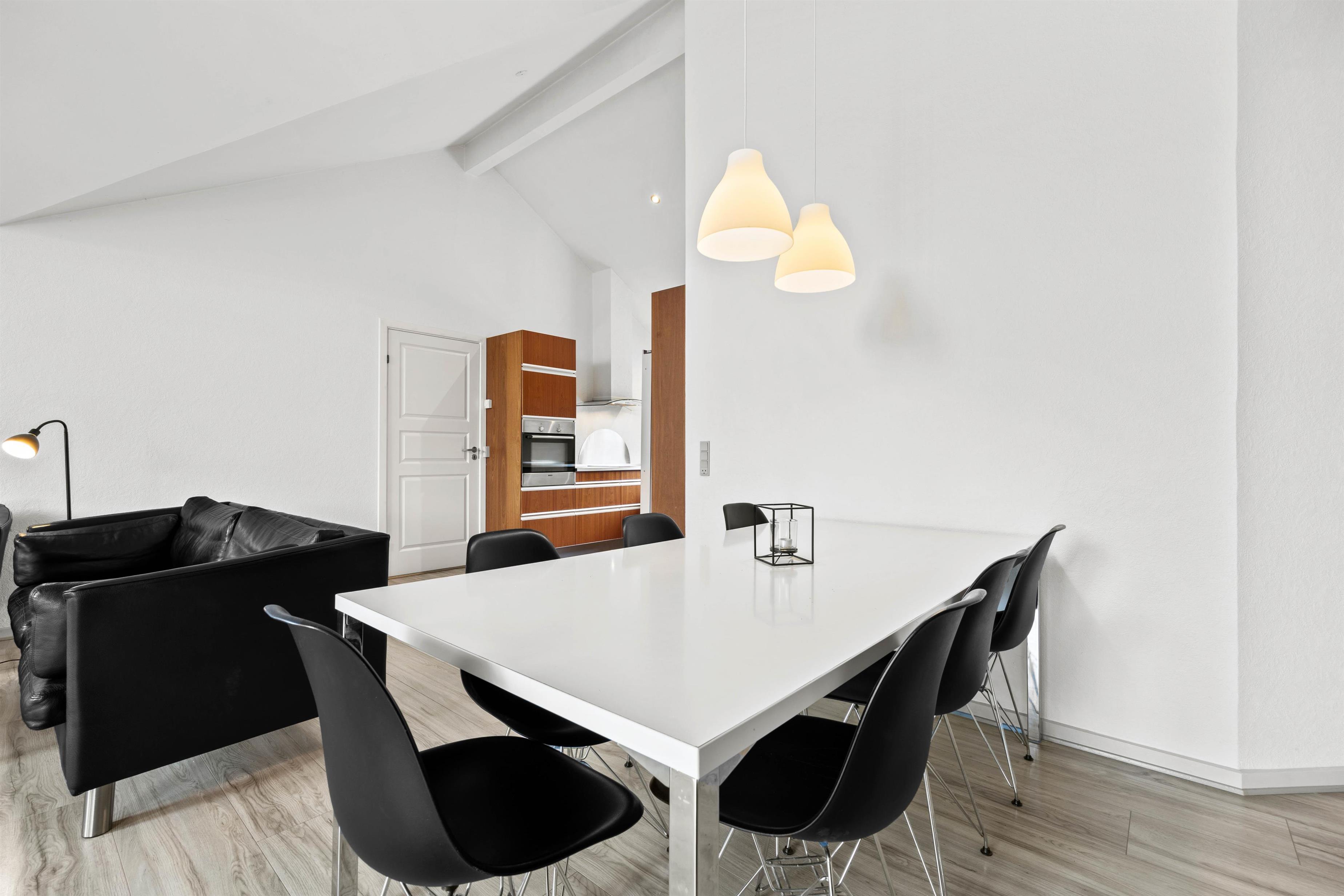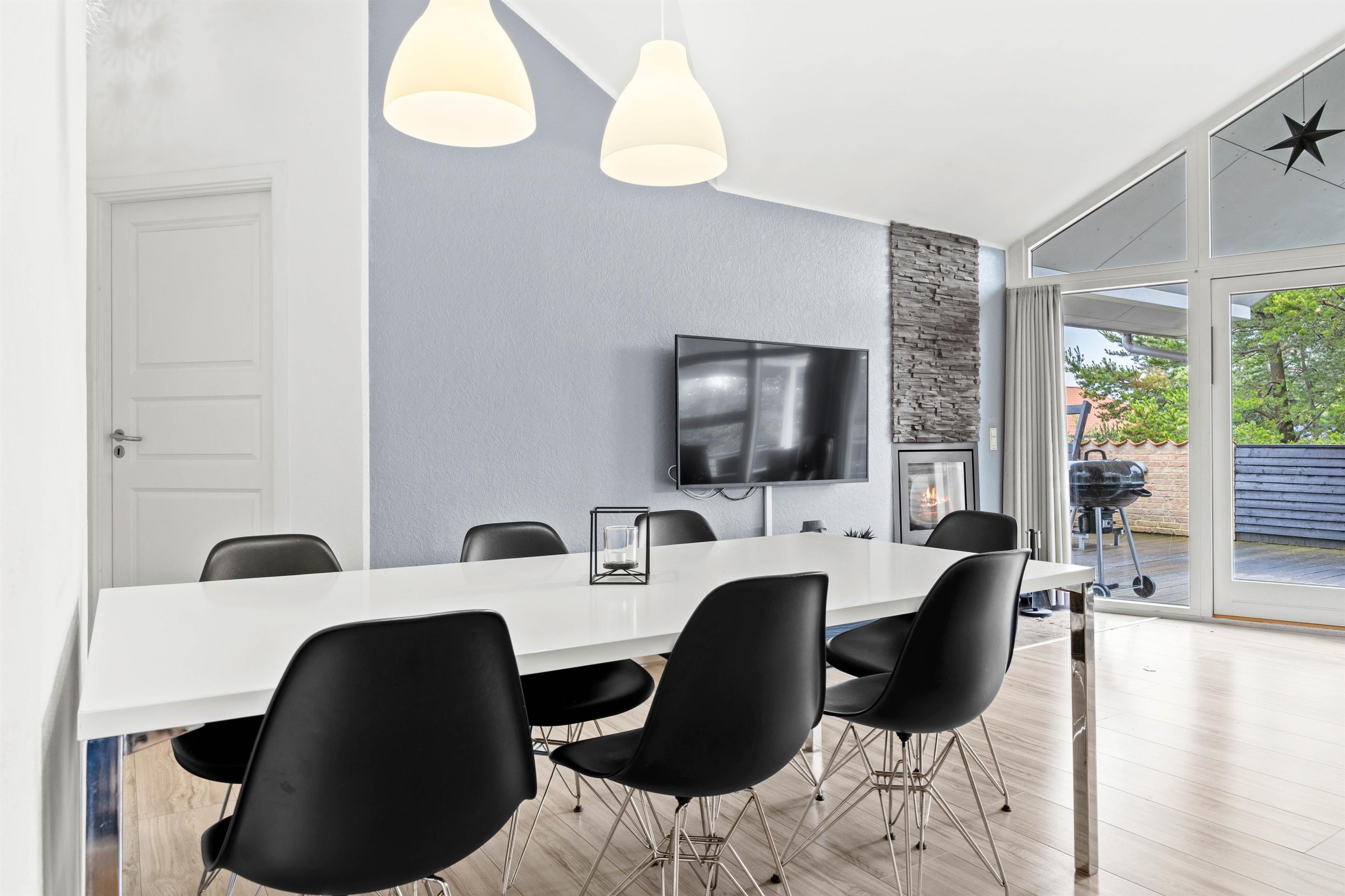 På Vibevej 8 ligger dette utrolig hyggelige feriehus med et godt køkkenalrum med komfortable møbler og plads til alle gæster ved spisebordet. Her kan op mod otte feriegæster folde sig ud på de 119 m2. Køkkenalrummet, feriens samlingspunkt, forenes med den hyggelige stue, hvor de store vinduespartier bidrager med et fantastisk lysindfald. Farverne er holdt i sort/hvide nuancer, og i sofaen kan I flade ud med en god film på fladskærmen. Hyg jer med madlavning i køkkenet eller brætspil omkring bordet – mulighederne er mange for at skabe nogle dejlige ferieminder med dine nærmeste.