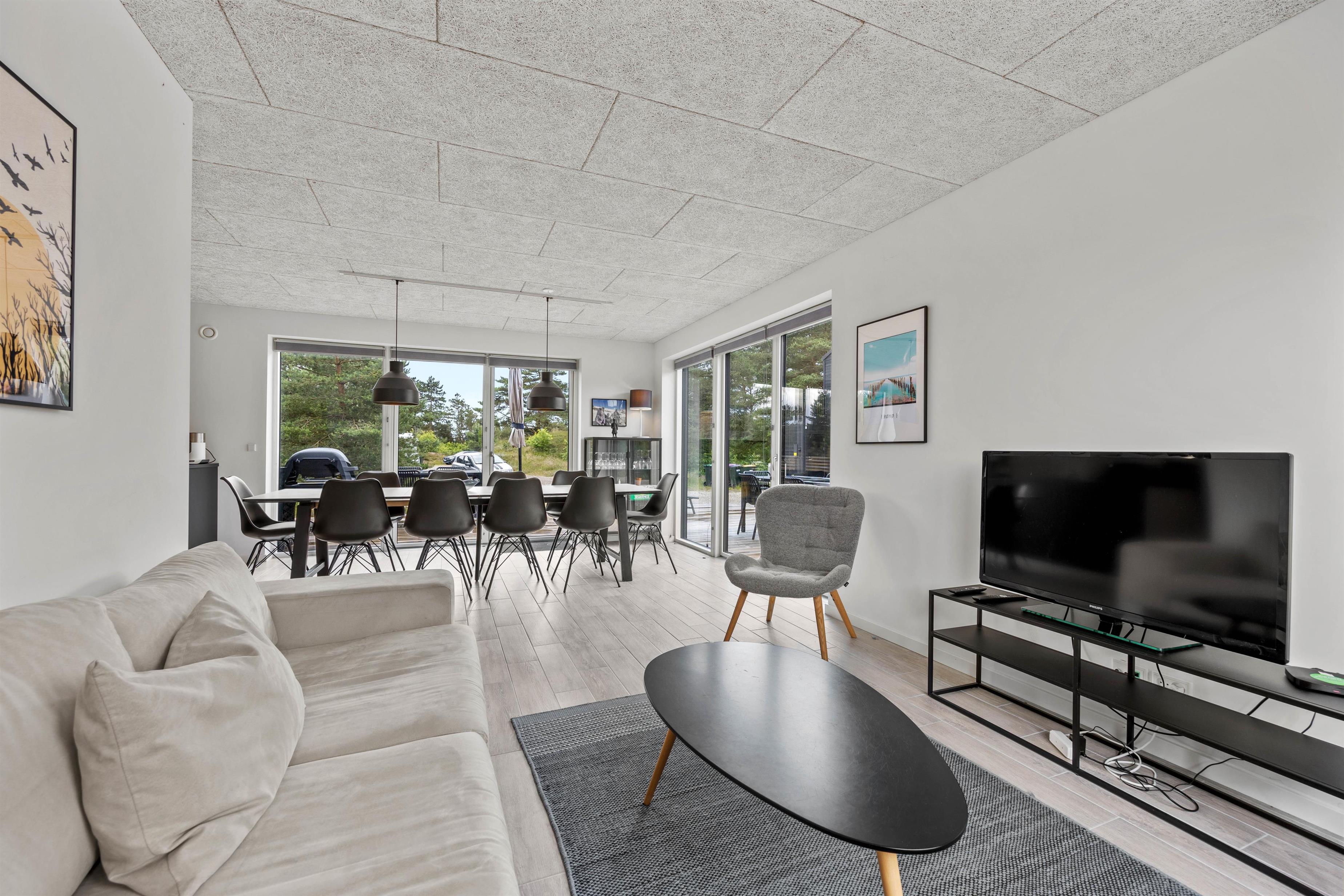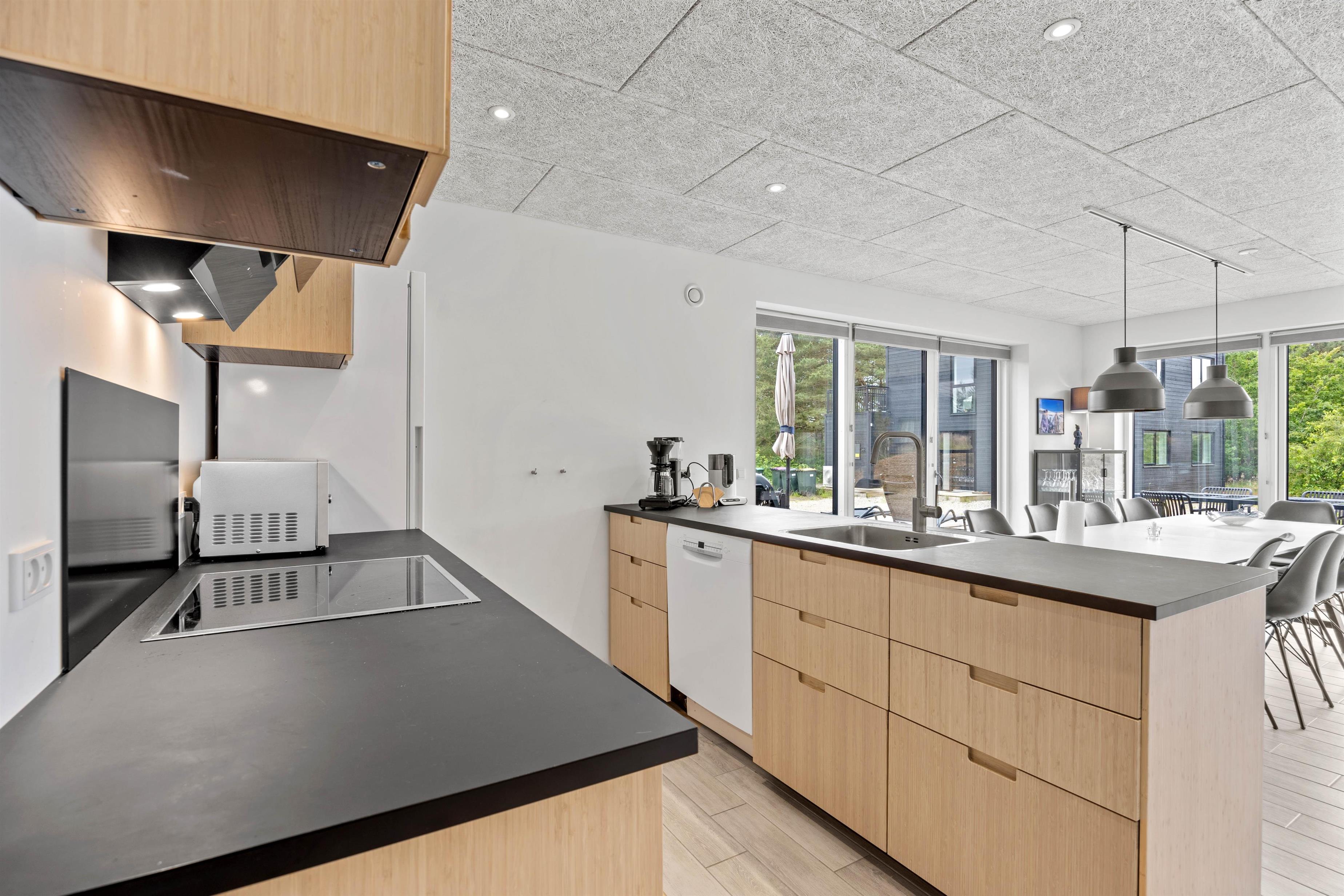 I sommerhuset på Rømø, Sønderby Huk 19 føler man feriestemningen straks, man træder ind ad døren. Den lyse indretning og brede vinduespartier giver et let og luftigt miljø og et fint lysindfald. Stue med sofagruppe, spiseplads og køkken er åbent i forbindelse med hinanden, så opholdsområdet bliver hurtigt jeres fælles mødested. Køkkenet er fuldt udstyret med en opvaskemaskine, og der er både vaskemaskine og tørretumbler til rådighed, så I slipper for at bekymre jer om vasketøjet. Den omkostnings- og energibesparende varmepumpe sørger for behagelige temperaturer i feriehuset.