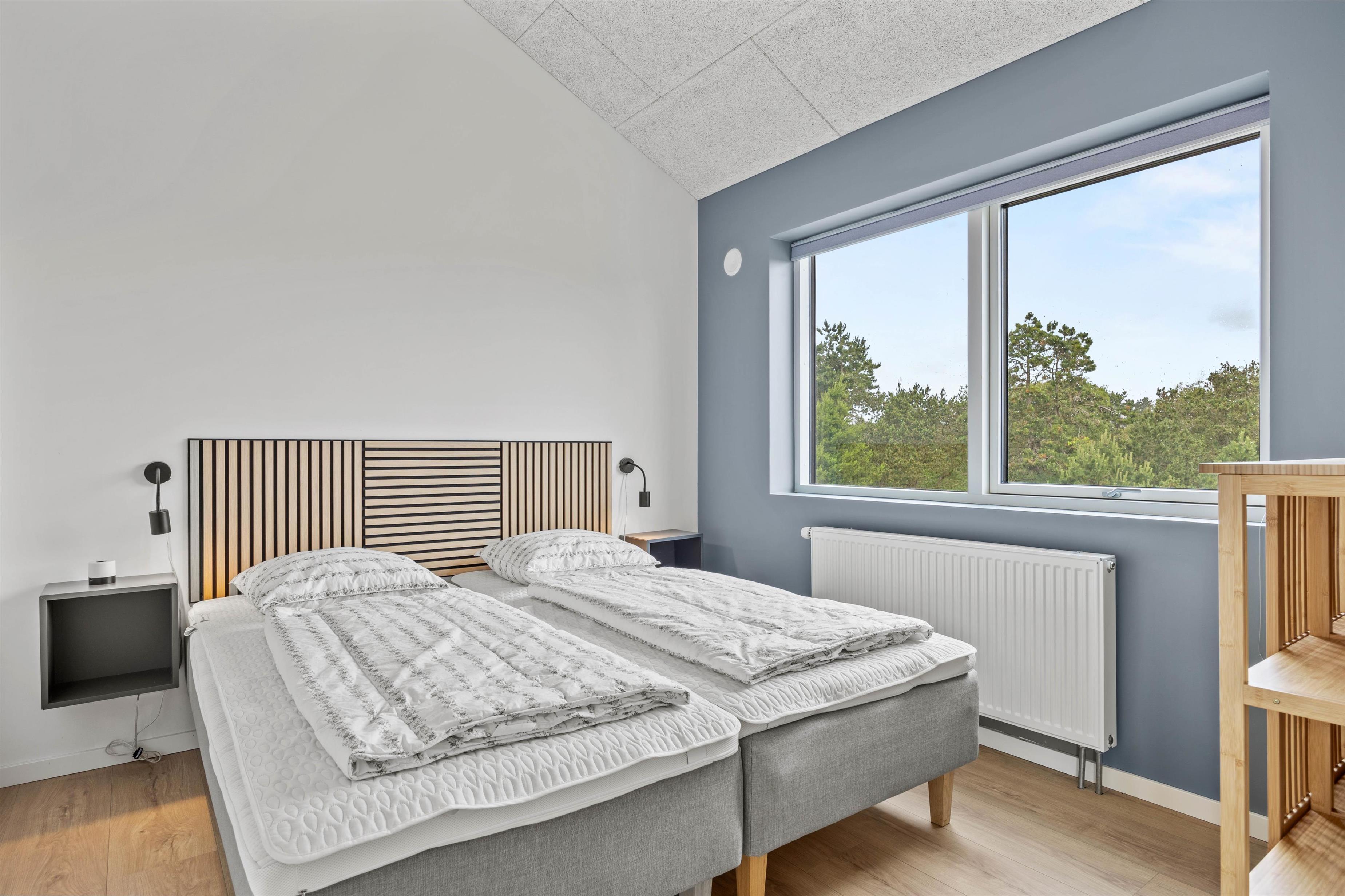 Der er 2 badeværelser med gulvvarme, og i forbindelse med det ene- er der også sauna. I forening med udespaen kan I arrangere jeres egen lille wellnessaften, hvorefter I vil være blevet rigtig godt afslappede. I feriehuset er 4 soverum, 1 i stueetagen og 3 på 1. sal. I finder 2 dobbeltsenge, 2 enkeltsenge, 1 etageseng og de sidste to sovepladser finder i oppe på hemsen, hvor der ligger to madrasser - så der er rig mulighed for at fordele sovepladserne, som det passer jer bedst. Fra opholdsrummet på 1. sal har I en skøn udsigt over området.