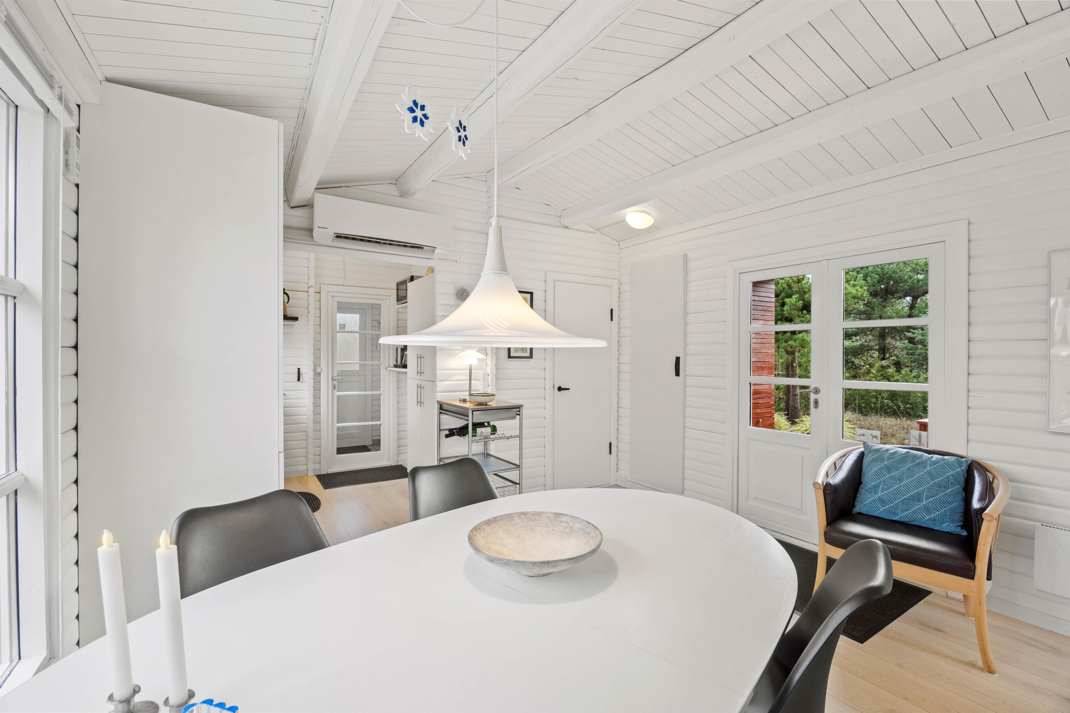 Opholdsstuen er indbydende med en nøje udvalgt indretning, der skaber en hyggelig atmosfære. En moderne og effektiv varmepumpe sørger for behagelig varme, hvis der er behov for det, og til de hyggelige film aftener er huset også udstyret med en Chromecast.