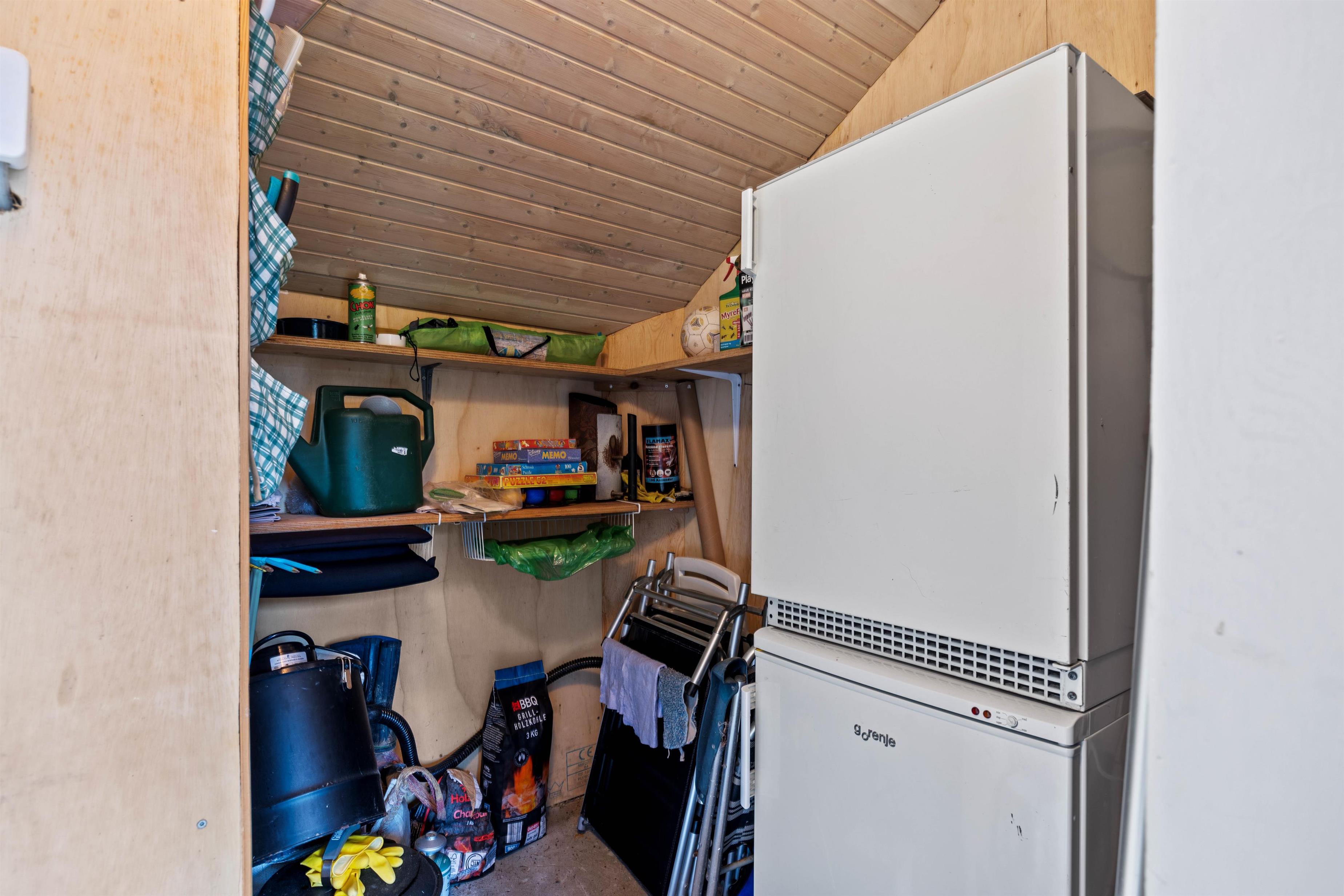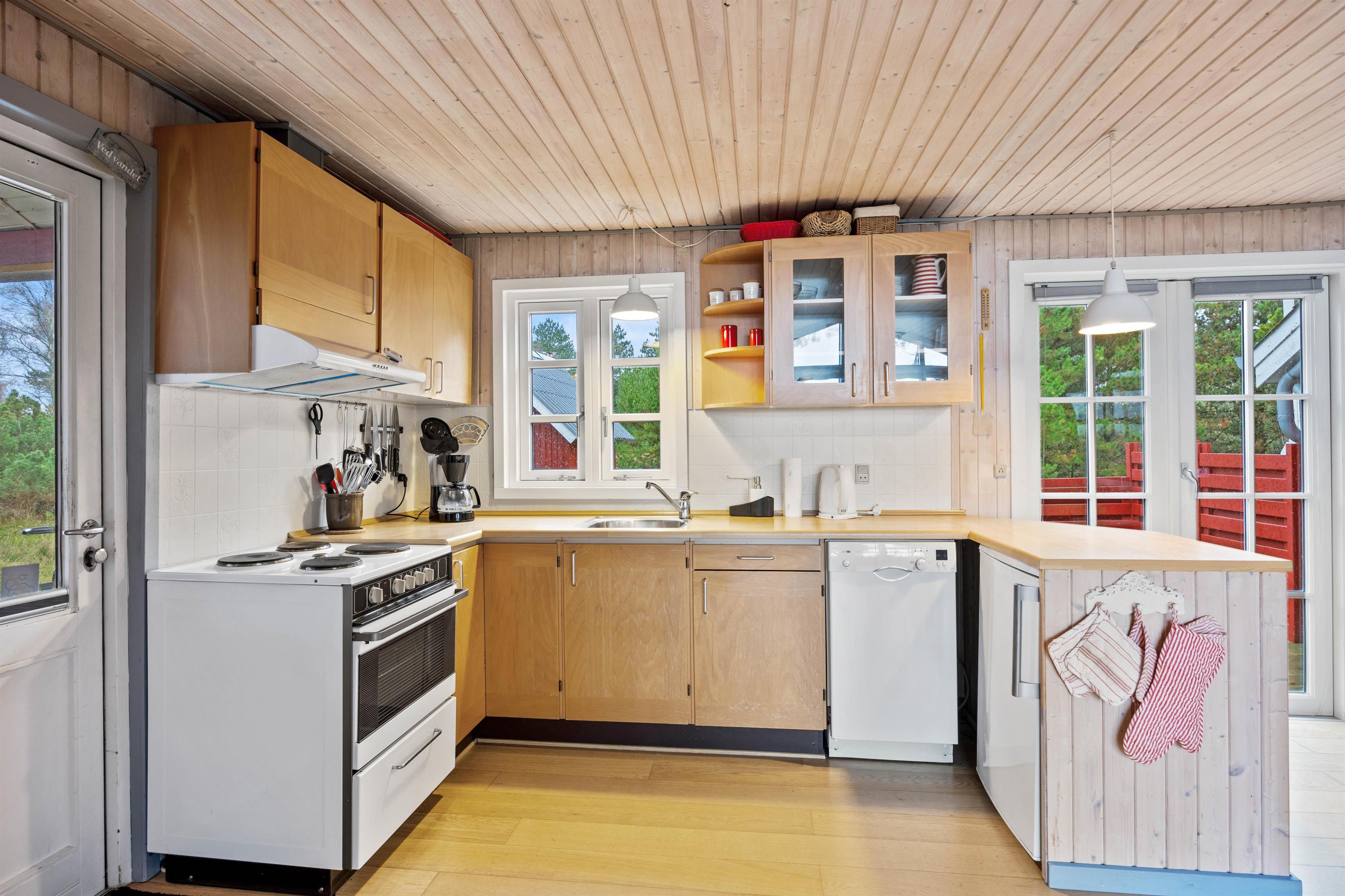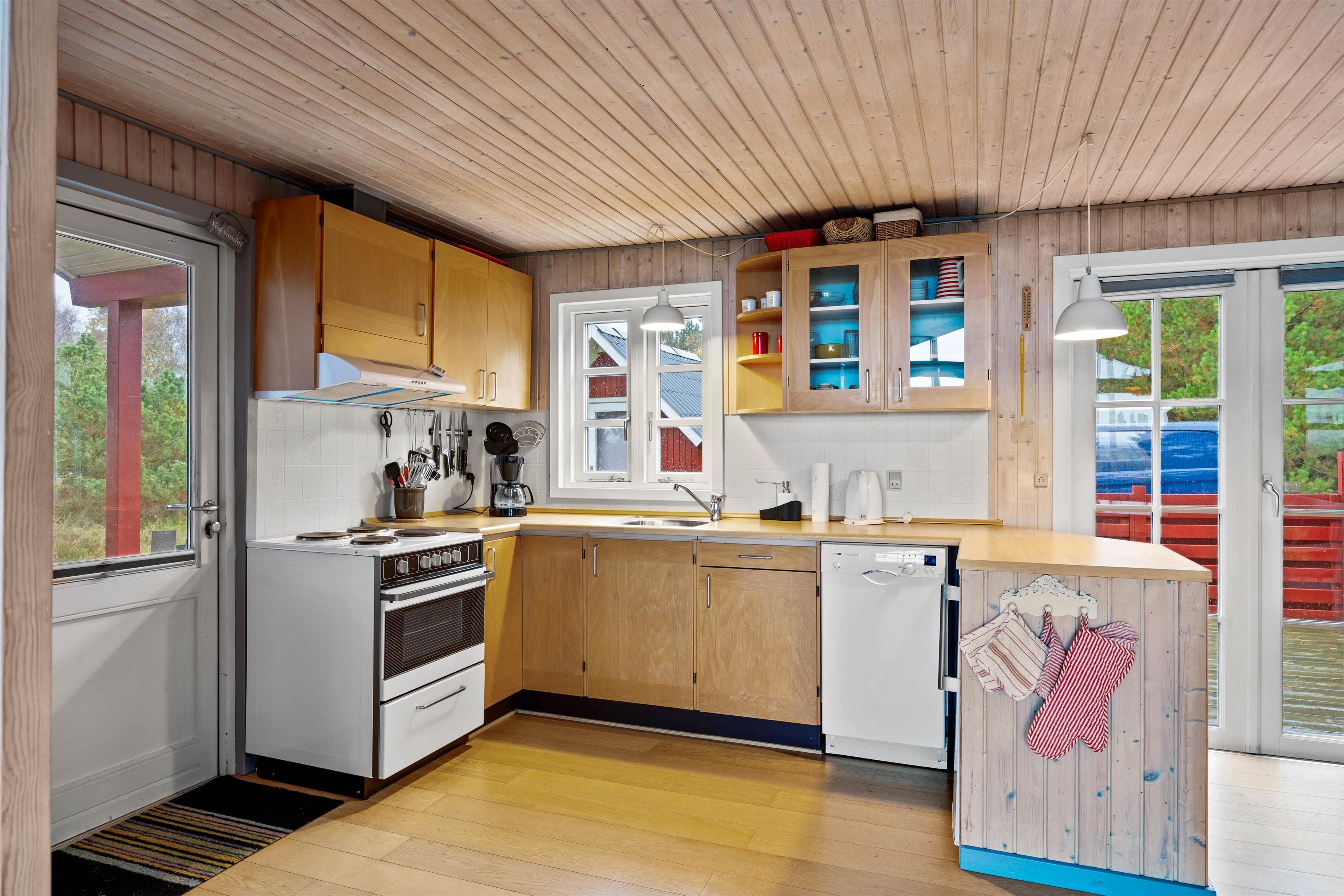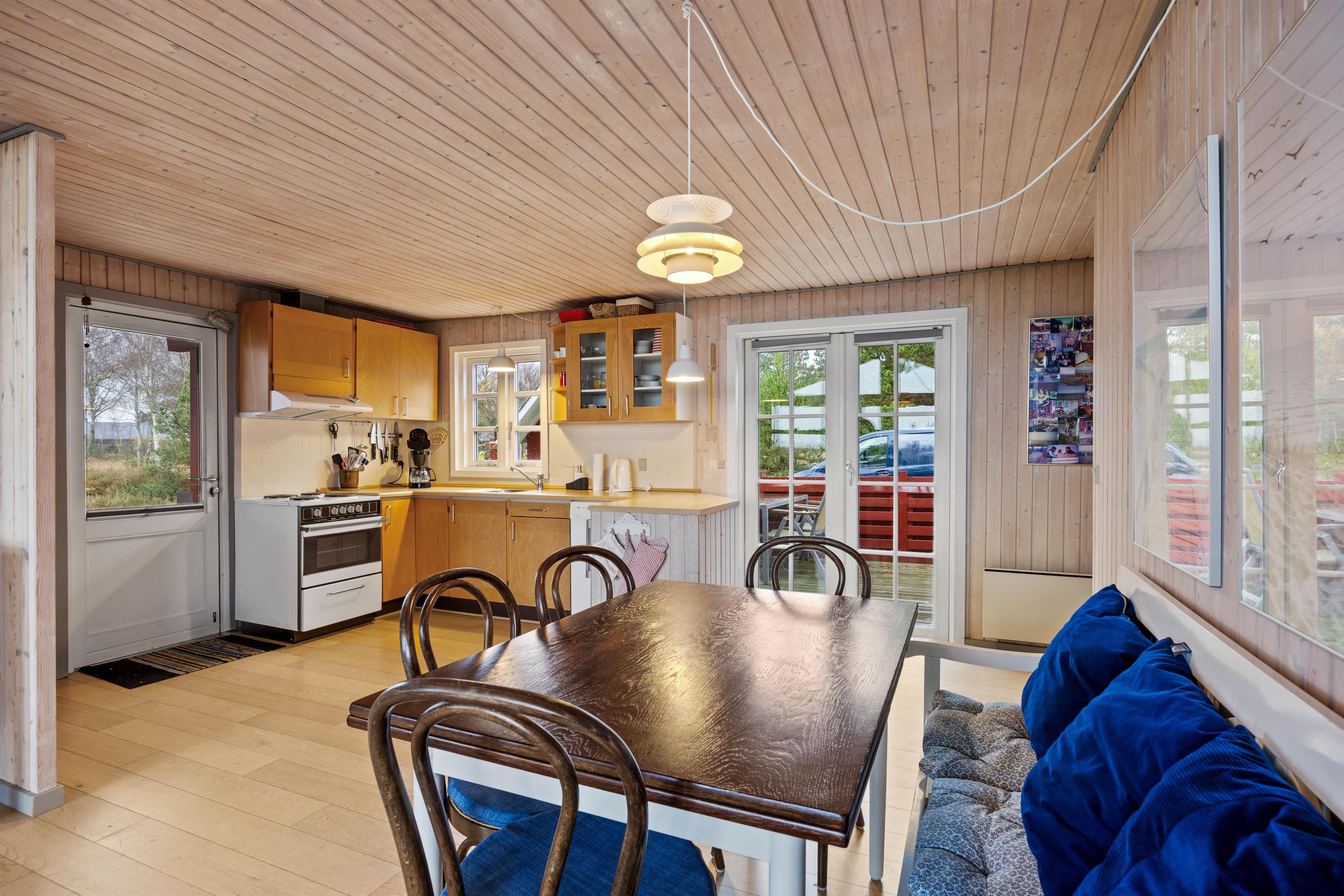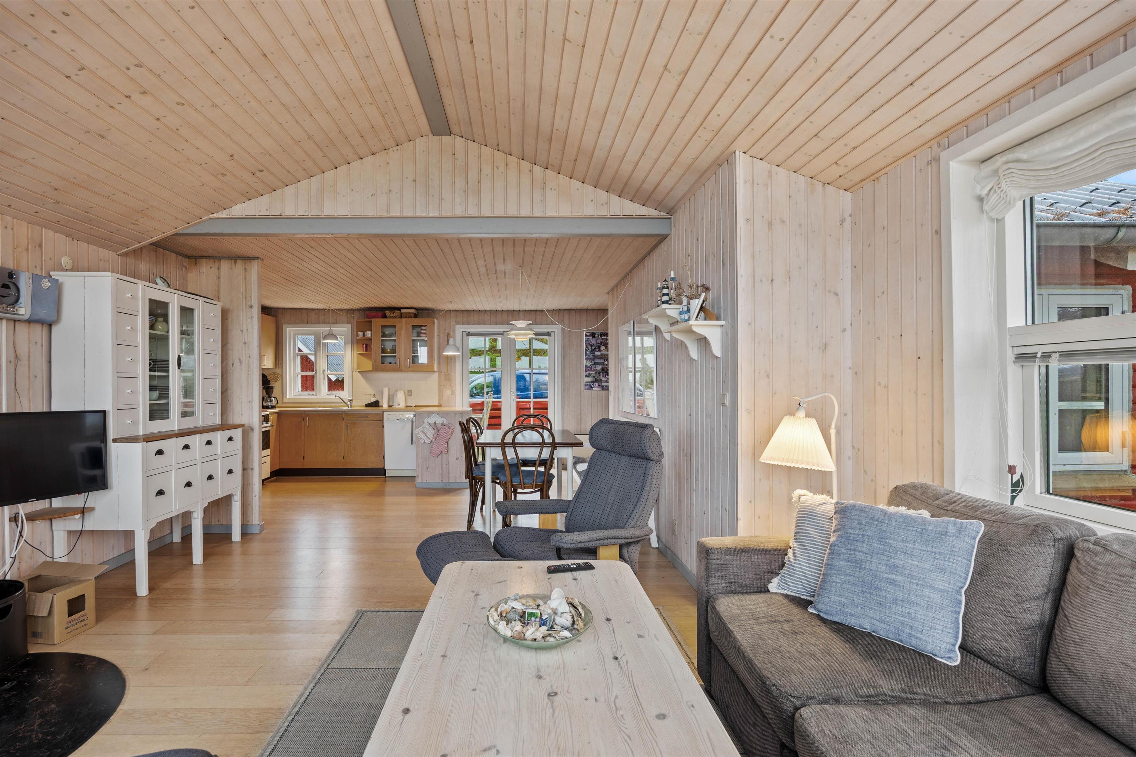 Det 62 m² store hus kombinerer klassisk charme med praktisk komfort. 2 soveværelser med henholdsvis dobbeltseng og køjeseng skaber en hyggelig atmosfære. Det åbne opholds- og spisestueområde med træbeklædte vægge giver varme og afslapning. Køkkenet er fuldt udstyret med bl.a. opvaskemaskine og fryser i køleskabet, og der er både vaskemaskine og tørretumbler til rådighed. På kølige aftener skaber brændeovnen hyggelig varme, mens terrassen inviterer til solrige stunder og hyggelige grillmiddage udendørs.