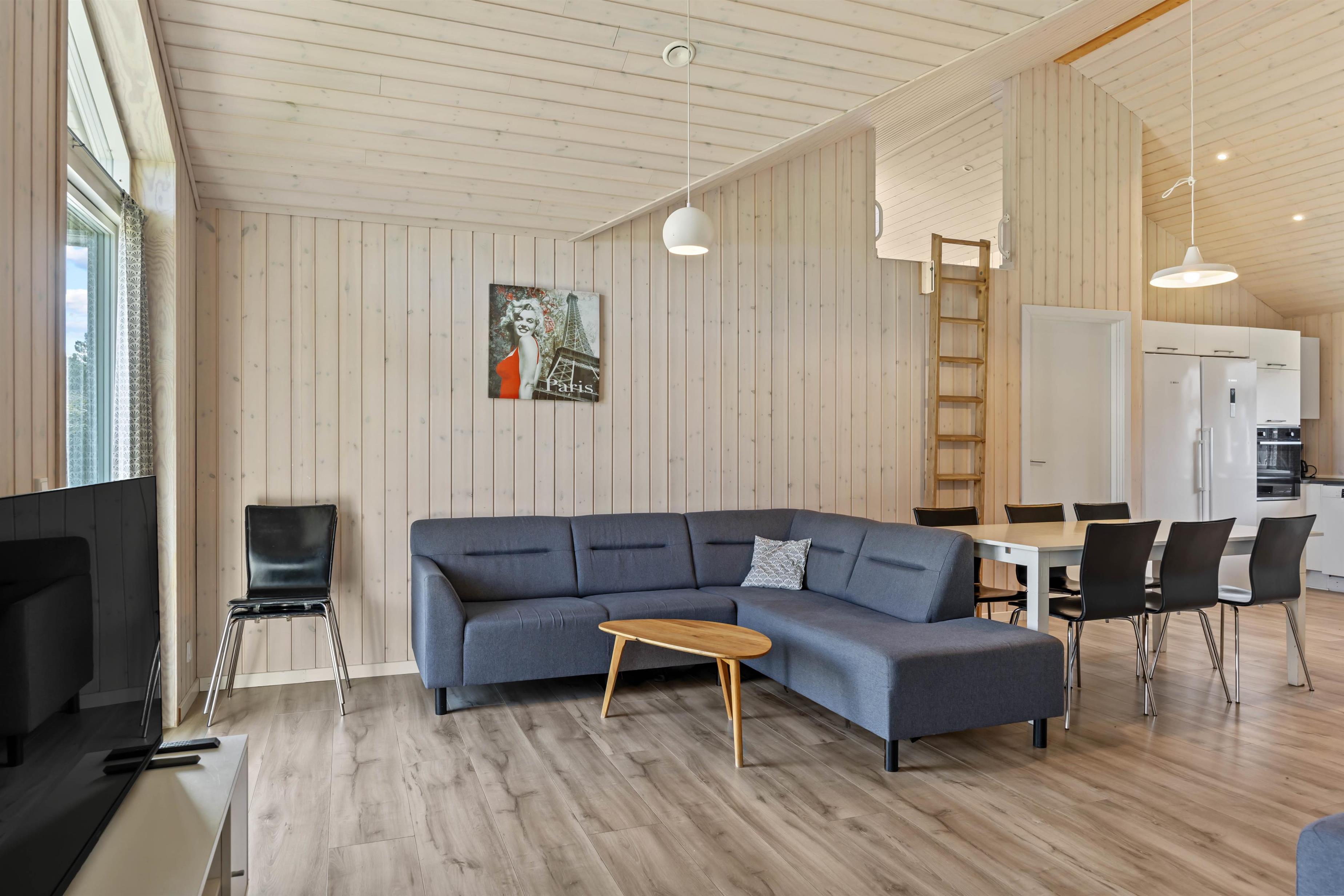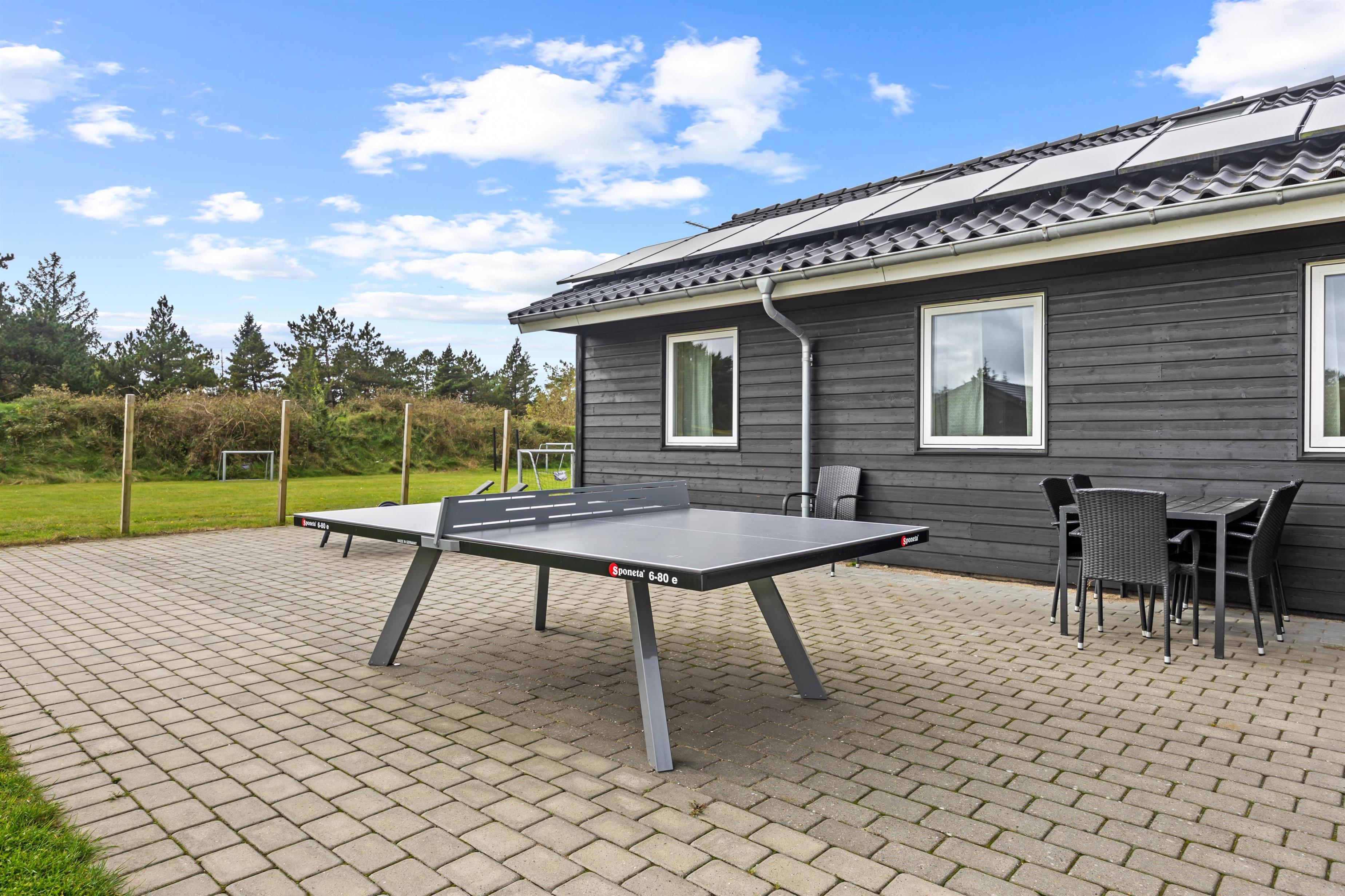 Feriehuset ligger på en 1400m² stor naturgrund, der giver rigelig plads til udendørs aktiviteter. En gynge og en sandkasse sørger for glade børn, mens I kan slappe af på den åbne eller overdækkede terrasse. Havemøblerne indbyder til en fælles grillaften under åben himmel. Til indkøb behøver I kun at gå knap 500 meter og til badestranden er der kun 2,5 km - ideelt til spontane ture til havet. Der er desuden fodboldmål og boule i haven.