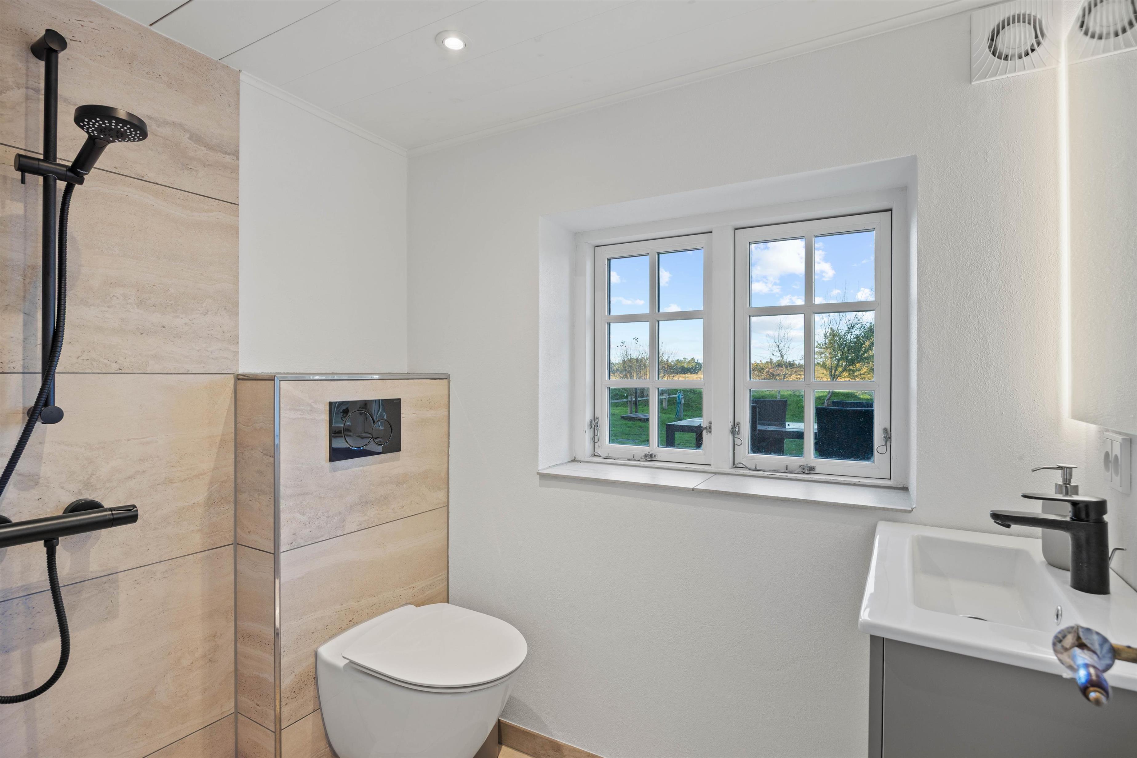 Åben terrasse med udsigt udover markerne samt udendørsbruser