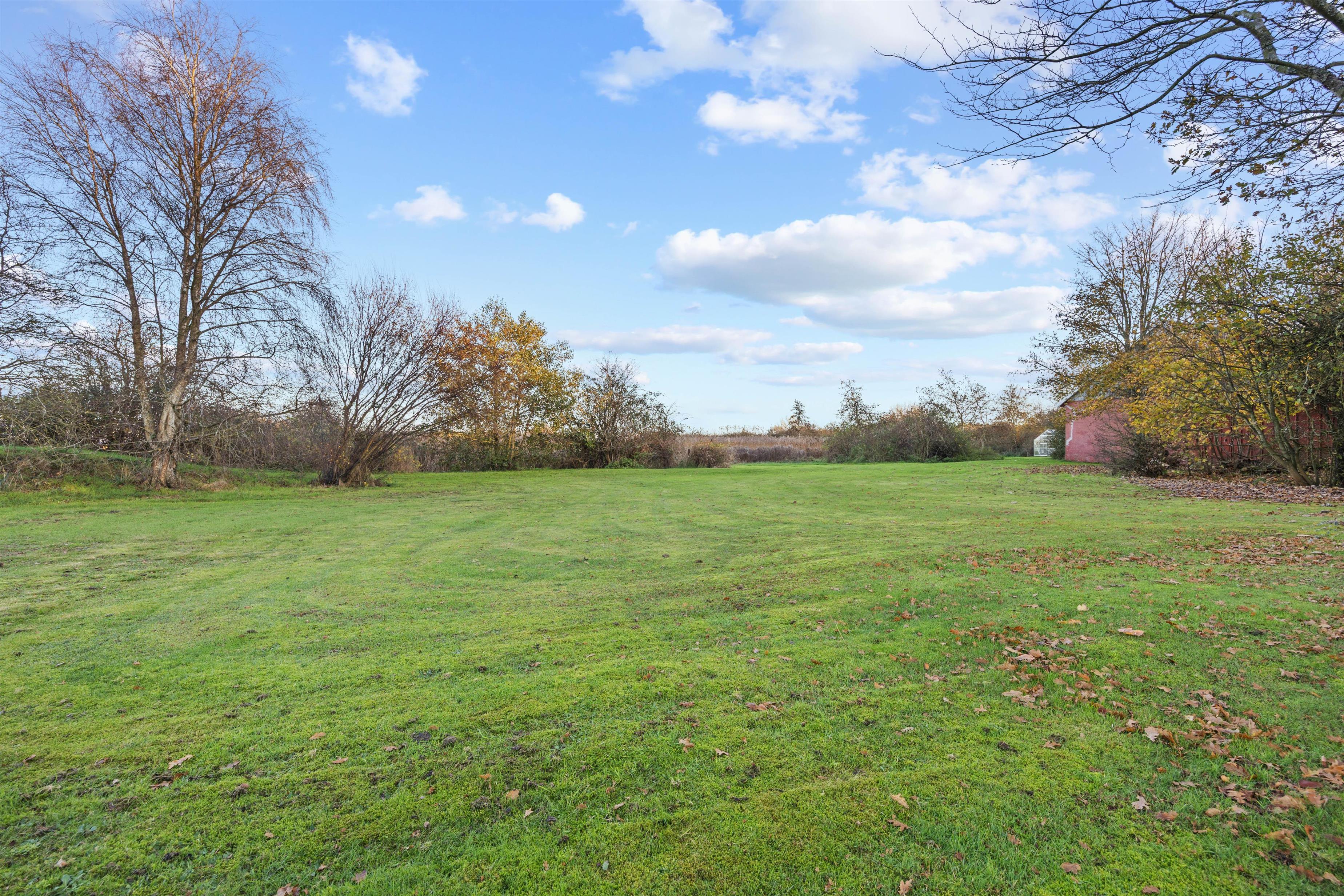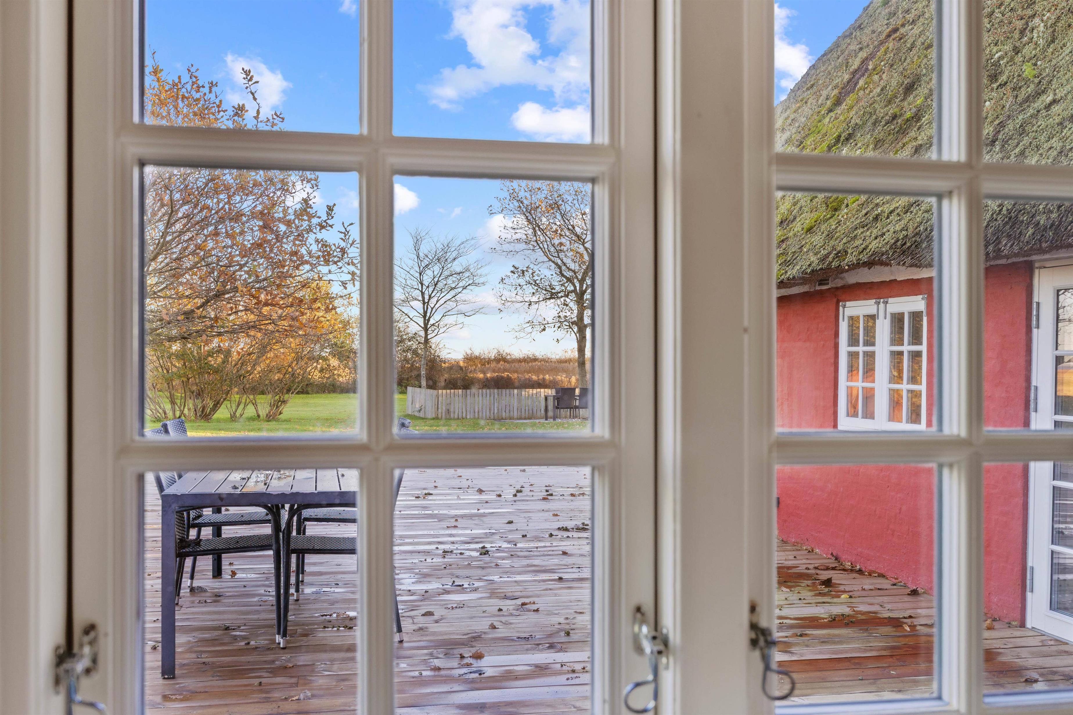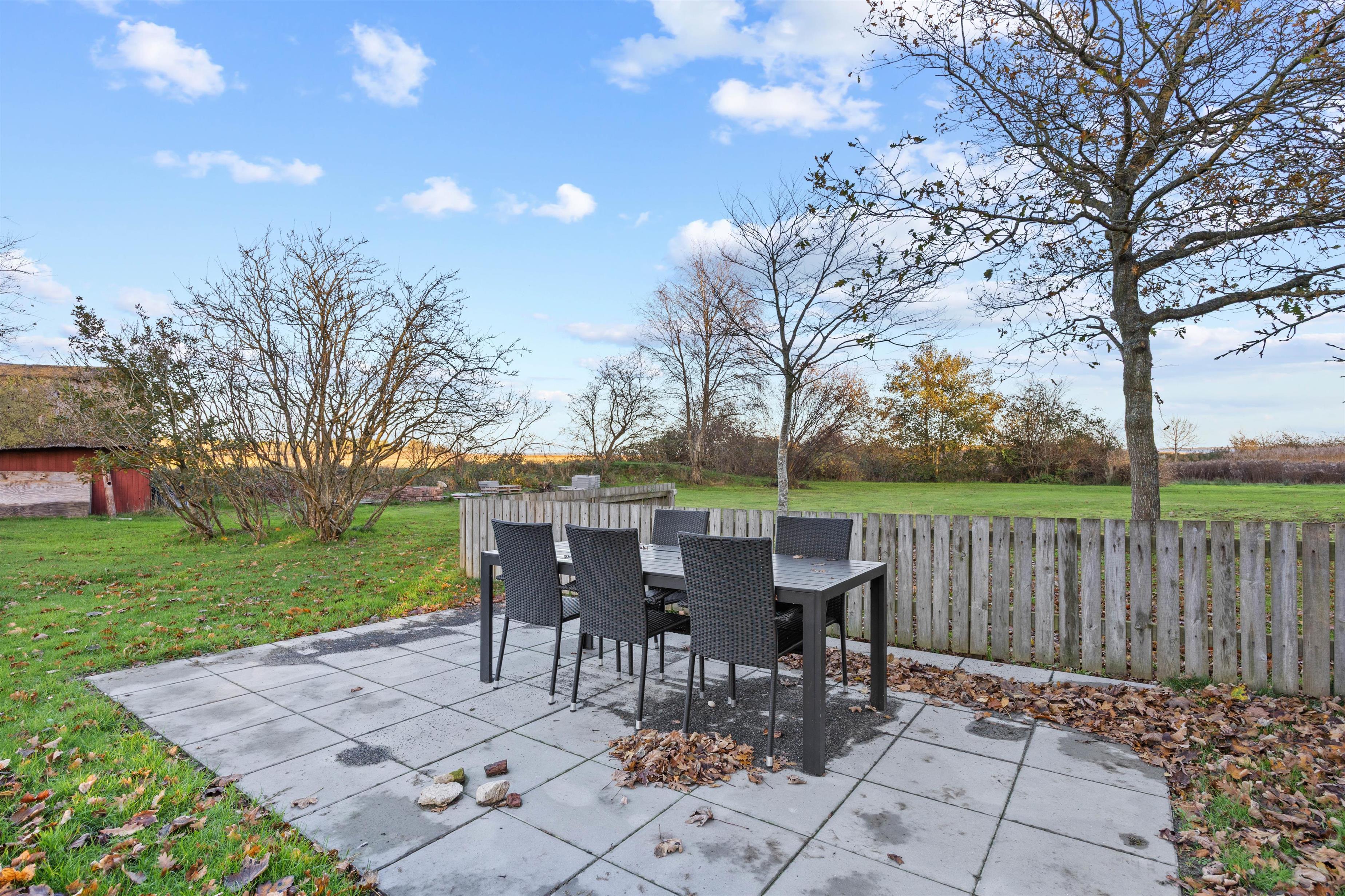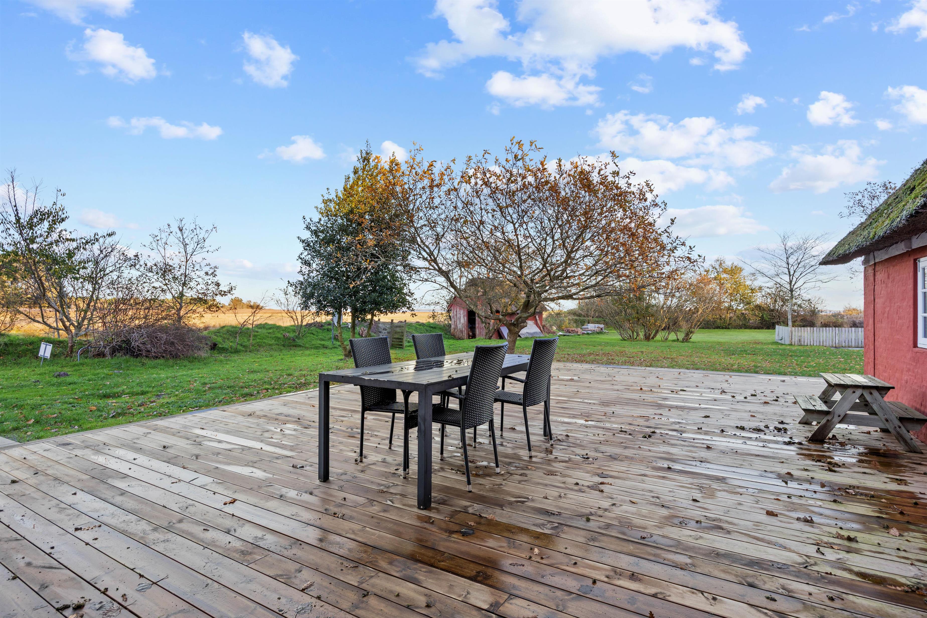 Fra køkken og stue er der udgang til den store terrasse. Feriehusets er beliggende på en 2100 m2 stor naturgrund, omgivet af grønne marker så langt øjet rækker. Træterrassen indbyder til hyggelige timer med en friskbrygget kop kaffe, mens børnene leger på den grønne plæne. På de lune sommeraftner, kan I tænde op i gasgrillen og nyde et lækkert måltid udenfor – dét er ægte sommerhygge!