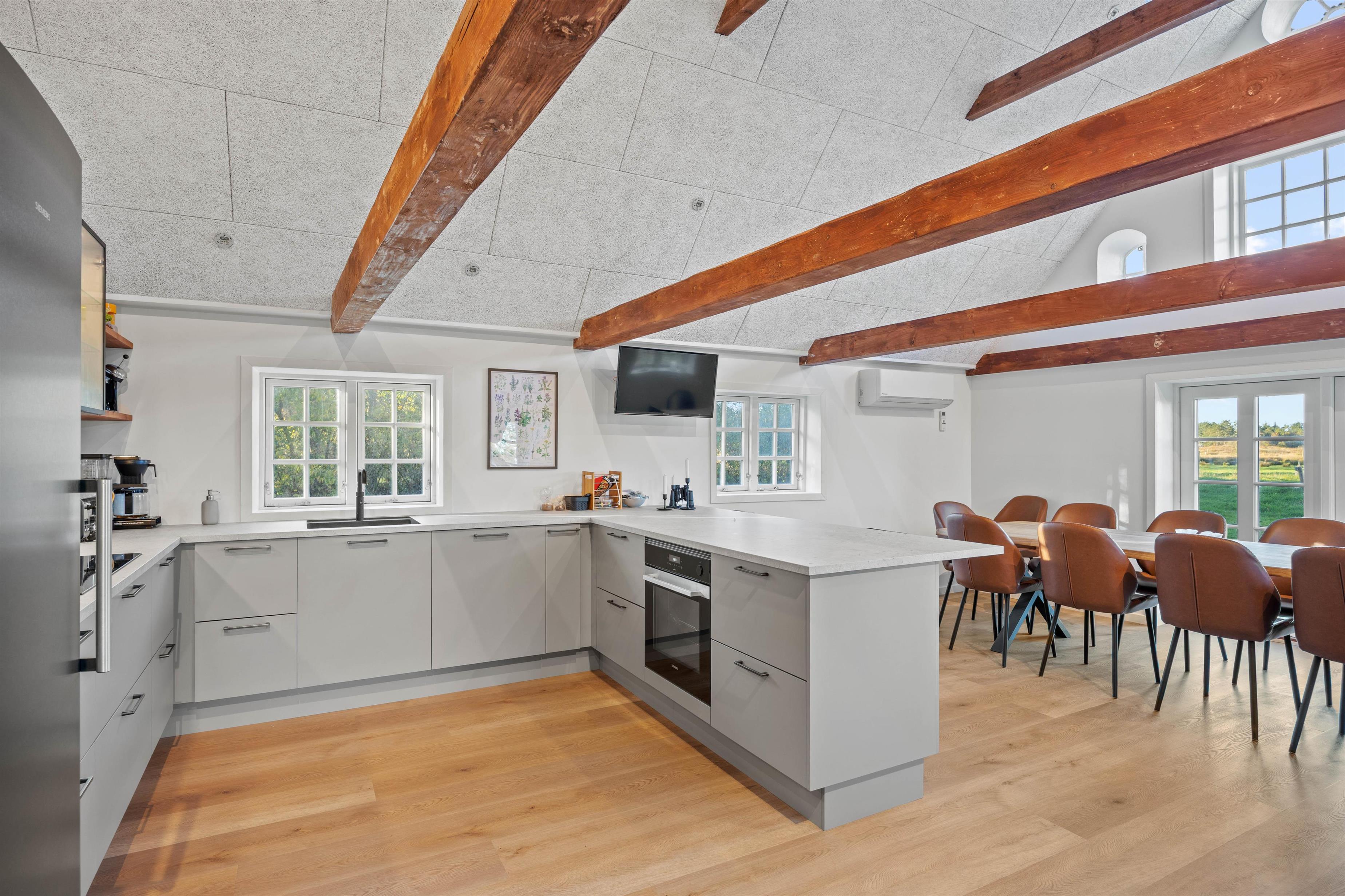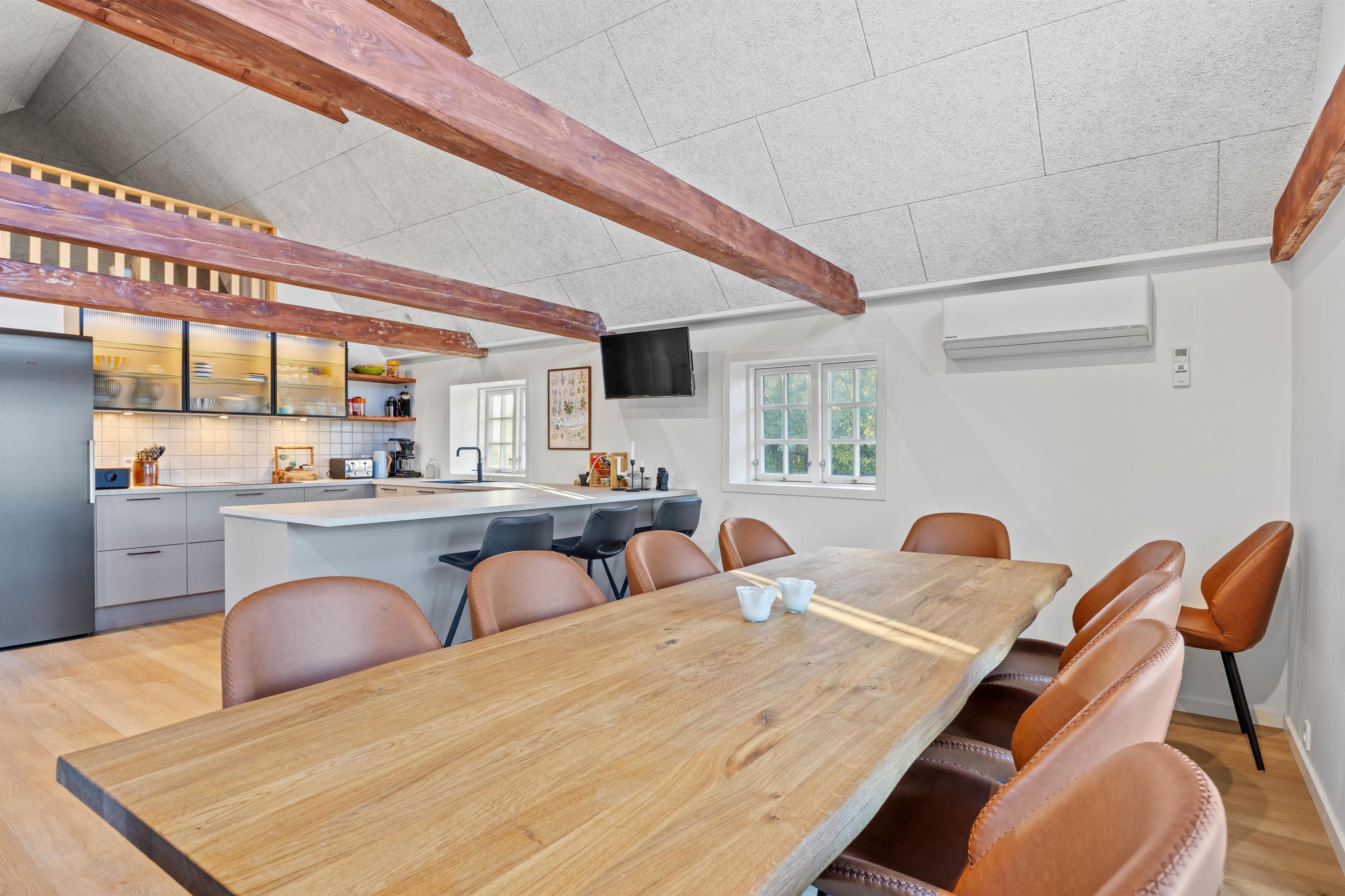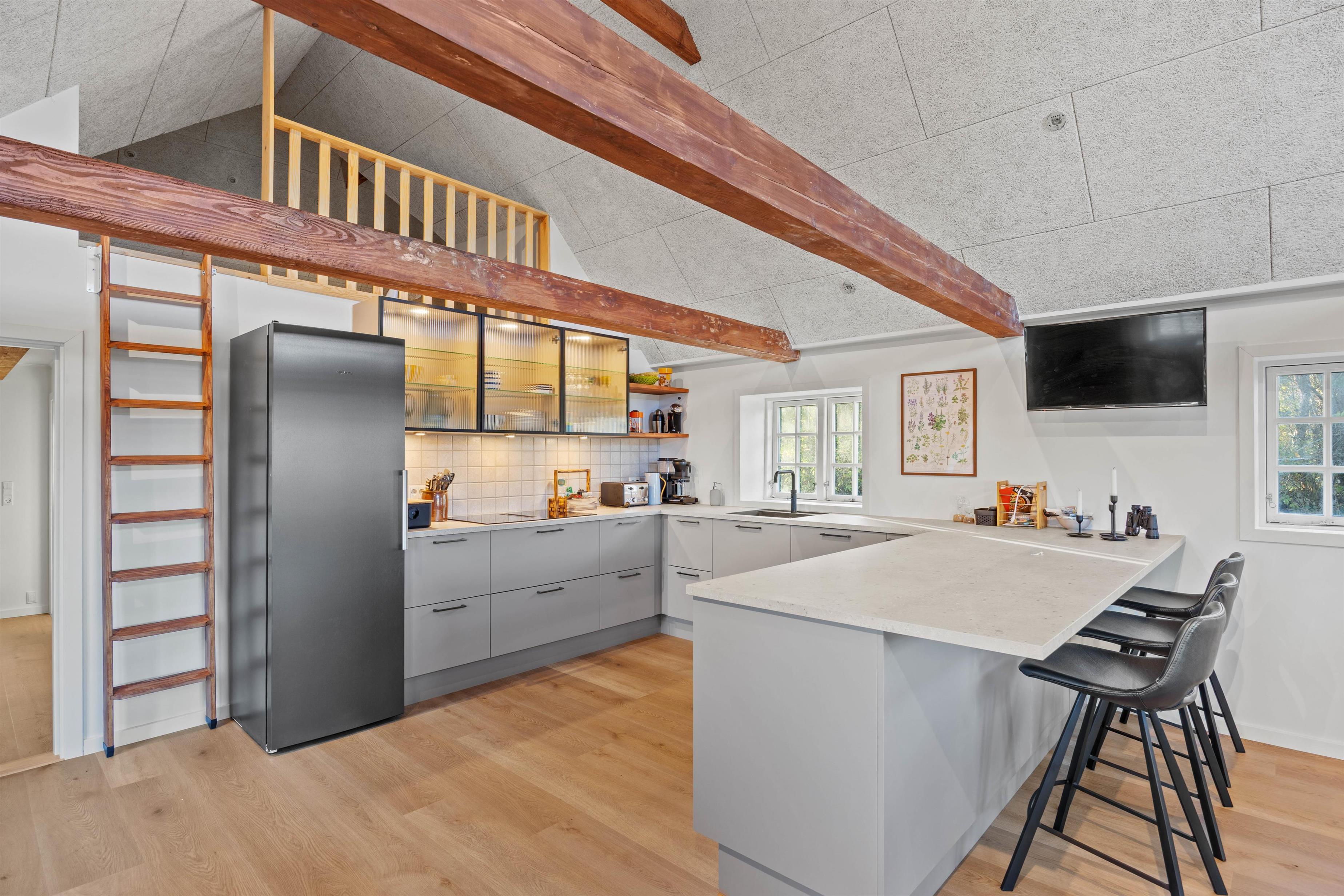 I stuen er der plads til, at hele familien kan samles. Flyd ud på sofaen til en god film, spil et brætspil eller læs en god bog i lænestolen eller noget helt tredje – mulighederne er mange. Praktisk er her også en energibesparende varmepumpe, som sikrer et behageligt indeklima. I modsatte ende af huset, finder i køkken, spiseafdelingen og en stige, der fører op til hemsen. Et dejligt rum med højt til loftet, et lækkert samtalekøkken og et langbord, hvor den gode mad skal nydes. Køkkenet er udstyret med alt, man kunne få brug for – her er en 60L fryser og naturligvis opvaskemaskine. Meget praktisk har feriehuset også vaskemaskine og tørretumbler, så I altid har friske badehåndklæder.
