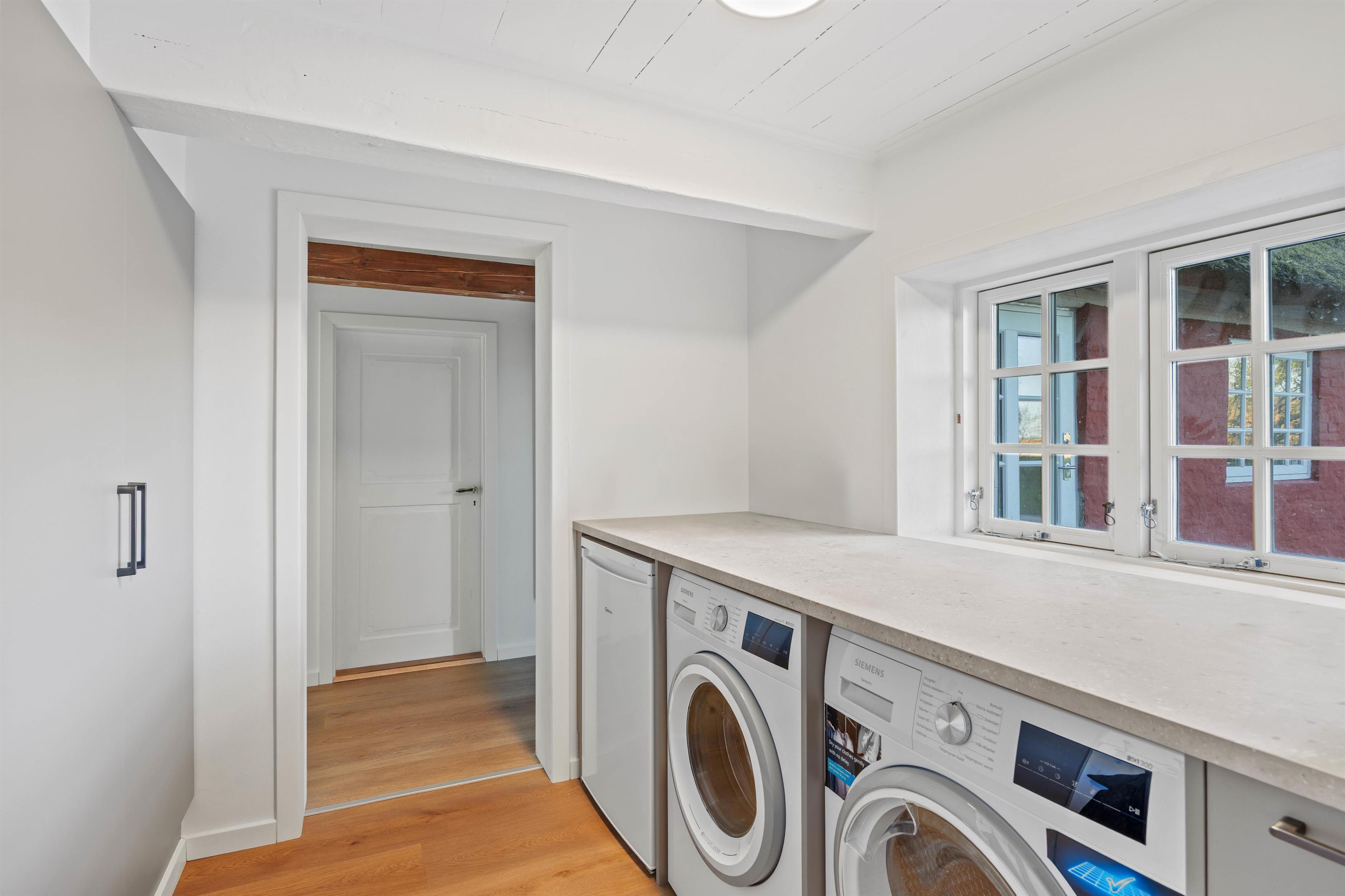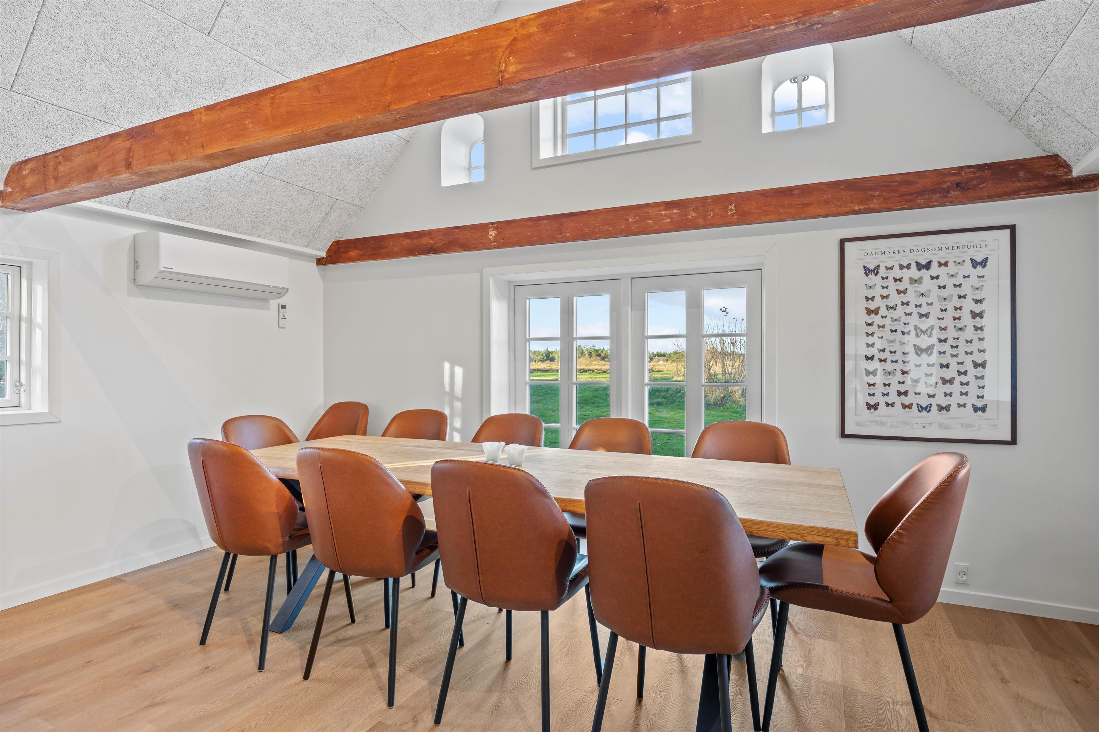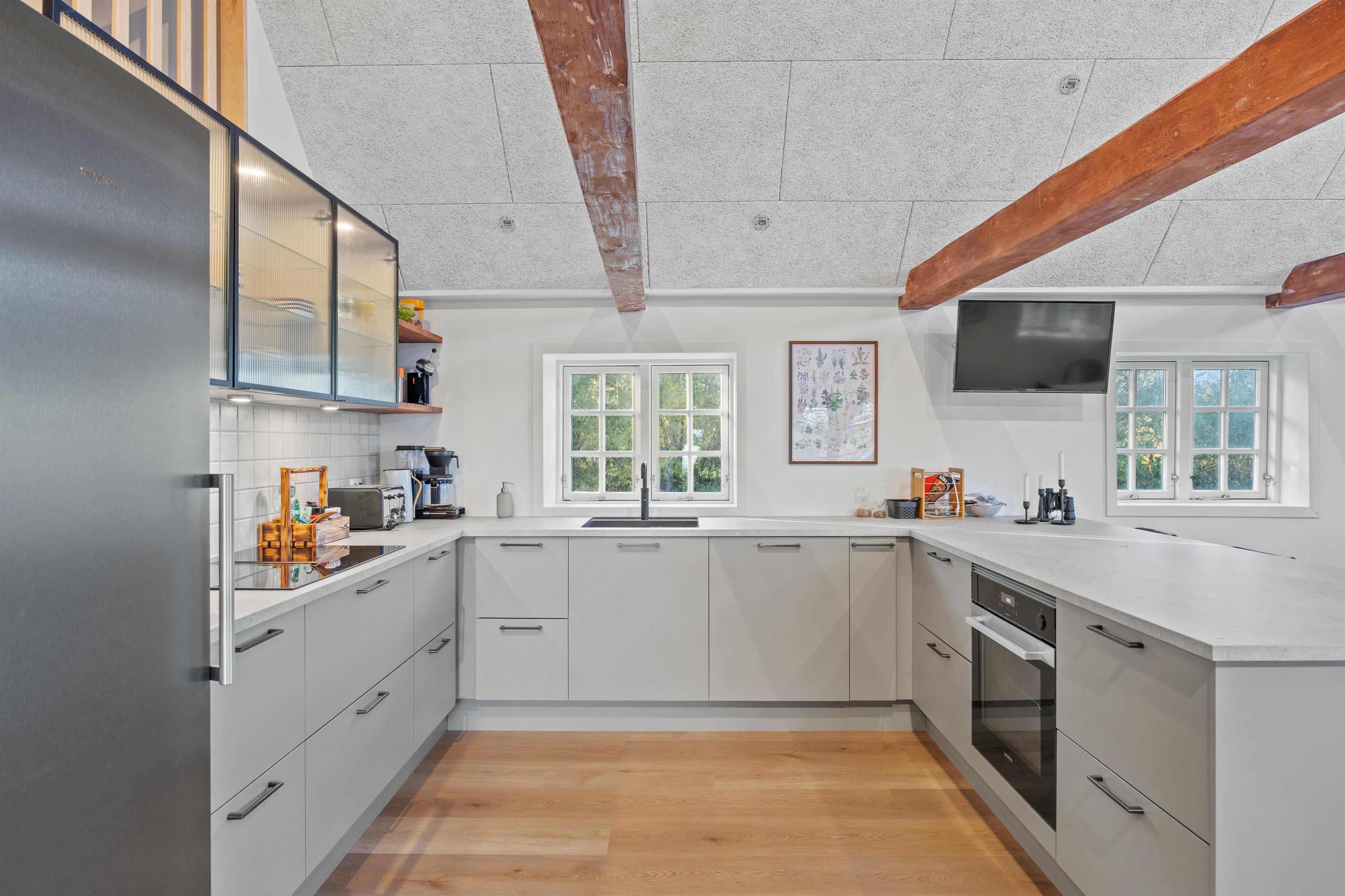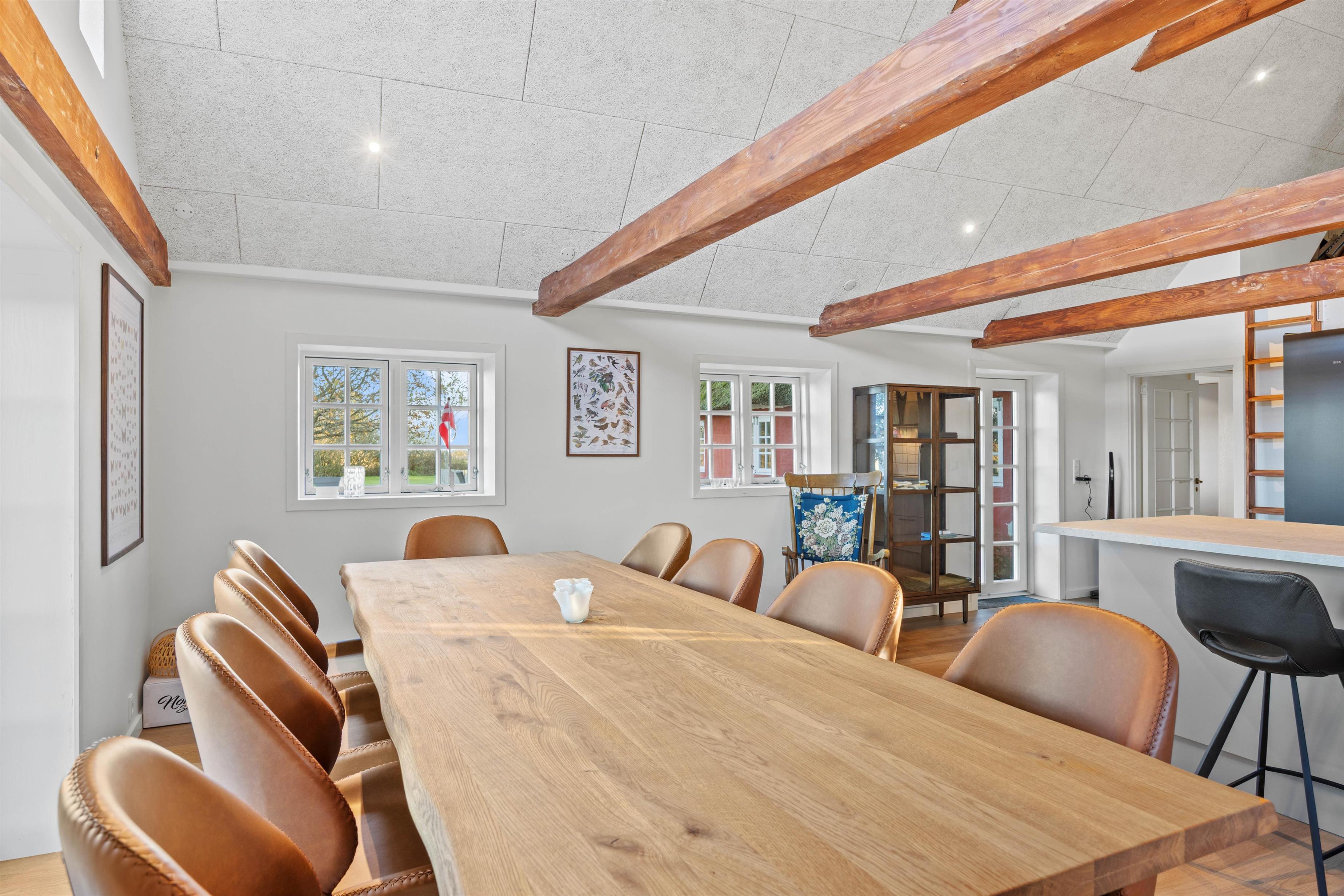 I stuen er der plads til, at hele familien kan samles. Flyd ud på sofaen til en god film, spil et brætspil eller læs en god bog i lænestolen eller noget helt tredje – mulighederne er mange. Praktisk er her også en energibesparende varmepumpe, som sikrer et behageligt indeklima. I modsatte ende af huset, finder i køkken, spiseafdelingen og en stige, der fører op til hemsen. Et dejligt rum med højt til loftet, et lækkert samtalekøkken og et langbord, hvor den gode mad skal nydes. Køkkenet er udstyret med alt, man kunne få brug for – her er en 60L fryser og naturligvis opvaskemaskine. Meget praktisk har feriehuset også vaskemaskine og tørretumbler, så I altid har friske badehåndklæder.