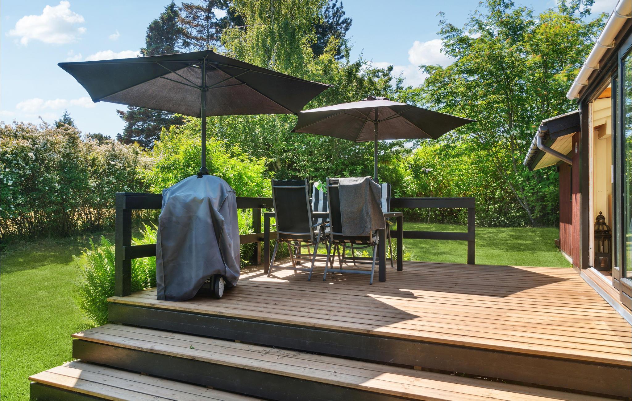 Udendørs venter en åben terrasse med havemøbler. På kølige dage kan I sætte jer i udestuen og nyde solens varme gennem vinduesvæggen, der kan trækkes til side.