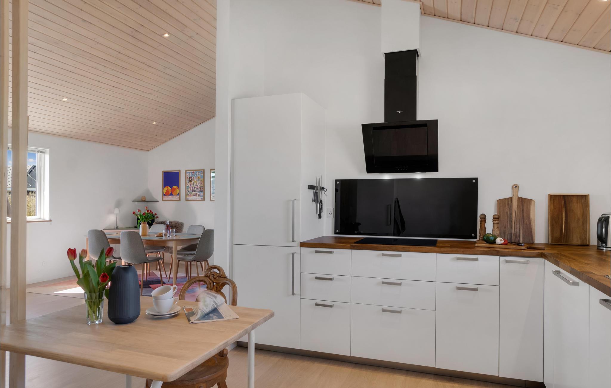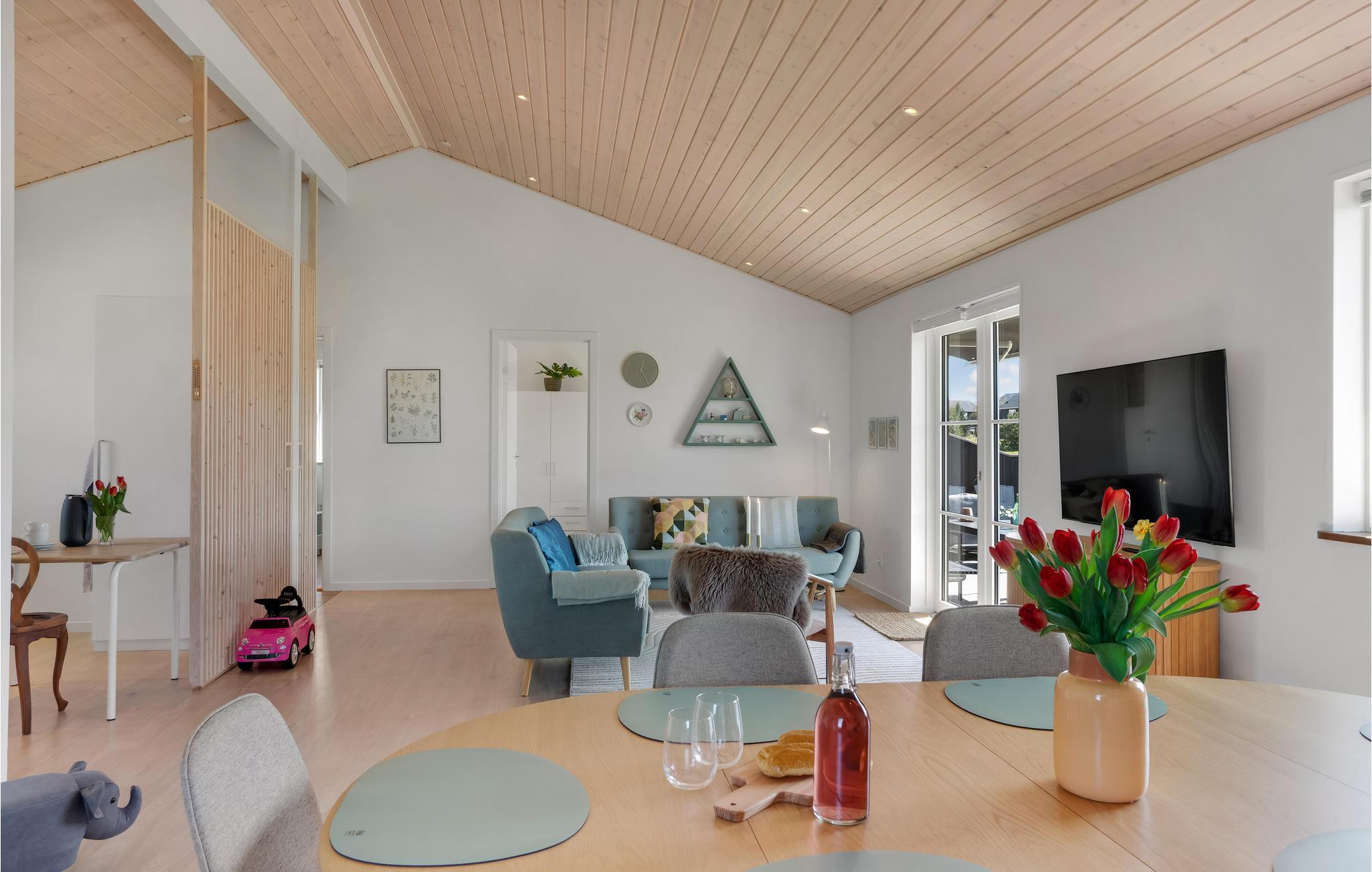 Det børnevenlige hus ligger i gåafstand til stranden. Sommerhuset danner den perfekte ramme om en aktiv ferie for hele familien. I de lyse værelser med loft til kip, moderne indretning, markante træelementer og skønne fællesområder vil I uden tvivl føle jer godt tilpas. Nyd sommerstemningen og glæd jer til hyggelige aftener i de indbydende sofaer.