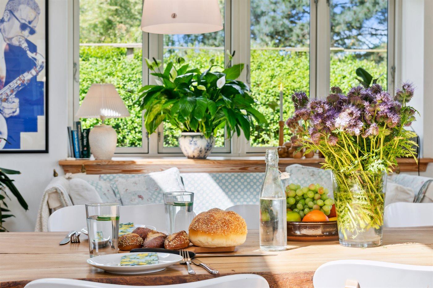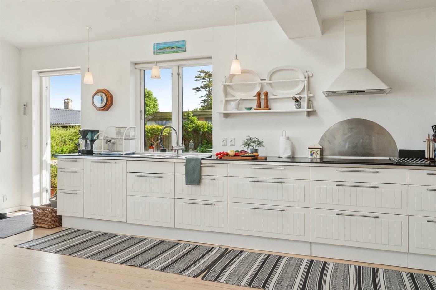 Køkkenet er udstyret med 1 køleskab. Der er 4 keramiske kogeplader, bageovn, mikrobølgeovn samt opvaskemaskine.