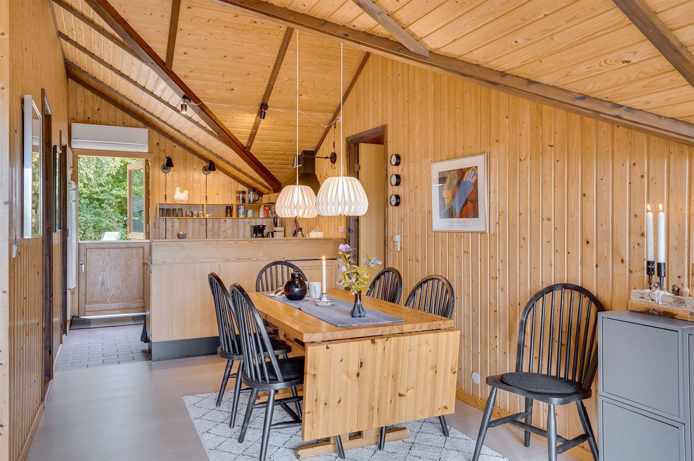 Hyggeligt sommerhus nær havet med terrasse, brændeovn og elbiloplader i naturskønt område.