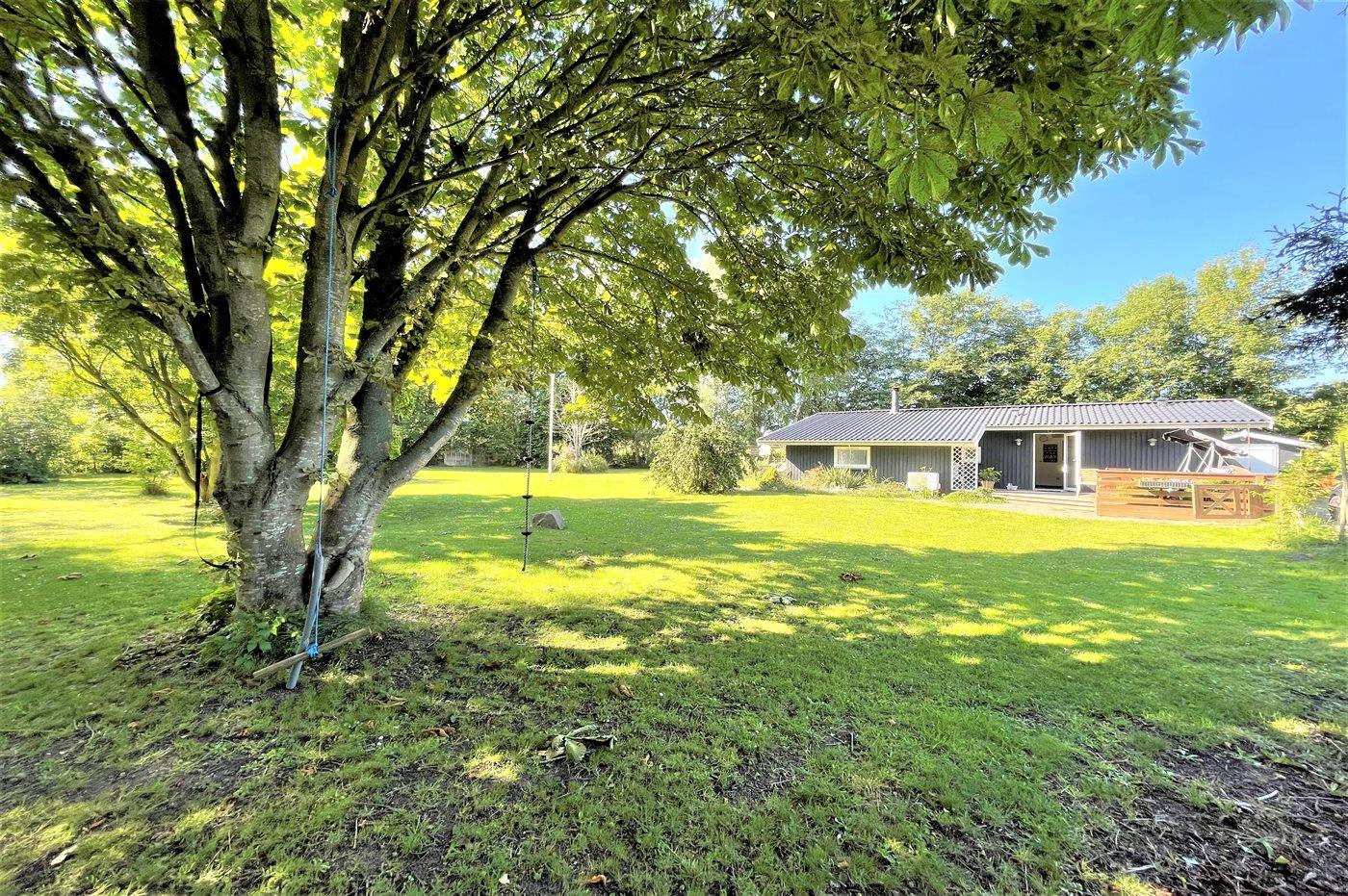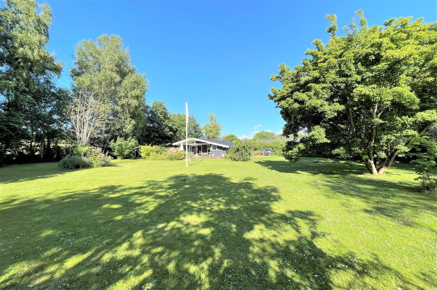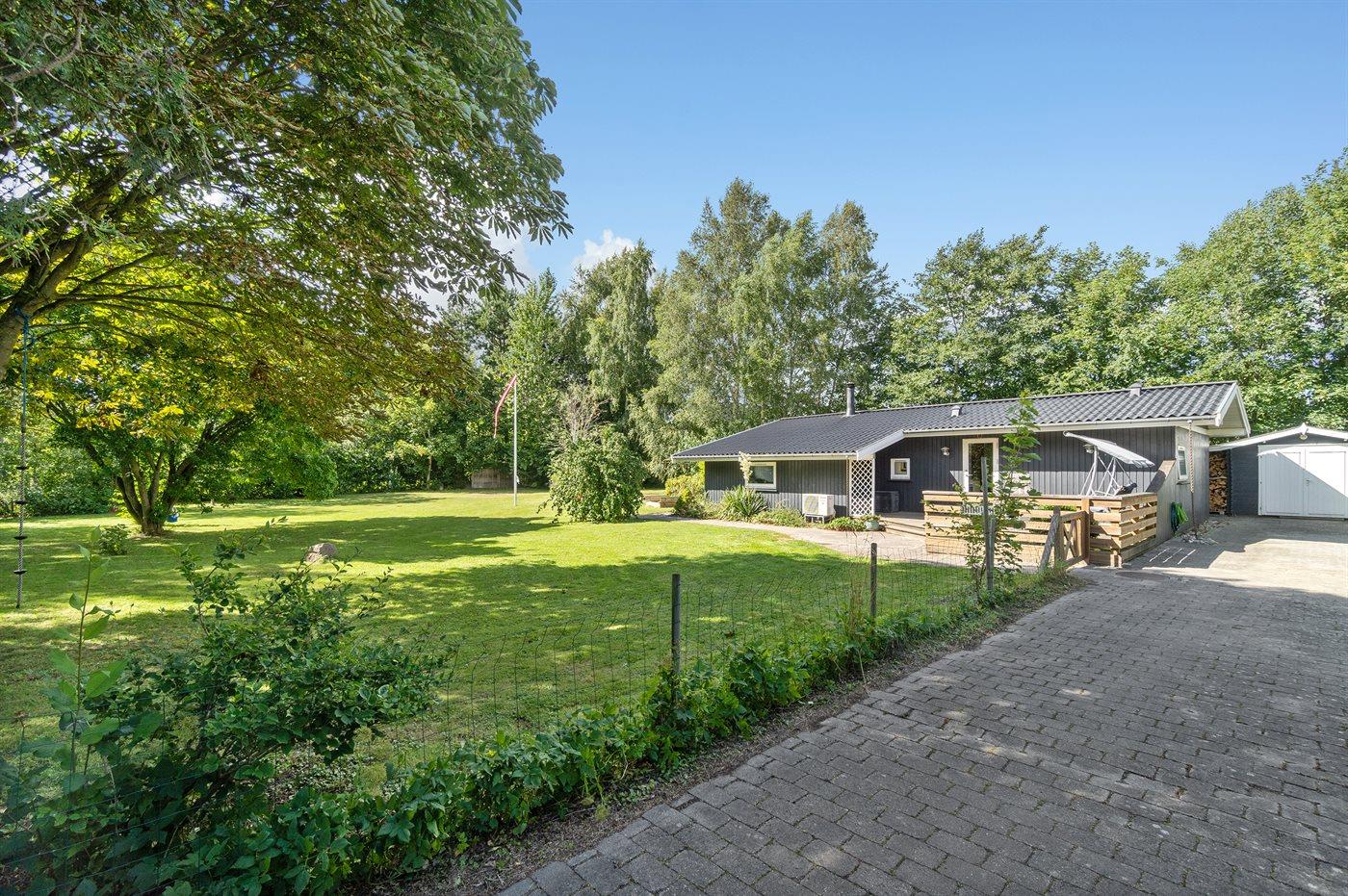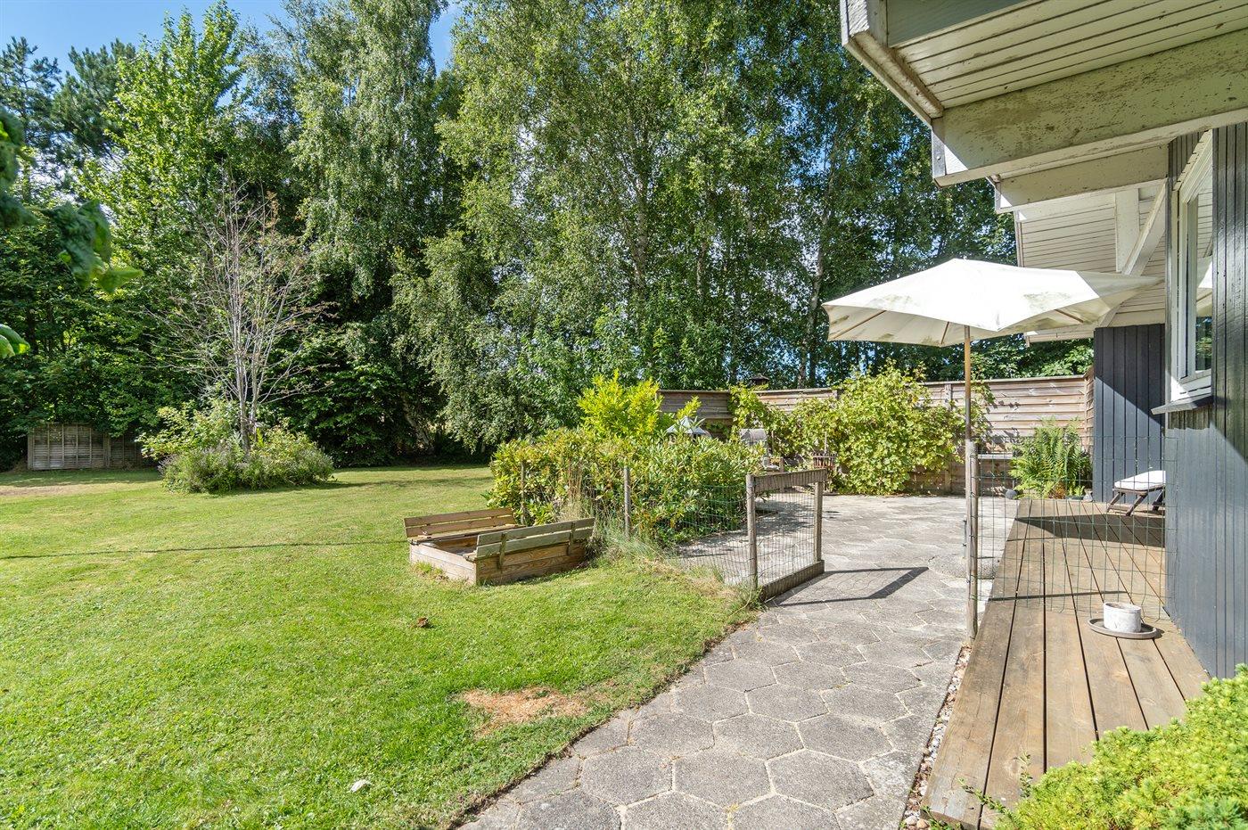 Huset er beliggende på en stor grund med græsplæne og med rig mulighed for leg og boldspil. Køkkenet er i åben forbindelse med stuen og spisepladsen, og herfra er der udgang til 2 træterrasser, hvor den ene er delvist overdækket. Der er 3 soveværelser og et badeværelse med bruseniche og en kombimodel vaskemaskine/tørretumbler.