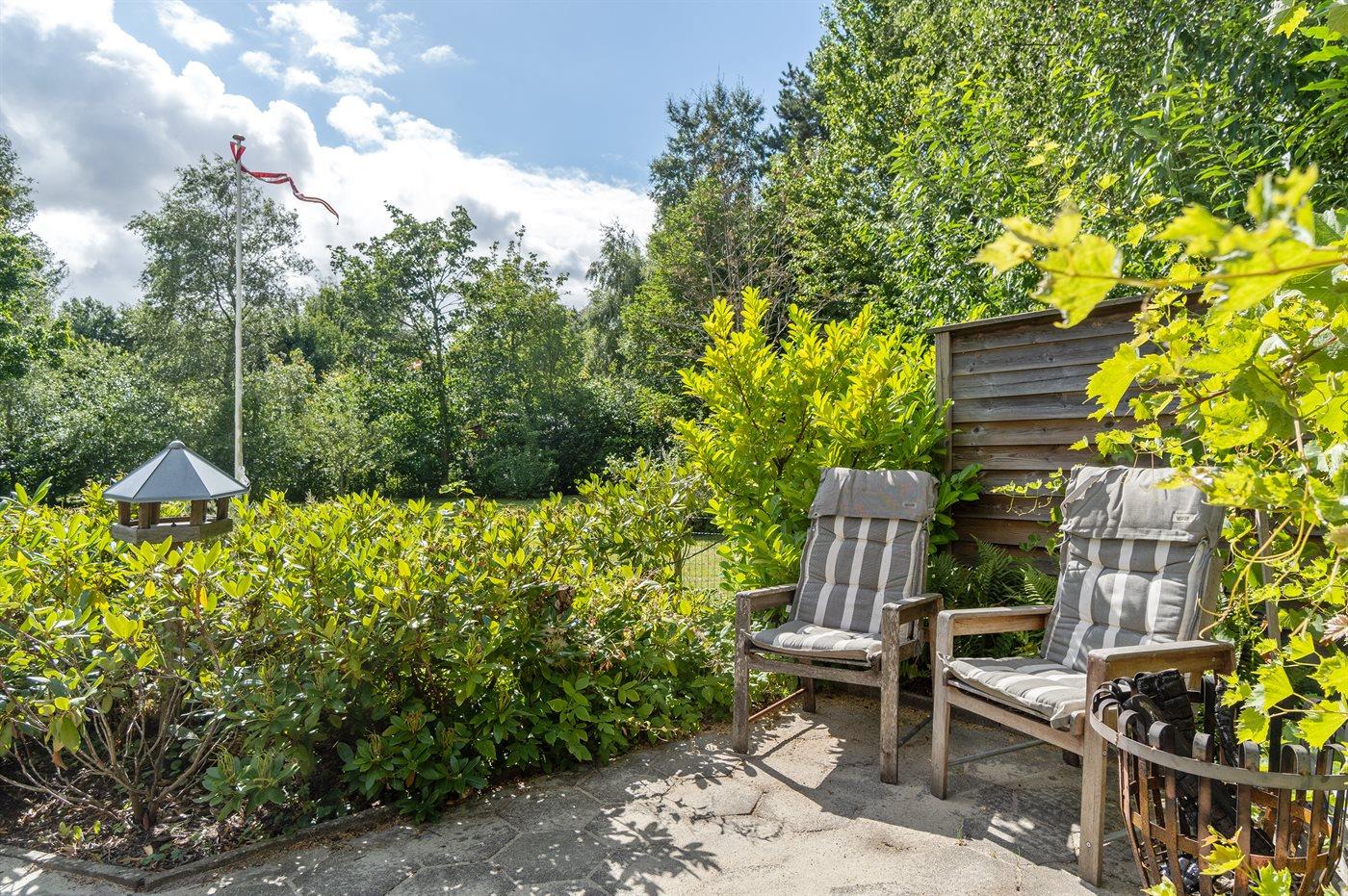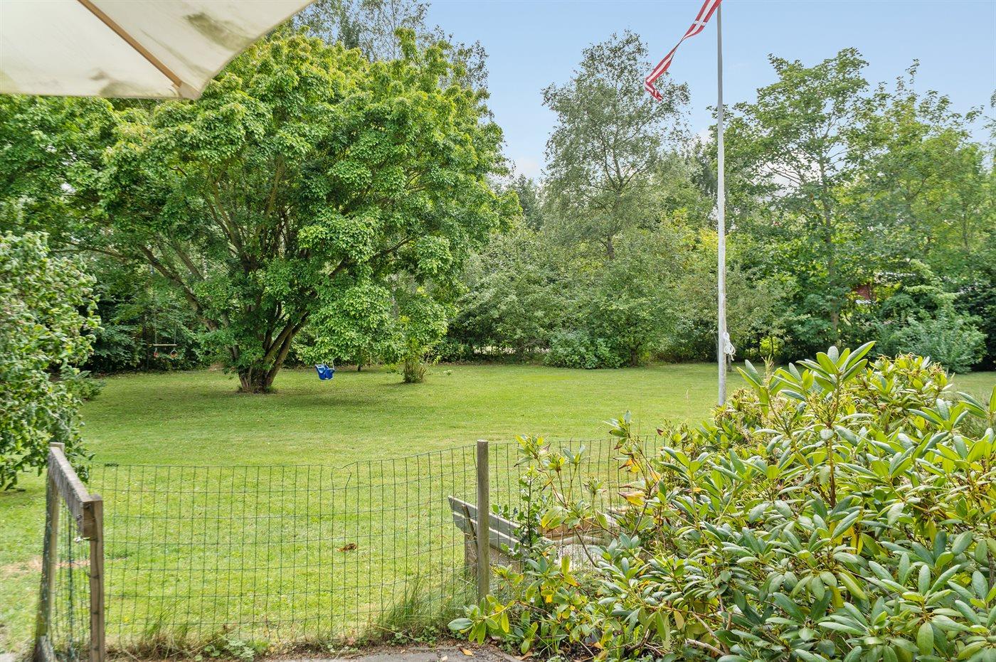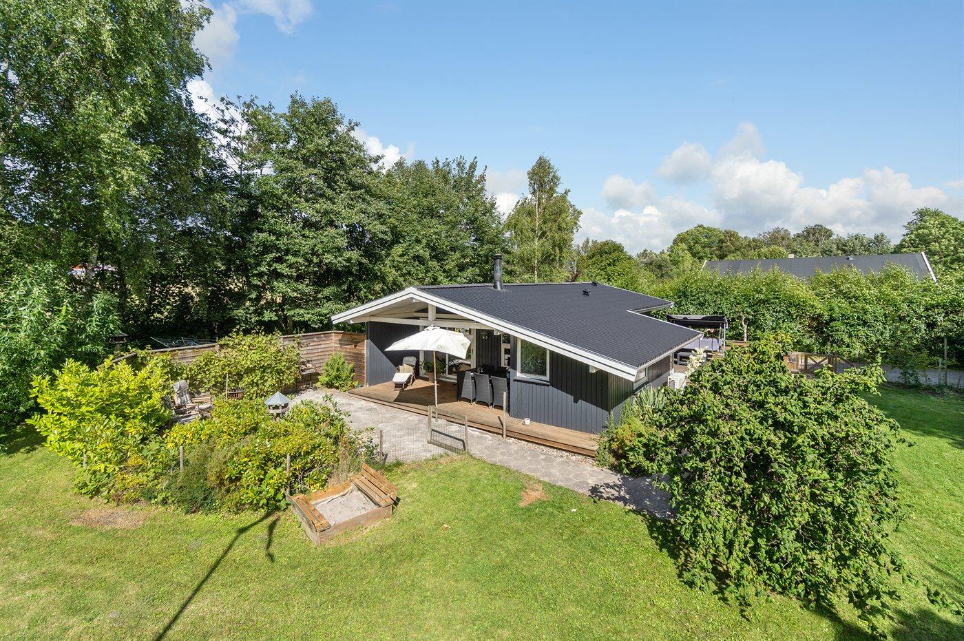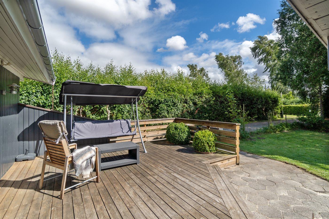 Huset er beliggende på en stor grund med græsplæne og med rig mulighed for leg og boldspil. Køkkenet er i åben forbindelse med stuen og spisepladsen, og herfra er der udgang til 2 træterrasser, hvor den ene er delvist overdækket. Der er 3 soveværelser og et badeværelse med bruseniche og en kombimodel vaskemaskine/tørretumbler.