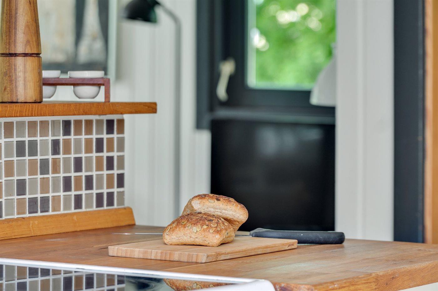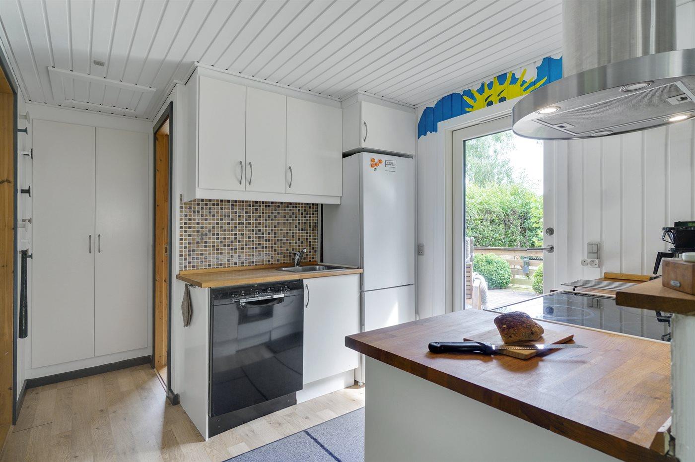 Køkkenet er udstyret med 1 køleskab. Der er 4 keramiske kogeplader, varmluftovn, mikrobølgeovn samt opvaskemaskine.