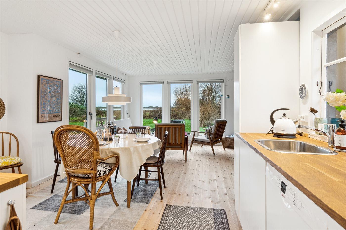 Huset er lyst og sommerligt indrettet med et moderne køkken, som ligger i åben forbindelse med spiseplads og stue, hvorfra der er udgang til den syd- og vestvendte terrasse, hvor solen og den flotte solnedgang kan nydes.