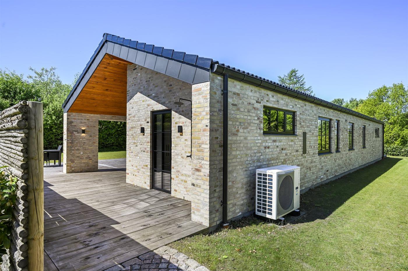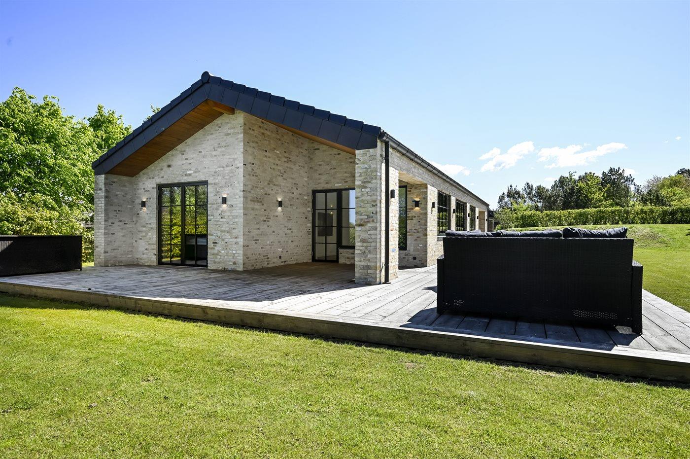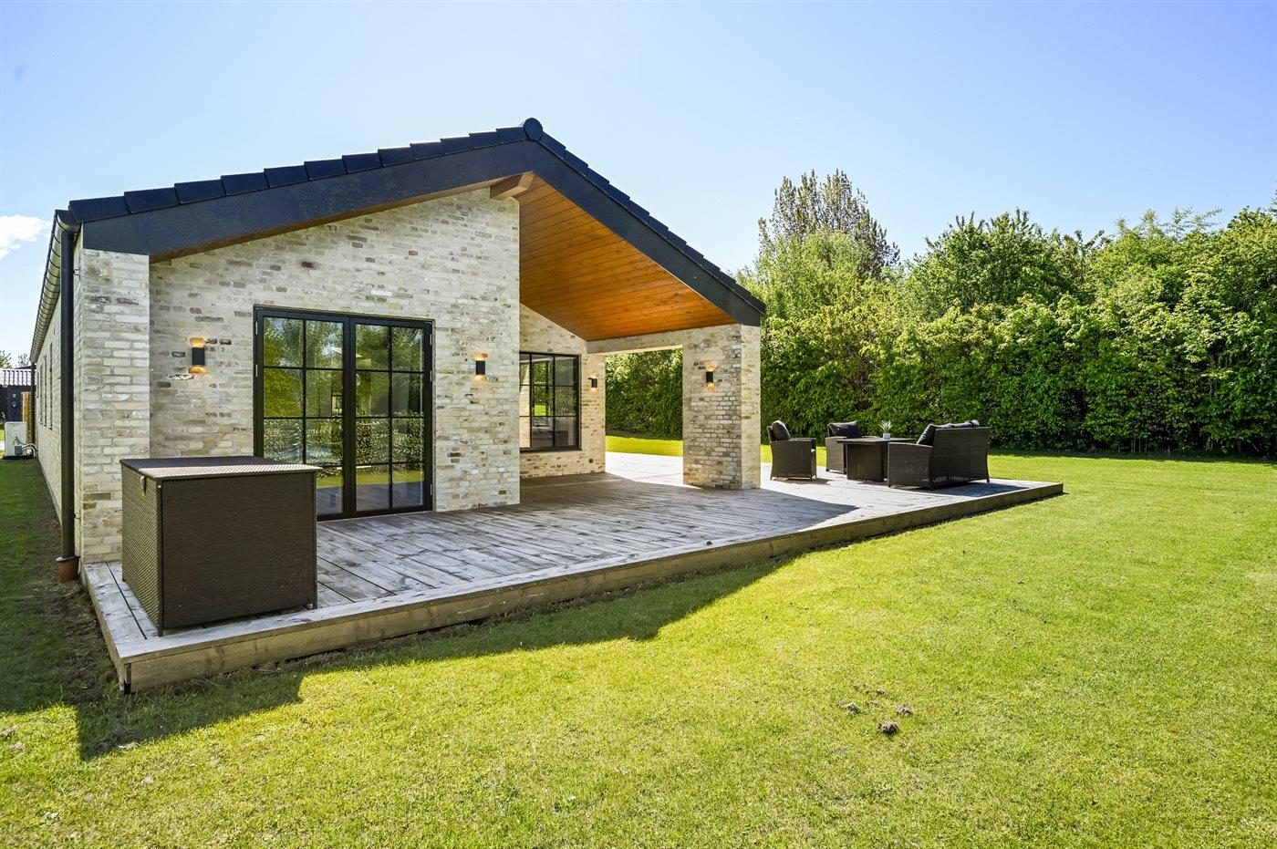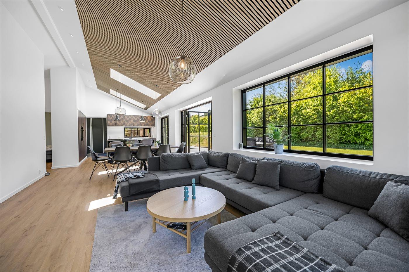 Husets naturlige samlingssted er det store lyse køkkenalrum i åben forbindelse med stuen og med udgange til det store terrasseområde med gode overdækkede arealer, hvor det både er muligt at nyde solen og finde skygge og læ. Huset er overalt opført i kvalitetsmaterialer, og med loft-til-kip og masser af lysindfald fra de store vinduespartier og ovenlysvinduer er huset en sand fornøjelse at opholde sig i.