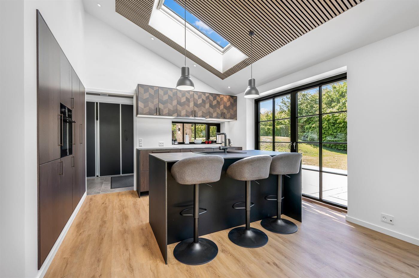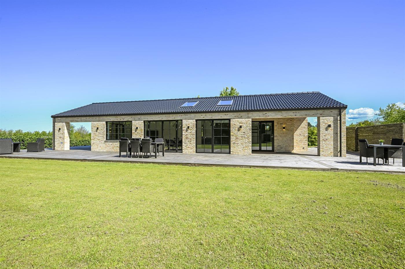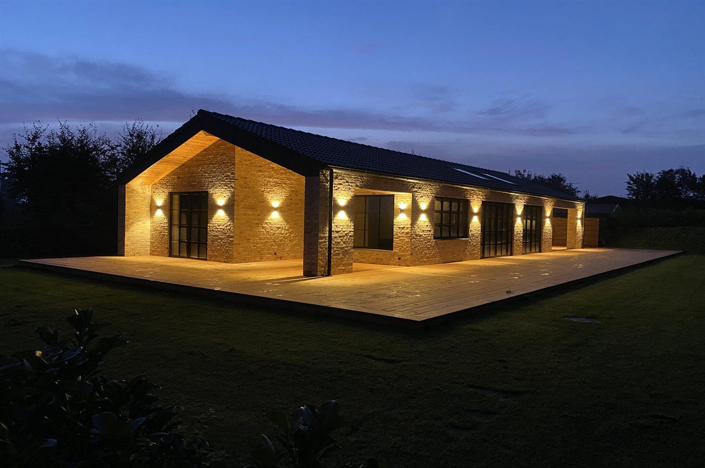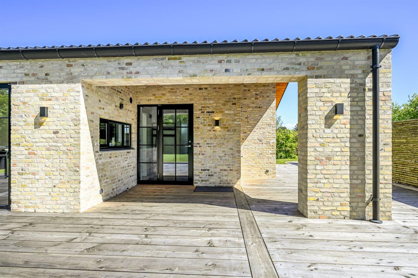 Husets naturlige samlingssted er det store lyse køkkenalrum i åben forbindelse med stuen og med udgange til det store terrasseområde med gode overdækkede arealer, hvor det både er muligt at nyde solen og finde skygge og læ. Huset er overalt opført i kvalitetsmaterialer, og med loft-til-kip og masser af lysindfald fra de store vinduespartier og ovenlysvinduer er huset en sand fornøjelse at opholde sig i.