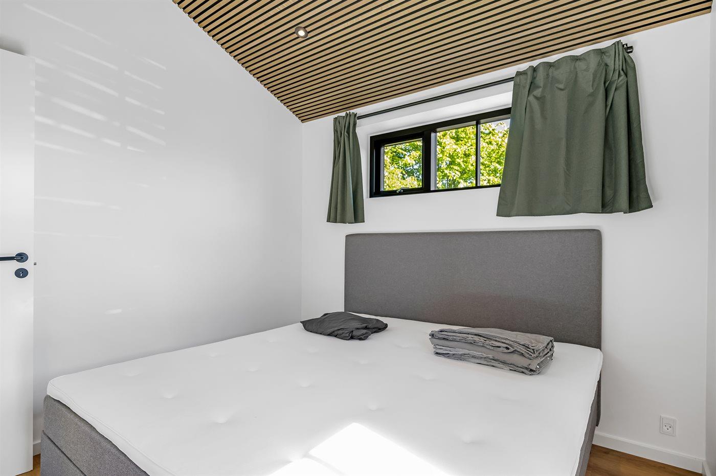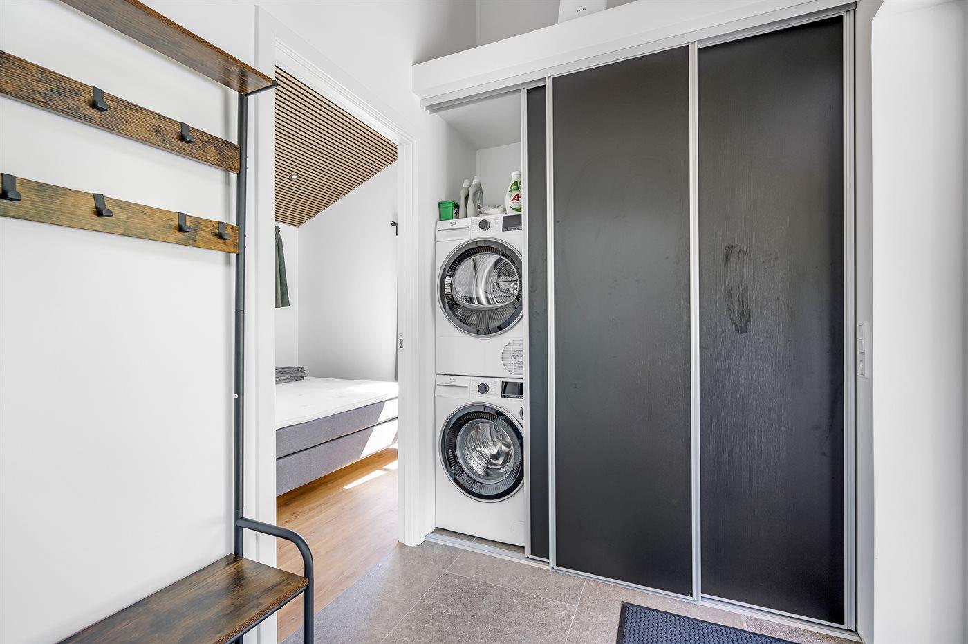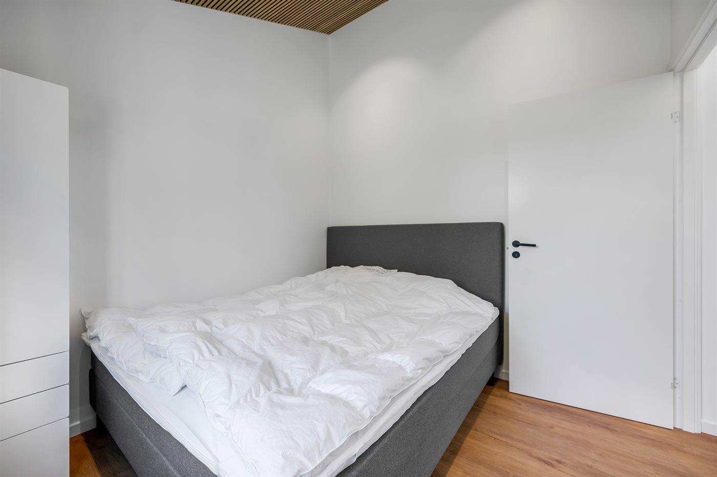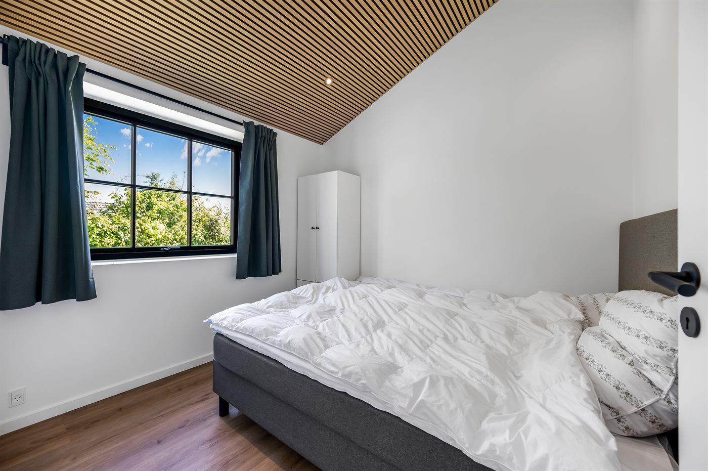 Der er 4 soveværelser med hver 2 sovepladser i dobbeltsenge. Fra alle soveværelser er der terrassedøre med nem adgang til den udendørs bruser. Der er 2 badeværelser med bruseniche og gulvvarme. I det største badeværelse er der spa og sauna. I entreen er der vaskemaskine og tørretumbler.