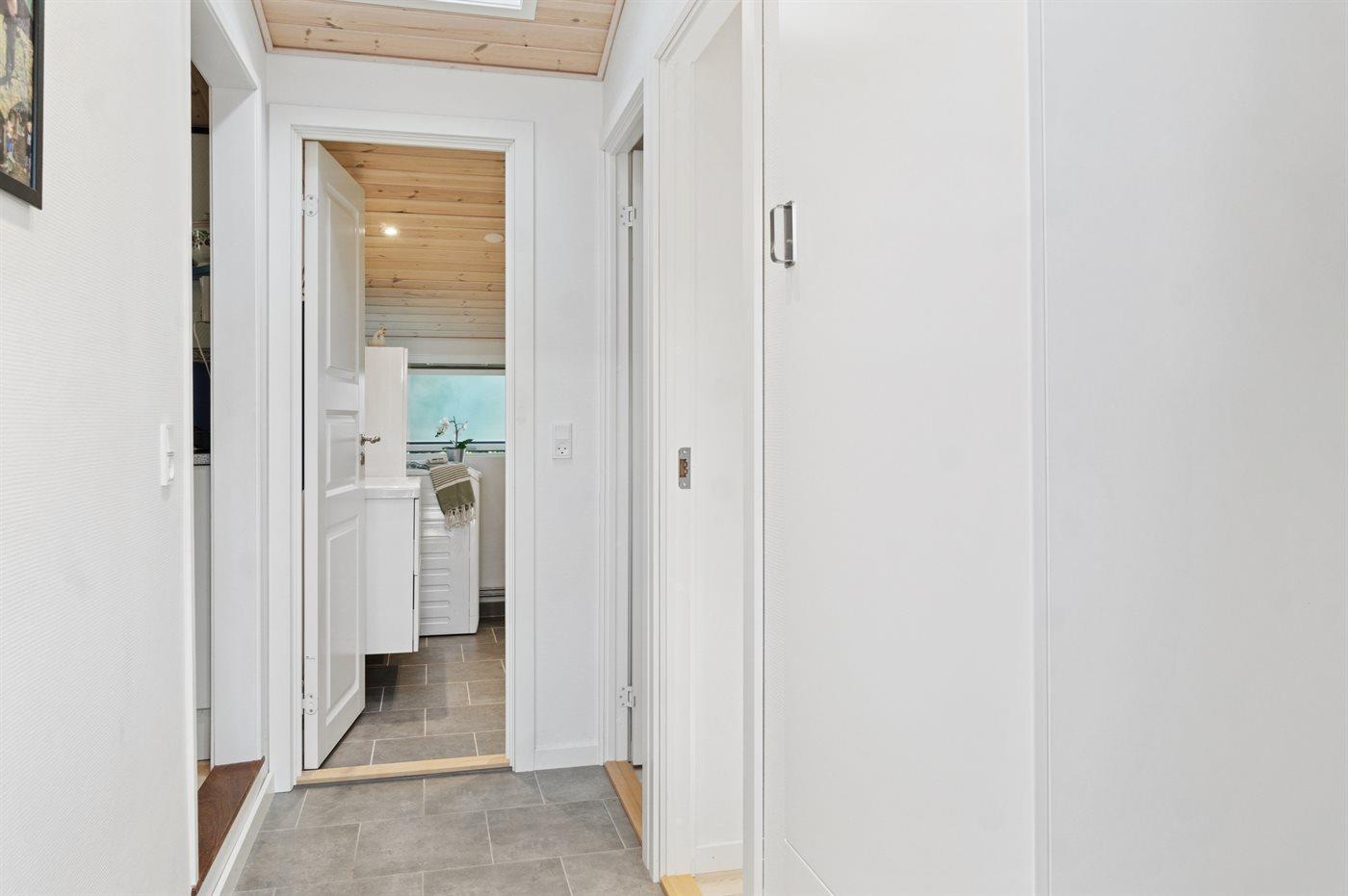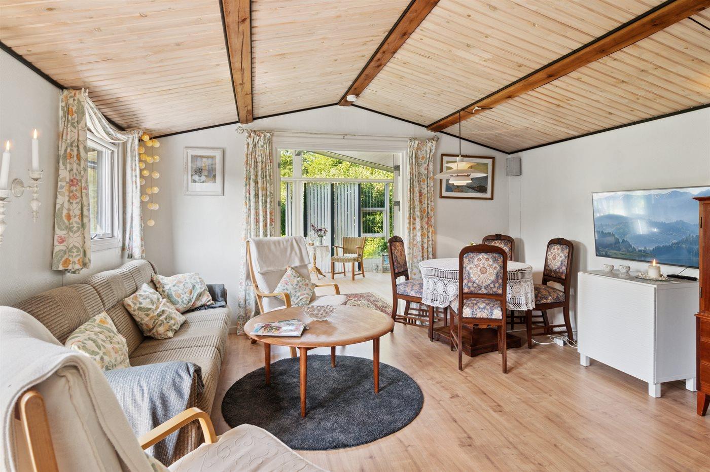 Indenfor giver den store lyse stue og spisestue rig mulighed for at være sammen og hygge sig med venner og familie. Køkkenet er af ældre dato, men funktionelt. Der findes 3 soveværelser; 1 med dobbeltseng, 1 med 2 enkeltsenge og 1 med dobbelt sovesofa. I husets anneks er der yderligere 2 sovepladser i dobbeltseng. Det moderne badeværelse er med bruseniche, gulvvarme og der findes en vaskemaskine.