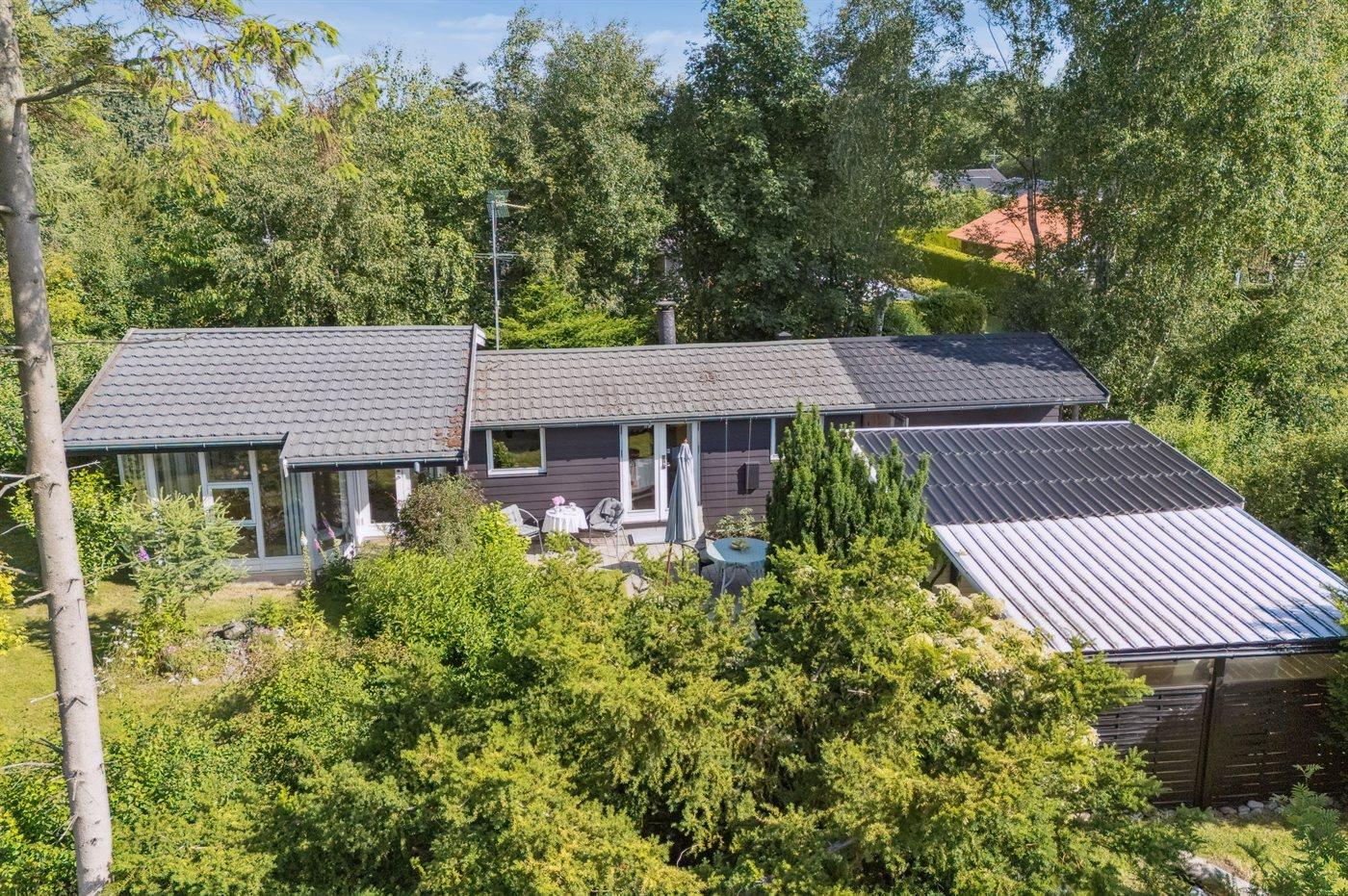 Huset er beliggende i et roligt sommerhusområde og ligger fredeligt og ugenert for enden af en blind vej. Børn og kæledyr kan derfor færdes helt sikkert.