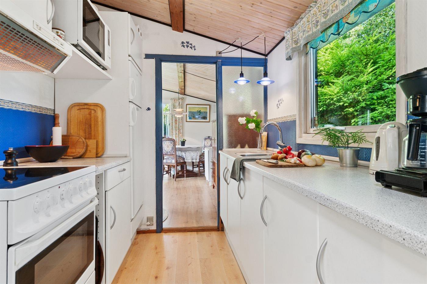 Køkkenet er udstyret med 1 køleskab. Der er 4 keramiske kogeplader, varmluftovn, mikrobølgeovn samt opvaskemaskine.