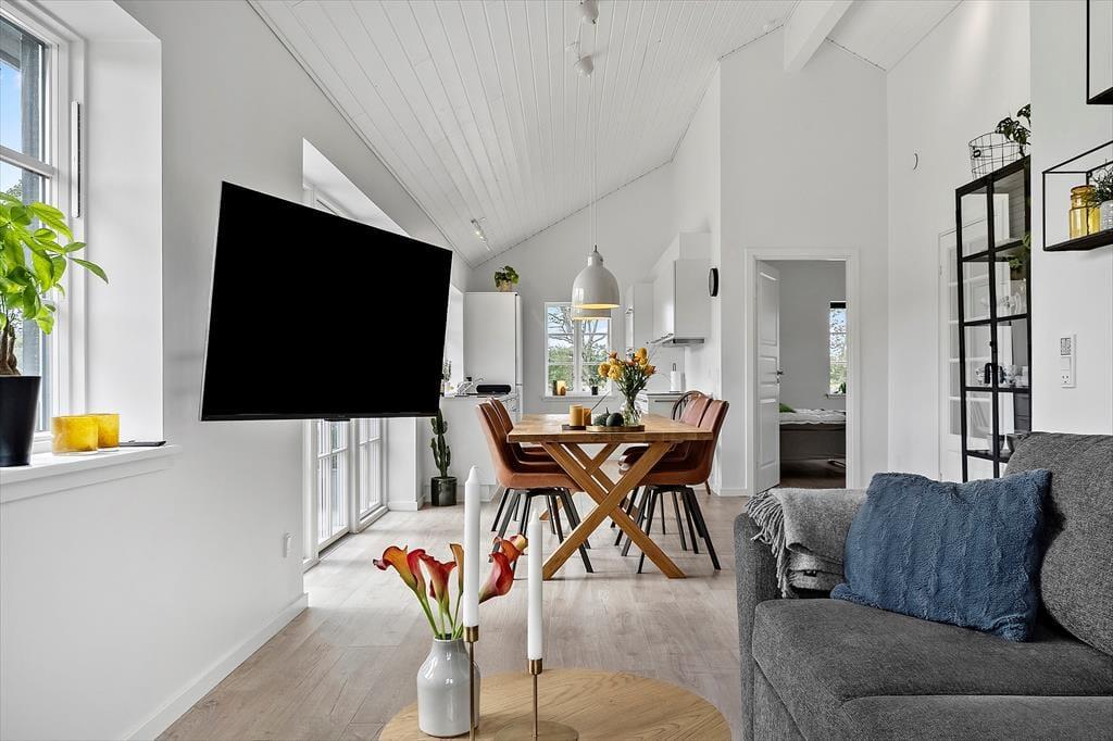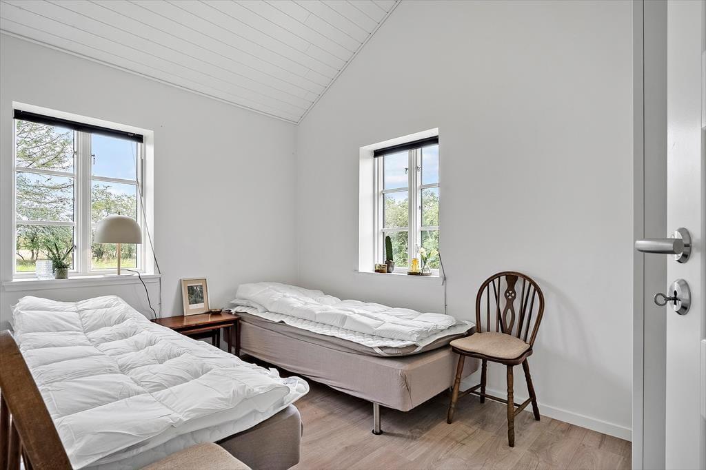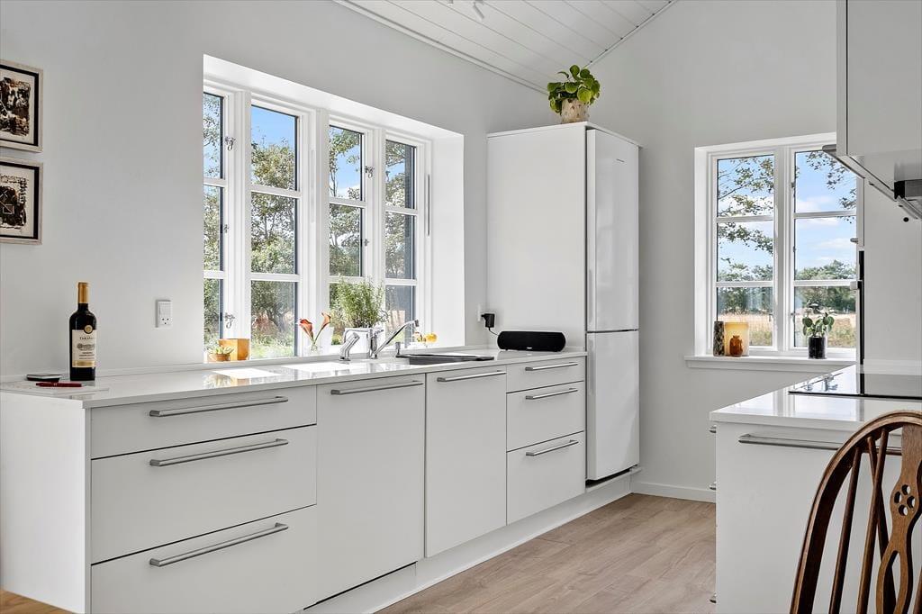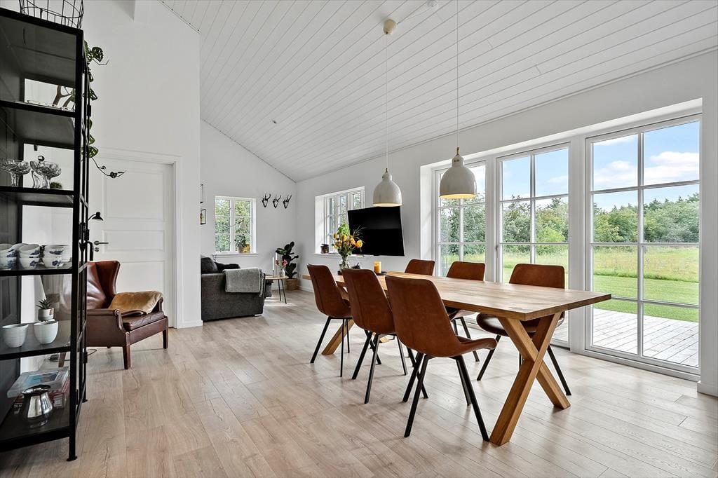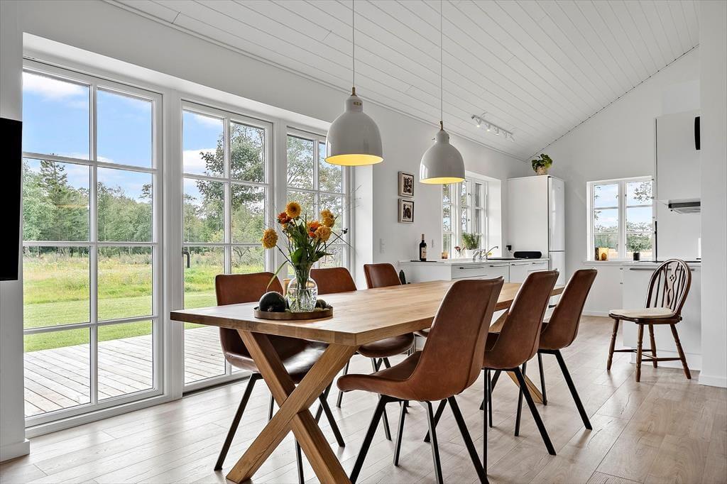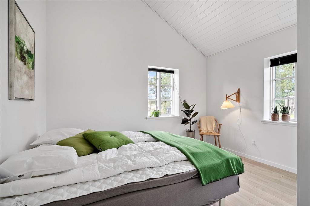 Indenfor byder det nybyggede sommerhus fra 2025 på en indretning, der hurtigt får skuldrene til at sænke sig. Det store køkkenalrum og stue i ét inviterer til lange middage, brætspil ved spisebordet og afslappede aftener i sofaen – alt imens I nyder udsigten til de smukke omgivelser gennem store vinduespartier. De to rummelige soveværelser med god skabsplads giver plads til ro og restitution efter en dag fyldt med gode ferieoplevelser. Vi er vilde med, hvordan lyset strømmer ind i rummene og binder naturen udenfor sammen med den hyggelige atmosfære indenfor.