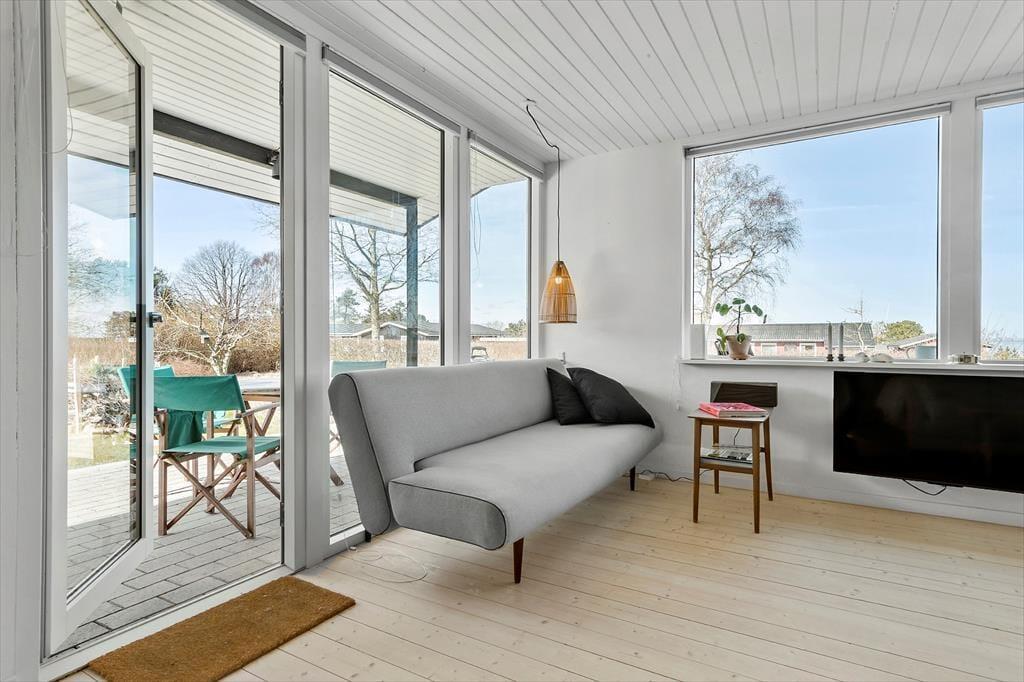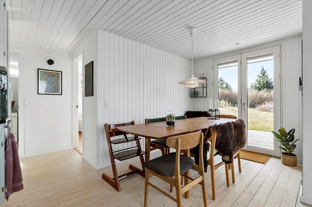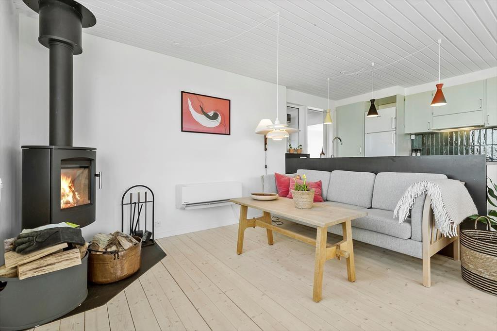 Stuen er husets hjerte – lys og rummelig med god plads til fælles feriehygge. Brændeovnen står klar til at sprede varme og stemning, når dagen går på hæld, og dobbeltdørene åbner op til terrassen, hvor du kan nyde udsigten til havet og lade blikket vandre mod horisonten.