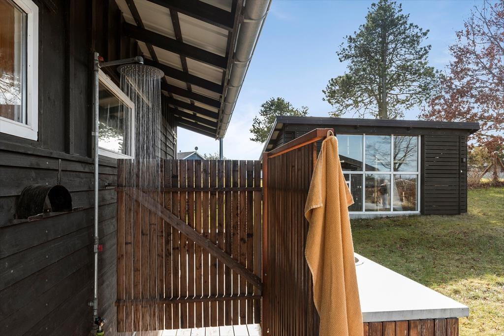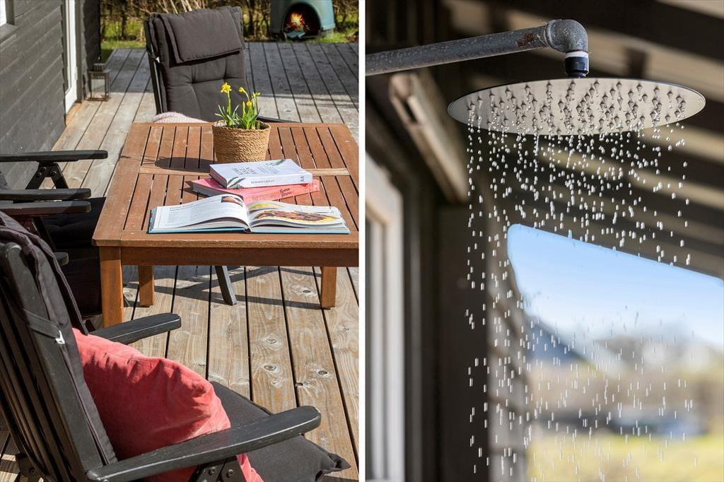 Og som prikken over i’et ligger saunaen i et hyggeligt anneks – et skønt sted at varme sig efter en dukkert eller en lang dag med oplevelser. Til de solrige dage venter en skøn udebruser, der gør det ekstra sjovt og sommerligt at blive frisket op i det fri.