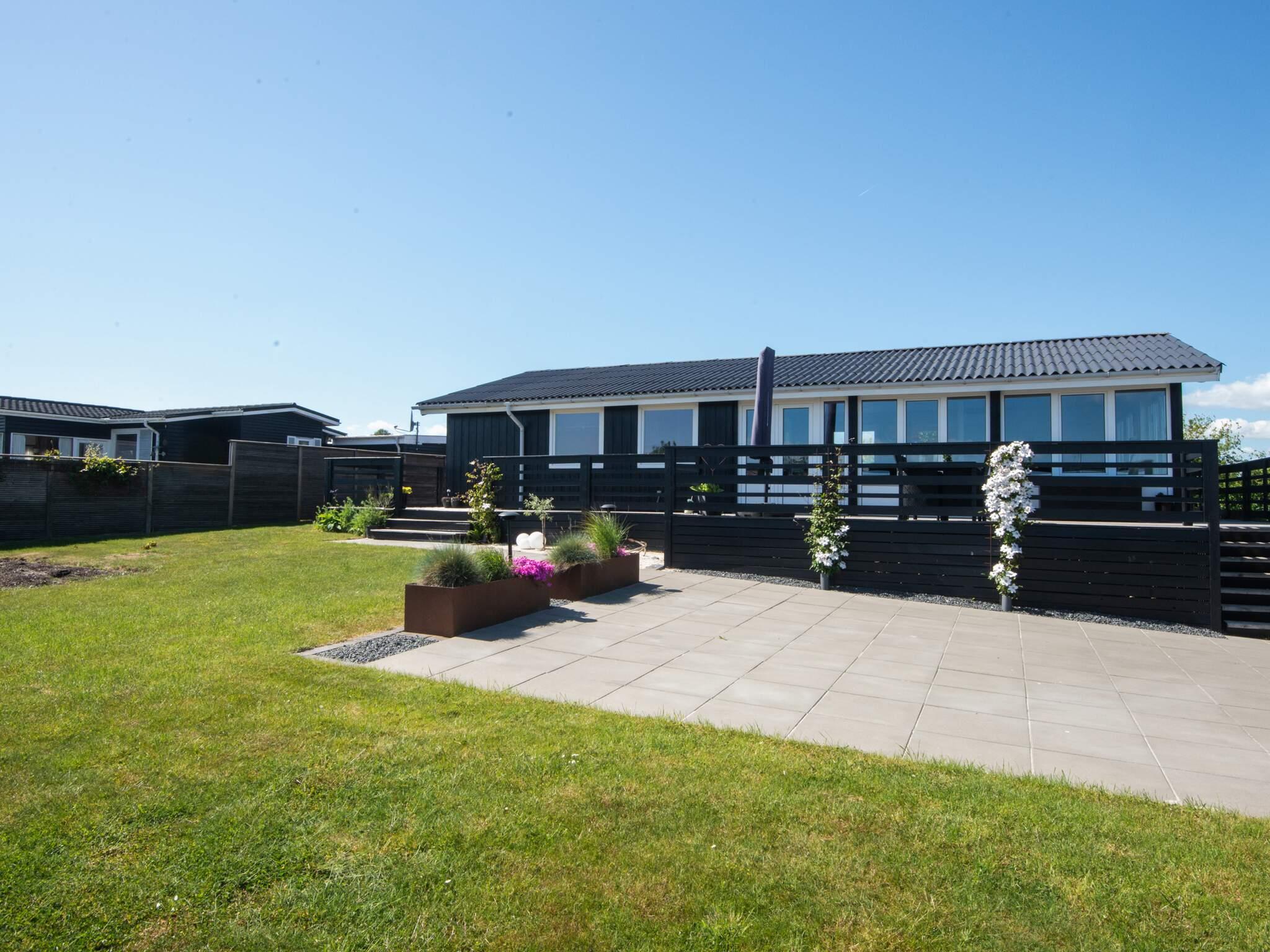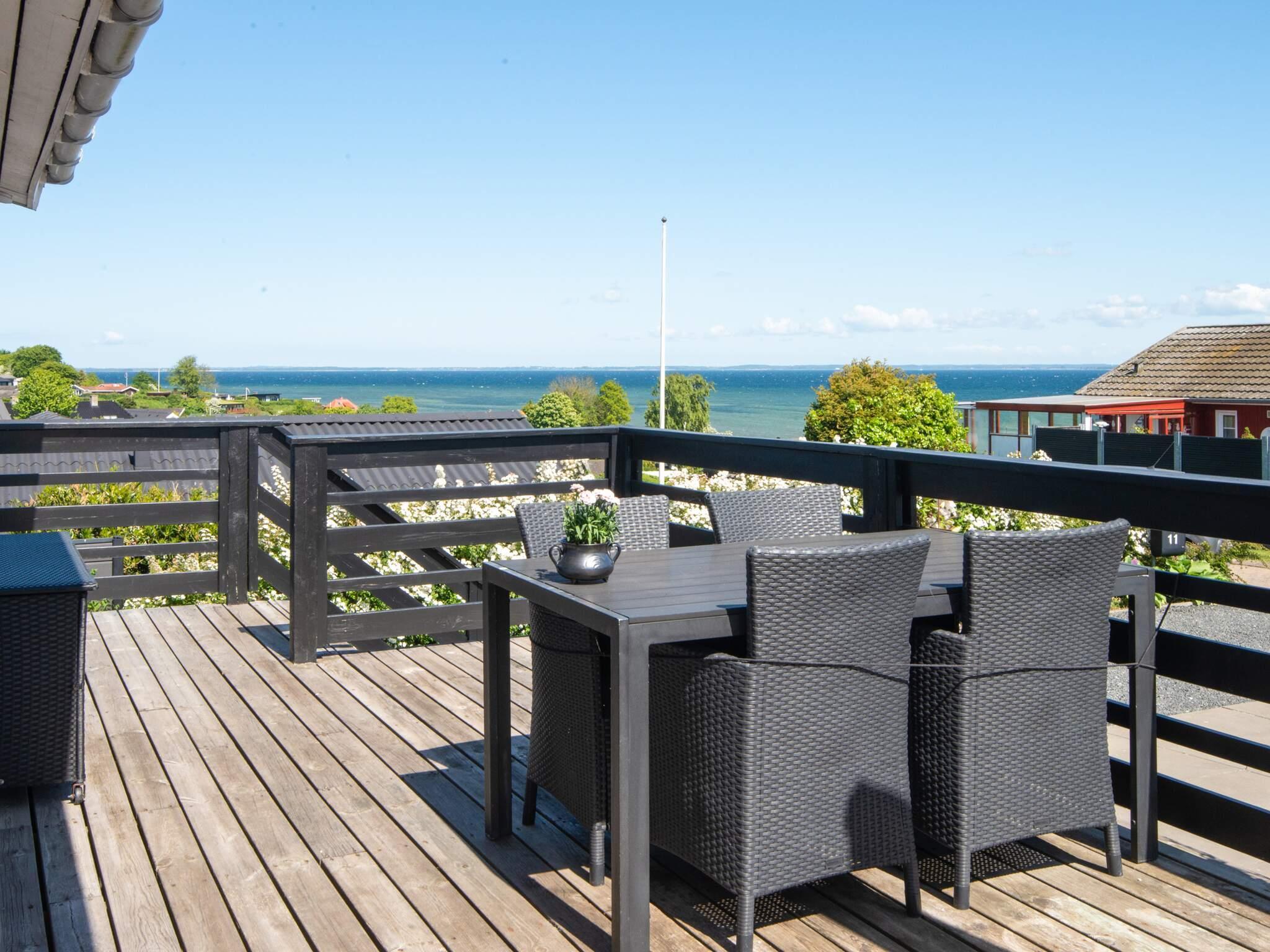 Udenfor finder du de store træterrasser, hvor du kan nyde solen og udsigten hele dagen. Træterrassen strækker sig hele vejen rundt om huset. Der er flere sæt havemøbler, og på terrassen mod vest er huset udstyret med en elektrisk markise og mod øst med en stor parasol. Den store plads på terrassen betyder, at der er plads til alle aktiviteter såsom leg, grillmad og et køligt glas vin om aftenen. Huset ligger i kort afstand fra den børnevenlige strand og Hejlsminde Havn. Ikke tilgængeligt for håndværkere og ungdomsgrupper.