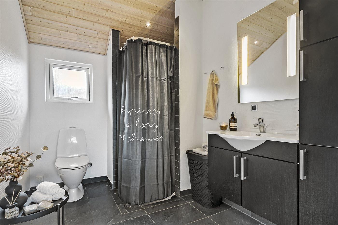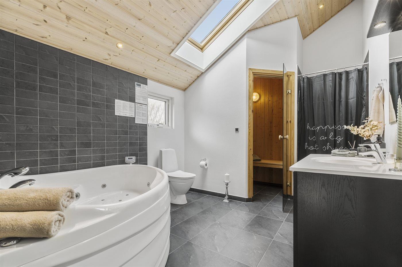 Huset har 2 flotte badeværelser med bruseniche og toilet samt god skabsplads. På det ene er der desuden dejligt 2 personers spa og i forlængelse heraf skøn sauna. Der er gulvvarme på badeværelserne.
