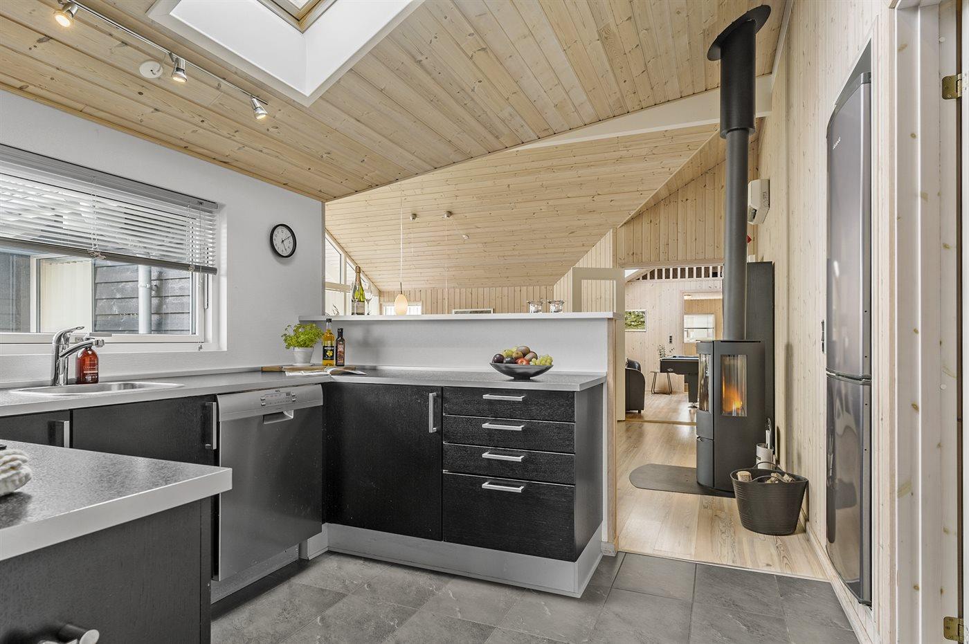 Køkkenet er udstyret med 1 køleskab. Der er 4 induktionskogeplader, varmluftovn, mikrobølgeovn samt opvaskemaskine.