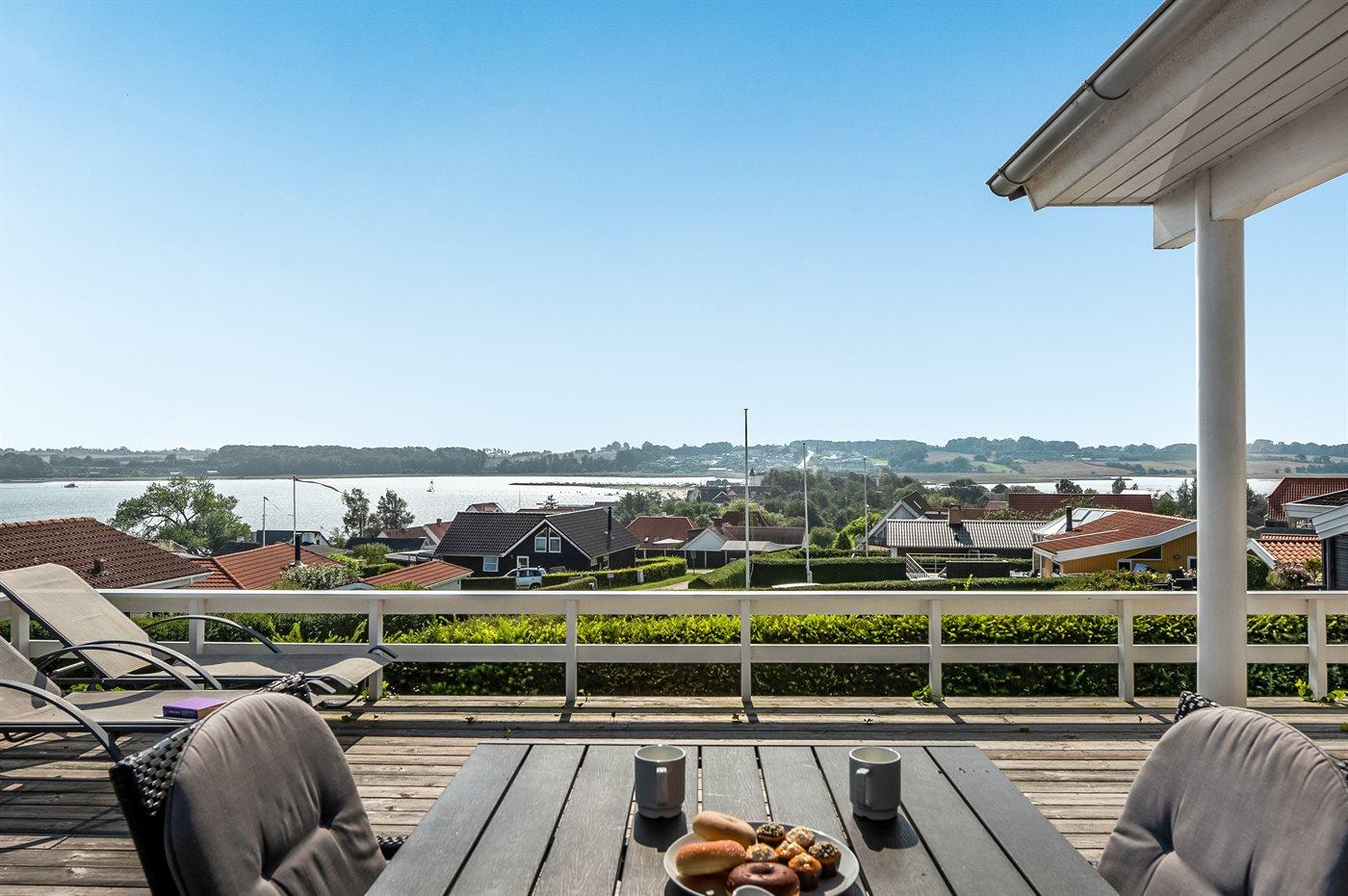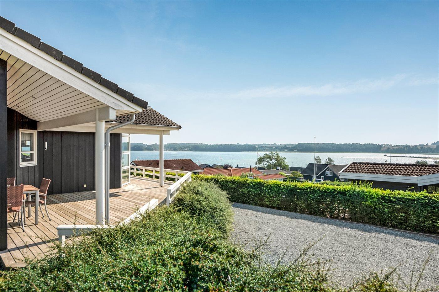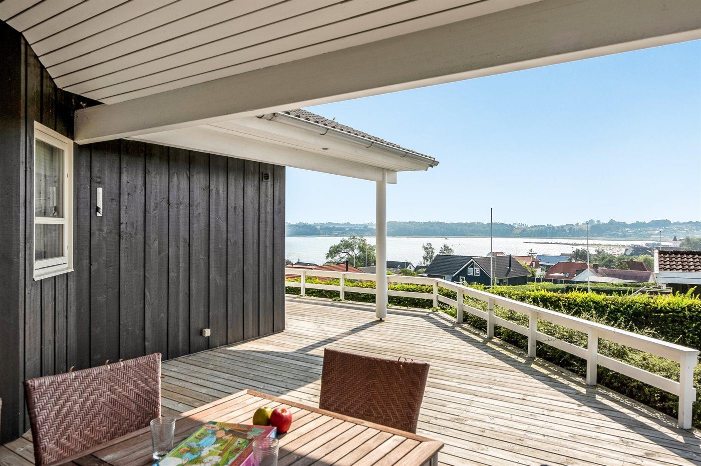 Arkitekttegnet sommerhus i Hejlsminde med panoramaudsigt over Lillebælt og lystbådehavnen.
