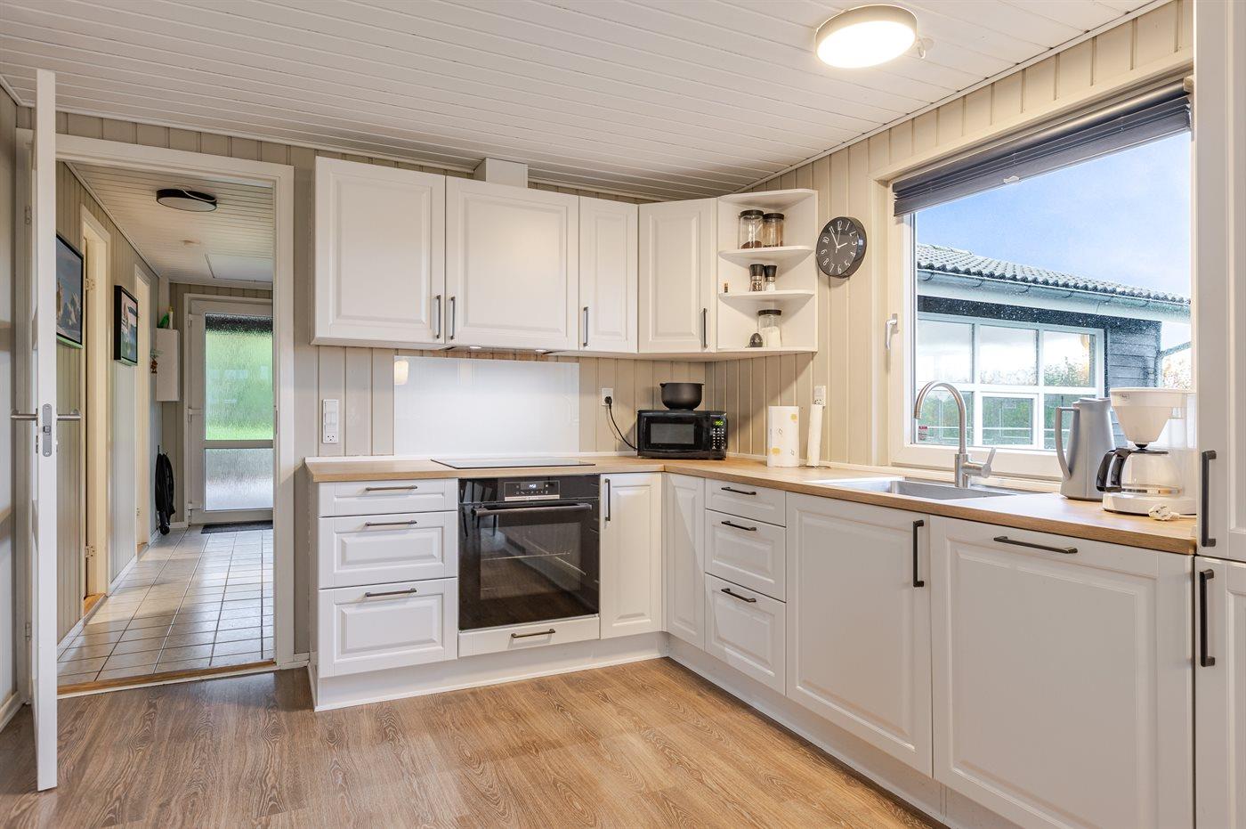 Køkkenet er udstyret med 1 køleskab. Der er 4 keramiske kogeplader, varmluftovn, mikrobølgeovn samt opvaskemaskine.