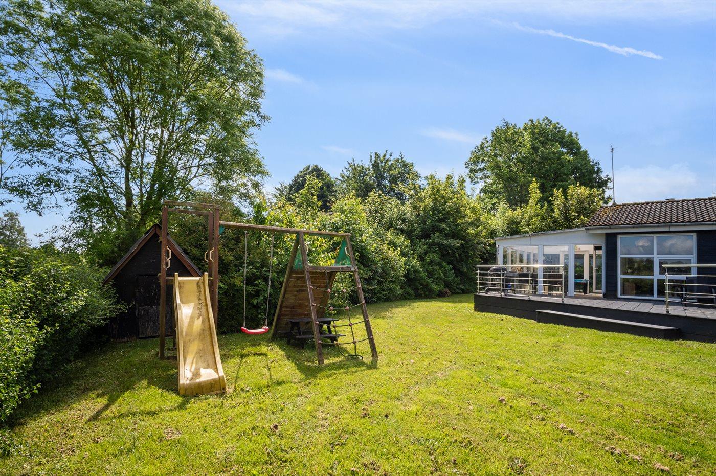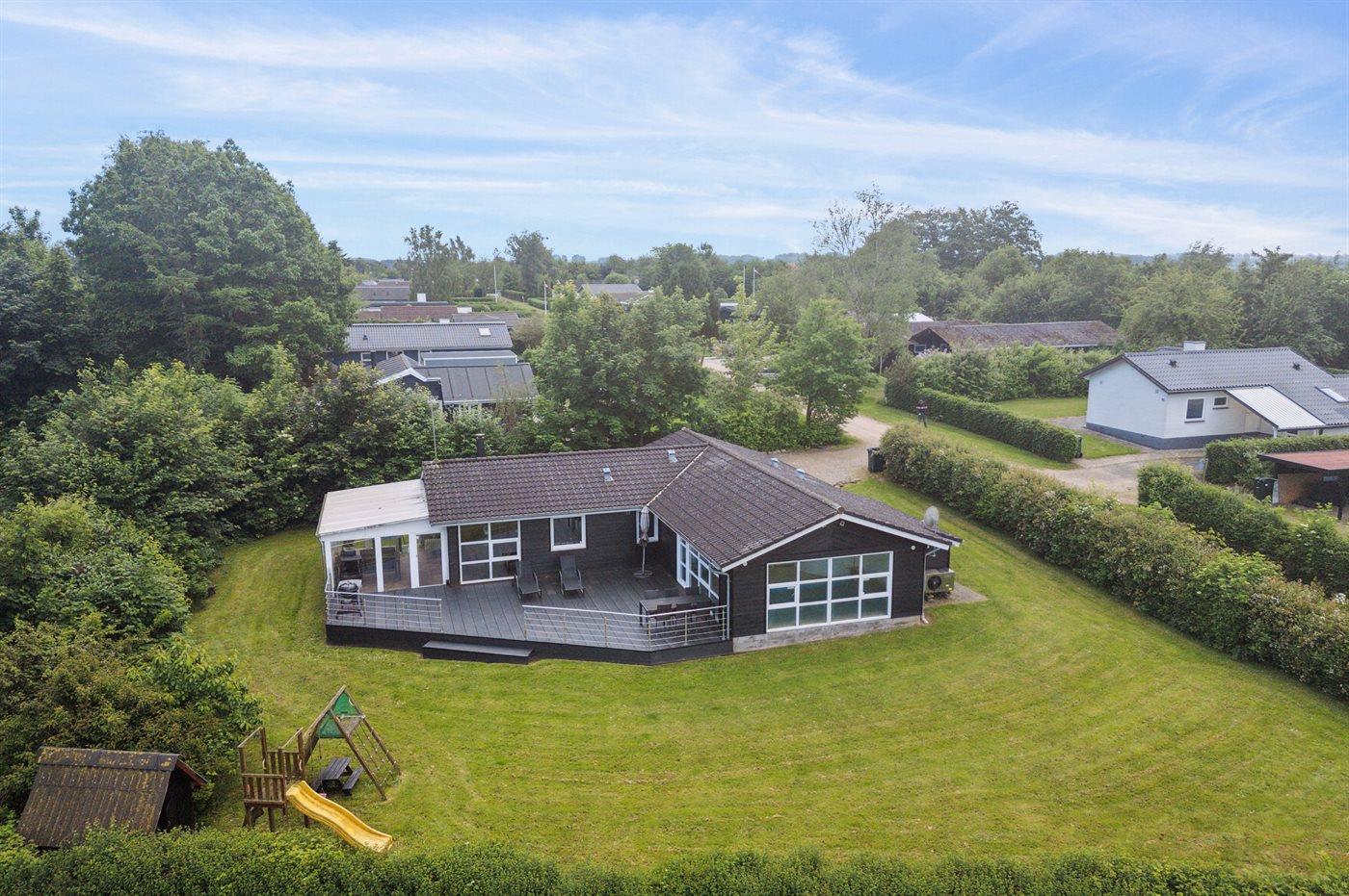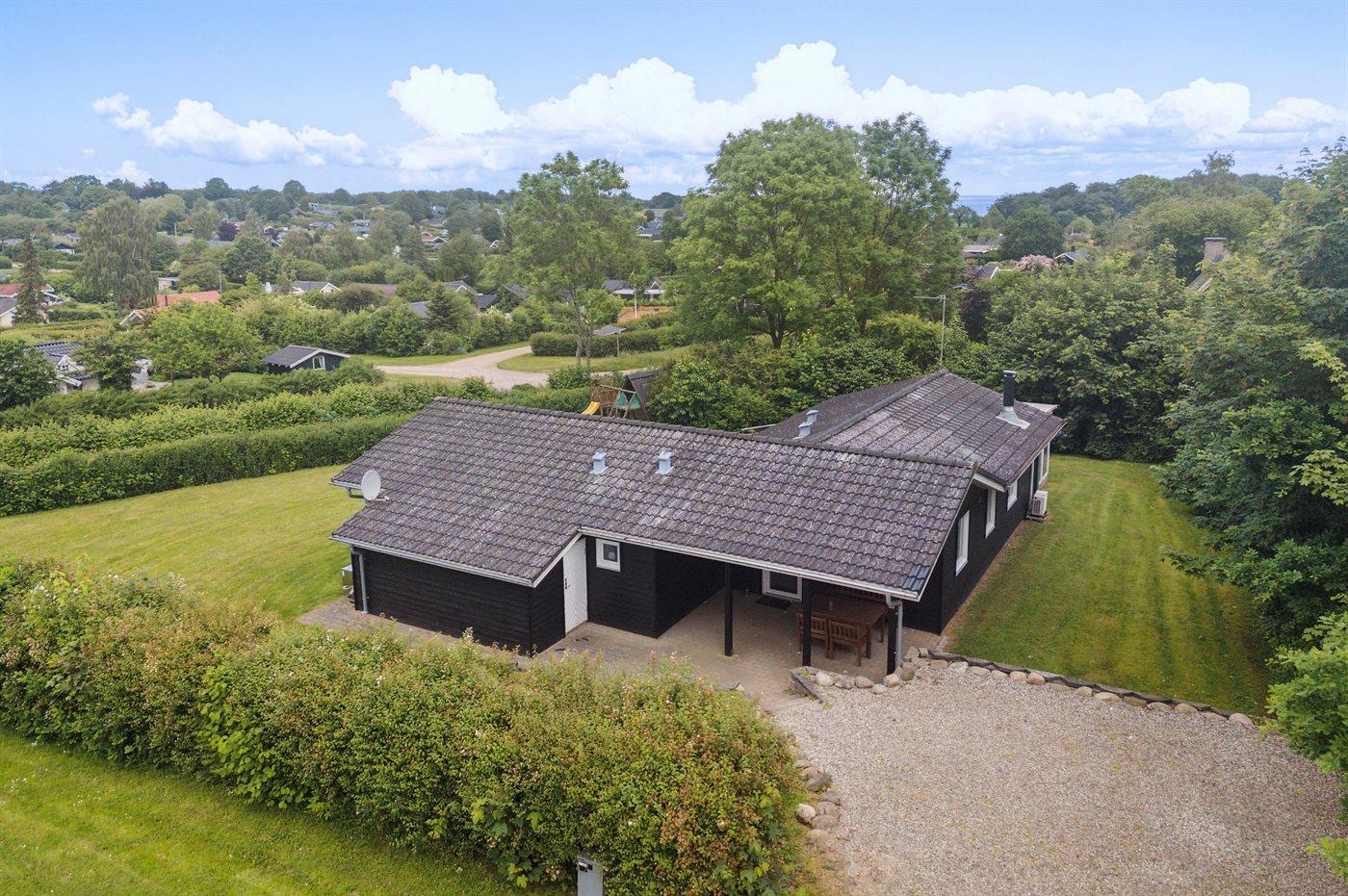 Ferieboligen er beliggende på en 1015 m² stor havegrund. Der er 950 m til havet. Nærmeste forretning er beliggende i en afstand af 1800 m. Til ferieboligen hører 40 m² terrasseareal. Desuden er der 10 m² overdækket terrasse. Ligeledes er der adgang til udestue. Gynge. Legetårn. Rutchebane. Der er installeret stik til opladning af elbil. Type 2 stik. Med 22 kW ladeeffekt. Parkering ved ferieboligen.